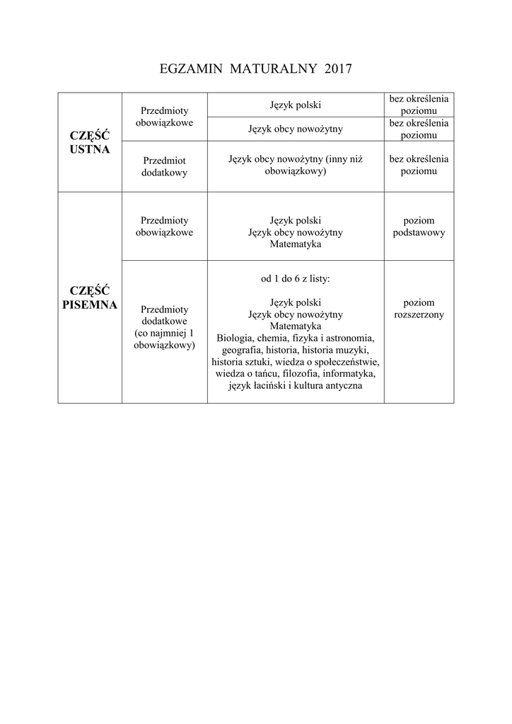 EGZAMIN MATURALNY 2017 Przedmioty obowiązkowe CZĘŚĆ USTNA Język polski Język obcy nowoŜytny bez określenia poziomu bez określenia poziomu Przedmiot dodatkowy Język obcy nowoŜytny (inny niŜ obowiązkowy) bez określenia poziomu Przedmioty obowiązkowe Język polski Język obcy nowoŜytny Matematyka poziom podstawowy od 1 do 6 z listy: CZĘŚĆ PISEMNA Przedmioty dodatkowe (co najmniej 1 obowiązkowy) Język polski Język obcy nowoŜytny Matematyka Biologia, chemia, fizyka i astronomia, geografia, historia, historia muzyki, historia sztuki, wiedza o społeczeństwie, wiedza o tańcu, filozofia, informatyka, język łaciński i kultura antyczna poziom rozszerzony • • • • • • • • • • • • • • • • Wybór przedmiotu maturalnego nie zaleŜy od planu nauczania danej szkoły. Laureaci i finaliści olimpiad przedmiotowych są zwolnieni z egzaminu z danego przedmiotu. Certyfikaty językowe nie zwalniają z egzaminu z języka obcego. Informatory maturalne ogłaszane są do l września roku szkolnego poprzedzającego rok szkolny, w którym jest egzamin. W czasie egzaminu nie wolno korzystać z urządzeń telekomunikacyjnych. Na egzaminie pisemnym z języka polskiego moŜna korzystać ze słownika ortograficznego oraz ze słownika poprawnej polszczyzny. Na egzaminie z języka mniejszości narodowej moŜna korzystać ze słowników językowych. Na egzaminie z języka obcego nie moŜna korzystać z Ŝadnych słowników. Dopuszcza się korzystanie z pomocy ogłoszonych na stronie internetowej CKE na 2 miesiące przed egzaminem. Na podstawie opinii, orzeczenia moŜna dostosować warunki i formę egzaminu do moŜliwości mówienia, pisania i poruszania się zdającego. Niesamodzielność pracy w czasie egzaminu moŜe skutkować uniewaŜnieniem egzaminu. Warunkiem zdania egzaminu jest uzyskanie z przedmiotów obowiązkowych na poziomie podstawowym minimum 30% punktów moŜliwych do zdobycia. Warunkiem zadania egzaminu jest równieŜ przystąpienie do co najmniej 1 egzaminu dodatkowego na poziomie rozszerzonym. Dla tego egzaminu nie ustala się progu zdawalności. Osoby, które nie zdobyły 30% punktów moŜliwych do zdobycia z jednego z egzaminów obowiązkowych mogą przystąpić do tego egzaminu w sesji poprawkowej w sierpniu. Wynik egzaminu moŜna poprawić w kolejnych sesjach przez 5 lat od daty pierwszego egzaminu. Absolwenci, którzy przystąpili do egzaminu po raz trzeci i kolejny wnoszą opłatę ustaloną przez Dyrektora CKE. To, czy matura jest zdana, zaleŜy wyłącznie od wyników egzaminów z przedmiotów obowiązkowych na poziomie podstawowym. Wyniki egzaminu z przedmiotów dodatkowych nie mają wpływu na zdanie egzaminu maturalnego. Wynik egzaminu maturalnego jest waŜnym elementem rekrutacji na studia wyŜsze. Okręgowa Komisja Egzaminacyjna w Jaworznie