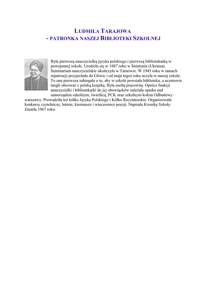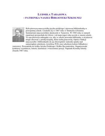 LUDMIŁA TARAJOWA - PATRONKA NASZEJ BIBLIOTEKI SZKOLNEJ Była pierwszą nauczycielką języka polskiego i pierwszą bibliotekarką w powojennej szkole. Urodziła się w 1887 roku w Śniatyniu (Ukraina). Seminarium nauczycielskie ukończyła w Tarnowie. W 1945 roku w ramach repatriacji przyjechała do Gliwic i od maja tegoż roku uczyła w naszej szkole. To ona pierwsza zabiegała o to, aby w szkole powstała biblioteka, a uczniowie mogli obcować z polską książką. Była osobą pracowitą. Oprócz funkcji nauczycielki i bibliotekarki do jej obowiązków należała opieka nad samorządem szkolnym, świetlicą, PCK oraz szkolnym kołem Odbudowy warszawy. Prowadziła też kółko Języka Polskiego i Kółko Recytatorskie. Organizowała konkursy czytelnicze, loterie, kiermasze i wieczornice poezji. Napisała Kronikę Szkoły. Zmarła 1967 roku.