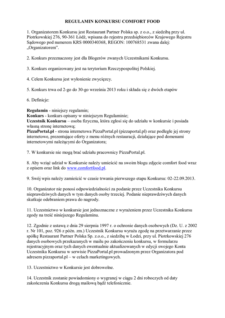 REGULAMIN KONKURSU COMFORT FOOD 1. Organizatorem Konkursu jest Restaurant Partner Polska sp. z o.o., z siedzibą przy ul. Piotrkowskiej 276, 90-361 Łódź, wpisana do rejestru przedsiębiorców Krajowego Rejestru Sądowego pod numerem KRS 0000340368, REGON: 100768531 zwana dalej: „Organizatorem”. 2. Konkurs przeznaczony jest dla Blogerów zwanych Uczestnikami Konkursu. 3. Konkurs organizowany jest na terytorium Rzeczypospolitej Polskiej. 4. Celem Konkursu jest wyłonienie zwycięzcy. 5. Konkurs trwa od 2-go do 30-go września 2013 roku i składa się z dwóch etapów 6. Definicje: Regulamin - niniejszy regulamin; Konkurs - konkurs opisany w niniejszym Regulaminie; Uczestnik Konkursu – osoba fizyczna, która zgłosi się do udziału w konkursie i posiada własną stronę internetową; PizzaPortal.pl - strona internetowa PizzaPortal.pl (pizzaportal.pl) oraz podległe jej strony internetowe, prezentujące oferty z menu różnych restauracji, działające pod domenami internetowymi należącymi do Organizatora; 7. W konkursie nie mogą brać udziału pracownicy PizzaPortal.pl. 8. Aby wziąć udział w Konkursie należy umieścić na swoim blogu zdjęcie comfort food wraz z opisem oraz link do www.comfortfood.pl. 9. Swój wpis należy zamieścić w czasie trwania pierwszego etapu Konkursu: 02-22.09.2013. 10. Organizator nie ponosi odpowiedzialności za podanie przez Uczestnika Konkursu nieprawdziwych danych w tym danych osoby trzeciej. Podanie nieprawdziwych danych skutkuje odebraniem prawa do nagrody. 11. Uczestnictwo w konkursie jest jednoznaczne z wyrażeniem przez Uczestnika Konkursu zgody na treść niniejszego Regulaminu. 12. Zgodnie z ustawą z dnia 29 sierpnia 1997 r. o ochronie danych osobowych (Dz. U. z 2002 r. Nr 101, poz. 926 z późn. zm.) Uczestnik Konkursu wyraża zgodę na przetwarzanie przez spółkę Restaurant Partner Polska Sp. z.o.o., z siedzibą w Łodzi, przy ul. Piotrkowskiej 276 danych osobowych przekazanych w mailu po zakończeniu konkursu, w formularzu rejestracyjnym oraz tych danych ewentualnie aktualizowanych w edycji swojego Konta Uczestnika Konkursu w serwisie PizzaPortal.pl prowadzonym przez Organizatora pod adresem pizzaportal.pl – w celach marketingowych. 13. Uczestnictwo w Konkursie jest dobrowolne. 14. Uczestnik zostanie powiadomiony o wygranej w ciągu 2 dni roboczych od daty zakończenia Konkursu drogą mailową bądź telefonicznie. 15. W przypadku nieprzyjęcia nagrody przez Uczestnika zostanie ona przekazana kolejnemu Uczestnikowi spełniającemu warunki Konkursu. 16. Nie jest możliwe odstąpienie nagrody osobom trzecim ani wypłacenie jej równowartości w formie pieniężnej. 17. Odbiór nagrody oznacza zrzeczenie się wszelkich roszczeń w stosunku do Organizatora. 18. Nagrodami w konkursie będą: jeden telefon Sony Xperia J. Zostanie on przesłany osobie, która zdaniem komisji konkursowej przedstawiła najciekawszą odpowiedź. Kolejnymi nagrodami będą kody rabatowe o wartości 25%, ważnych przy płatności online, przez okres dwóch miesięcy dla wszystkich Uczestników (jeden kod na jedną osobę). Zwycięzca telefonu będzie wybierany przez czytelników w głosowaniu za pomocą facebook'owego lajka. Do telefonu zostanie dołączona nagroda pieniężna w wysokości 10% wartości telefonu, która zostanie zaliczona na poczet podatku od nagród. 19. Uczestnik uprawniony do otrzymania nagrody nie może żądać wymiany przyznanej nagrody na ekwiwalent pieniężny, ani na jakąkolwiek inną nagrodę. 20. Organizator zastrzega sobie prawo do wymiany nagród na inne podobne, o tej samej wartości. 21. Organizator po zakończeniu konkursu prześle zwycięzcy PIT2 do wypełnienia w celach podatkowych. 22. Nagrodę zwycięzcy Konkursu dostarcza Organizator. 23. Wszelkie pytania, uwagi lub reklamacje można kierować na adres mailowy: [email protected]. 24. Reklamacje rozpatrywane będą w terminie 14 dni od dnia ich otrzymania przez Organizatora.
