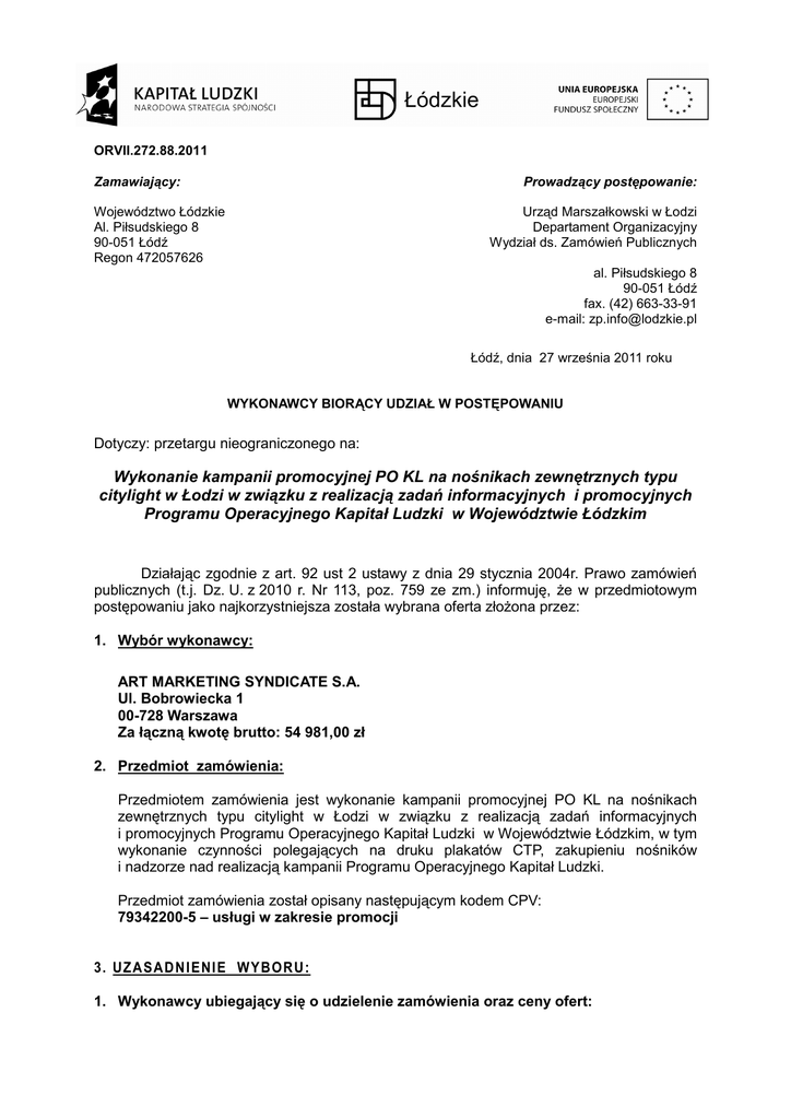 ORVII.272.88.2011 Prowadzący postępowanie: Zamawiający: Województwo Łódzkie Al. Piłsudskiego 8 90-051 Łódź Regon 472057626 Urząd Marszałkowski w Łodzi Departament Organizacyjny Wydział ds. Zamówień Publicznych al. Piłsudskiego 8 90-051 Łódź fax. (42) 663-33-91 e-mail: [email protected] Łódź, dnia 27 września 2011 roku WYKONAWCY BIORĄCY UDZIAŁ W POSTĘPOWANIU Dotyczy: przetargu nieograniczonego na: Wykonanie kampanii promocyjnej PO KL na nośnikach zewnętrznych typu citylight w Łodzi w związku z realizacją zadań informacyjnych i promocyjnych Programu Operacyjnego Kapitał Ludzki w Województwie Łódzkim Działając zgodnie z art. 92 ust 2 ustawy z dnia 29 stycznia 2004r. Prawo zamówień publicznych (t.j. Dz. U. z 2010 r. Nr 113, poz. 759 ze zm.) informuję, że w przedmiotowym postępowaniu jako najkorzystniejsza została wybrana oferta złożona przez: 1. Wybór wykonawcy: ART MARKETING SYNDICATE S.A. Ul. Bobrowiecka 1 00-728 Warszawa Za łączną kwotę brutto: 54 981,00 zł 2. Przedmiot zamówienia: Przedmiotem zamówienia jest wykonanie kampanii promocyjnej PO KL na nośnikach zewnętrznych typu citylight w Łodzi w związku z realizacją zadań informacyjnych i promocyjnych Programu Operacyjnego Kapitał Ludzki w Województwie Łódzkim, w tym wykonanie czynności polegających na druku plakatów CTP, zakupieniu nośników i nadzorze nad realizacją kampanii Programu Operacyjnego Kapitał Ludzki. Przedmiot zamówienia został opisany następującym kodem CPV: 79342200-5 – usługi w zakresie promocji 3. UZ ASADNI ENI E WYBORU: 1. Wykonawcy ubiegający się o udzielenie zamówienia oraz ceny ofert: Nr oferty 1 2 2. Nazwa i adres wykonawcy Cena oferty brutto CLEAR CHANNEL POLAND Sp. z o.o. 00-526 Warszawa, Ul. Krucza 16/2 ART MARKETING SYNDICATE S.A. Ul. Bobrowiecka 1 00-728 Warszawa 69 535,00 zł 54 981,00 zł Wybór najkorzystniejszej oferty: Komisja proponuje wybór najkorzystniejszej oferty na podstawie kryteriów określonych w SIWZ, tj.: Cena – 100% Numer oferty 1 2 Nazwa (firma) i adres wykonawcy CLEAR CHANNEL POLAND Sp. z o.o. 00-526 Warszawa Ul. Krucza 16/22 ART MARKETING SYNDICATE S.A. Ul. Bobrowiecka 1 00-728 Warszawa Cena* 69 535,00 zł 54 981,00 zł Liczba punktów Razem w kryterium liczba punktów 79,07 79,07 II 100,00 100,00 I Najkorzystniejszą ofertą w w/w postępowaniu jest oferta Nr 2 złożona przez: ART MARKETING SYNDICATE S.A., Ul. Bobrowiecka 1, 00-728 Warszawa, oferta jest zgodna z ustawą Pzp, Specyfikacją Istotnych Warunków Zamówienia oraz spełnia wszystkie wymagania określone przez Zamawiającego. Cena oferty nie przekracza kwoty jaką Zamawiający zamierza przeznaczyć na sfinansowanie przedmiotu zamówienia. Wz. Przewodniczącej Komisji Przetargowej /-/Ewa Tylki