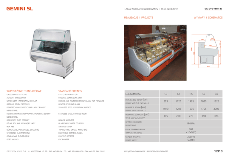 GEMINI SL LADA Z AGREGATEM WBUDOWANYM I PLUG-IN COUNTER REALIZACJE i PROJECTS WYPOSAŻENIE STANDARDOWE STANDARD FITTINGS chłodzenie statyczne static refrigeration LCG GEMINI SL agregat wbudowany integral condensing unit szyba gięta hartowana, uchylna curved and tempered front glass, tilt forward grzałka szyby przedniej heater of front glass lenght without end walls powierzchnia ekspozycyjna lady z blachy stainless steel exposition surface długość z bokami [mm] nierdzewnej komora do przechowywania żywności z blachy długość bez boków (mm) lenght with end walls stainless steel storage room nierdzewnej pojemność użytkowa [dm3] total useful capacity granitowy blat roboczy granite worktop półka szklana wewnątrz lady glass shelf inside counter bok abs abs side cover oświetlenie, pojedyncze, białe 840 top lighting, single, white 840 klasa temperaturowa sterownik elektroniczny electronic control panel temperature class odmrażanie elektryczne electric defrost napięcie zasilania odbojnik pcv pvc bumper power supply es system k sp. z o.o. I ul. Wrzosowa 10, 32 - 340 Wolbrom I tel. +48 32 644 04 00 I fax. +48 32 644 21 82 wymiary i SCHEMATICS 1,0 1,2 1,5 1,7 2,0 963 1125 1425 1625 1925 1043 1205 1505 1705 2005 185 220 278 318 376 czynnik chłodniczy refrigerant URZĄDZENIA CHŁODNICZE I REFRIGERATED CABINETS r404a 3H1 +1/+10OC 230[v] 50[hz] 12I13