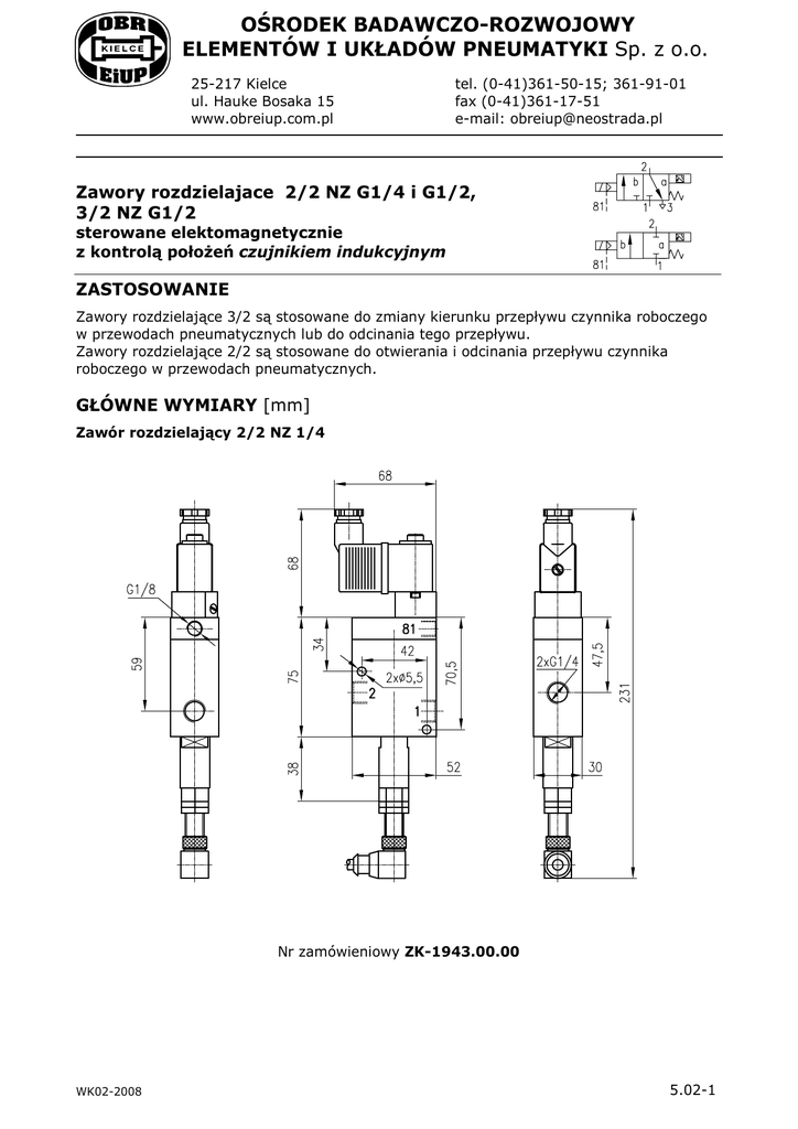 OŚRODEK BADAWCZO-ROZWOJOWY ELEMENTÓW I UKŁADÓW PNEUMATYKI Sp. z o.o. 25-217 Kielce ul. Hauke Bosaka 15 www.obreiup.com.pl tel. (0-41)361-50-15; 361-91-01 fax (0-41)361-17-51 e-mail: [email protected] Zawory rozdzielajace 2/2 NZ G1/4 i G1/2, 3/2 NZ G1/2 sterowane elektomagnetycznie z kontrolą połoŜeń czujnikiem indukcyjnym ZASTOSOWANIE Zawory rozdzielające 3/2 są stosowane do zmiany kierunku przepływu czynnika roboczego w przewodach pneumatycznych lub do odcinania tego przepływu. Zawory rozdzielające 2/2 są stosowane do otwierania i odcinania przepływu czynnika roboczego w przewodach pneumatycznych. GŁÓWNE WYMIARY [mm] Zawór rozdzielający 2/2 NZ 1/4 Nr zamówieniowy ZK-1943.00.00 WK02-2008 5.02-1 Zawory rozdzielajace 2/2 NZ G1/4 i G1/2, 3/2 NZ G1/2 sterowane elektomagnetycznie z kontrolą połoŜeń czujnikiem indukcyjnym Zawór rozdzielajacy 2/2 NZ G1/2 Nr zamówieniowy ZK-1944.00.00 Zawór rozdzielajacy 3/2 NZ G1/2 Nr zamówieniowy ZK-1899.00.00 5.02-2 OBREiUP Kielce Zawory rozdzielajace 2/2 NZ G1/4 i G1/2, 3/2 NZ G1/2 sterowane elektomagnetycznie z kontrolą połoŜeń czujnikiem indukcyjnym OBREiUP Kielce DZIAŁANIE Zawory rozdzielające 2/2 NZ PołoŜenie nieprzesterowane „a” PołoŜenie wymuszone spręŜyną. Wypływ przez otwór „2”, odcięty. Funkcja wyjściowa czujnika indukcyjnego zaleŜna jest od jego połączenia. NC – rozwierająca dla połączenia WH, kolor Ŝyły biały. NO – zwierająca dla połączenia BK, kolor Ŝyły czarny. PołoŜenie przesterowane „b” Podanie napięcia na cewkę elektromagnesu przy równoczesnym istnieniu sygnału pneumatycznego „81” powoduje, Ŝe spręŜone powietrze przepływa z otworu wejściowego „1” do otworu wyjściowego „2”. Sygnał wyjściowy czujnika indukcyjnego został zmieniony. Zawory rozdzielający 3/2 NZ PołoŜenie nieprzesterowane „a” PołoŜenie przesterowane „b” PołoŜenie wymuszone spręŜyną. Otwór wyjściowy „2” połączony z atmosferą przez otwór „3”. Dopływ przez otwór wejściowy „1”, odcięty. Funkcja wyjściowa czujnika indukcyjnego zaleŜna jest od jego połączenia. NC – rozwierająca dla połączenia WH, kolor Ŝyły biały. NO – zwierająca dla połączenia BK, kolor Ŝyły czarny. Podanie napięcia na cewkę elektromagnesu przy równoczesnym istnieniu sygnału pneumatycznego „81” powoduje, Ŝe spręŜone powietrze przepływa z otworu wejściowego „1” do otworu wyjściowego „2”. Wypływ przez otwór „3” do atmosfery, odcięty. Sygnał wyjściowy czujnika indukcyjnego został zmieniony. MATERIAŁY Korpus zaworu Korpus elektrozaworu Części znajdujące się w strefie przepływu czynnika roboczego Uszczelnienia - stop Al tworzywo sztuczne stop Al, stal nierdzewna - poliuretan, NBR 5.02-3 Zawory rozdzielajace 2/2 NZ G1/4 i G1/2, 3/2 NZ G1/2 sterowane elektomagnetycznie z kontrolą połoŜeń czujnikiem indukcyjnym OBREiUP Kielce DANE TECHNICZNE Czynnik roboczy - Zakres ciśnień pracy Minimalne ciśnienie sterujące Zakres temperatur pracy Parametry prądowe elektrozaworu - rodzaj prądu zasilającego - napięcie prądu zasilającego* - - pobór mocy: DC(=) AC(~) tolerancja napięcia względny czas sterowania elektromagnesem stopień zabezpieczenia elektrycznego pozycja pracy - spręŜone powietrze lub gaz o podobnych właściwościach, filtrowane o max. wielkości cząsteczek stałych 40 µm, smarowane lub niesmarowane mgłą olejową 0,13 ÷ 1,0 MPa wg wykresu -10 ÷ +65 ºC - stały, przemienny DC (=) 24V AC (~) 24V, 115V, 230V 50/60Hz 2,5 W 3,5 VA – praca, 6 VA - rozruch ±10% 100% - IP 65 dowolna * inne wielkości napięć do uzgodnienia w zamówieniu Parametry czujnika indukcyjnego - typ - montaŜ korpusu - długość - napięcie zasilania - wyjścia - - przyłącza elektryczne - - schemat połączeń - Bi2-M12-VP6X-H1141 gwint M12x1 na długości 40 mm 52 mm 10...30V DC tranzystorowe komplementarne 1xNPN + 1xPNP złącze kątowe WWAK4-5/P00 z gwintem M12x1 (długość przewodu - 5 m) BN-Zasilanie „+”. Kolor Ŝyły, brązowy. BU-Zasilanie „-”. Kolor Ŝyły, niebieski. WH-Funkcja wyjściowa, NC(rozwierająca) Kolor Ŝyły, biały. BK-Funkcjia wyjściowa, NO(zwierająca) Kolor Ŝyły, czarny. SPOSÓB ZAMAWIANIA W zamówieniu naleŜy podać nazwę zaworu, napięcie i rodzaj prądu zasilającego elektromagnes oraz numer zamówieniowy, np.: Zawór rozdzielający 3/2 NZ G1 1/2 24V DC, ZK-1898.00.00 5.02-4 OŚRODEK BADAWCZO-ROZWOJOWY ELEMENTÓW I UKŁADÓW PNEUMATYKI Sp. z o.o. 25-217 Kielce ul. Hauke Bosaka 15 www.obreiup.com.pl tel. (0-41)361-50-15; 361-91-01 fax (0-41)361-17-51 e-mail: [email protected] Zawory rozdzielajace 3/2 NZ G1 1/4 i G1 1/2, 2/2 NZ G1 sterowane elektomagnetycznie z kontrolą połoŜeń czujnikiem indukcyjnym ZASTOSOWANIE Zawory rozdzielające 3/2 są stosowane do zmiany kierunku przepływu czynnika roboczego w przewodach pneumatycznych lub do odcinania tego przepływu. Zawory rozdzielające 2/2 są stosowane do otwierania i odcinania przepływu czynnika roboczego w przewodach pneumatycznych. GŁÓWNE WYMIARY [mm] Zawory rozdzielajace 3/2 NZ G1 1/4 i G1 1/2 G 1 1/4 1 1/2 WK02-2008 Nr zamówieniiowy ZK-1985.00.00 ZK-1898.00.00 Masa 5.02-5 Zawory rozdzielajace 3/2 NZ G1 1/4 i G1 1/2 ,2/2 NZ G1 sterowane elektomagnetycznie z kontrolą połoŜeń czujnikiem indukcyjnym OBREiUP Kielce Zawór rozdzielajacy 2/2 NZ G1 Nr zamówieniowy ZK-1914.00.00 DZIAŁANIE Zawory rozdzielające 3/2 NZ G1 1/4 i G1 1/2 PołoŜenie nieprzesterowane „a” PołoŜenie wymuszone spręŜyną. Otwór wyjściowy „2” połączony z atmosferą przez otwór „3”. Dopływ przez otwór wejściowy „1”, odcięty. Funkcja wyjściowa czujnika indukcyjnego zaleŜna jest od jego połączenia. NC – rozwierająca dla połączenia WH, kolor Ŝyły biały. NO – zwierająca dla połączenia BK, kolor Ŝyły czarny. 5.02-6 PołoŜenie przesterowane „b” Podanie napięcia na cewkę elektromagnesu przy równoczesnym istnieniu sy
