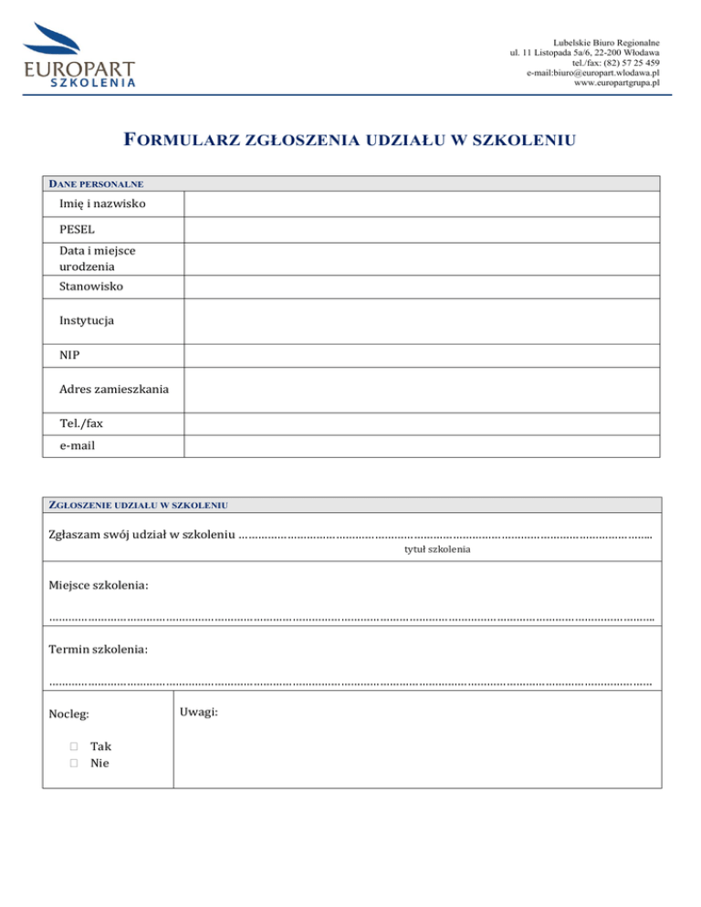 Lubelskie Biuro Regionalne ul. 11 Listopada 5a/6, 22-200 Włodawa tel./fax: (82) 57 25 459 e-mail:[email protected] www.europartgrupa.pl FORMULARZ ZGŁOSZENIA UDZIAŁU W SZKOLENIU DANE PERSONALNE Imię i nazwisko PESEL Data i miejsce urodzenia Stanowisko Instytucja NIP Adres zamieszkania Tel./fax e-mail ZGŁOSZENIE UDZIAŁU W SZKOLENIU Zgłaszam swój udział w szkoleniu ……………………………………………………………………………………………………………….. tytuł szkolenia Miejsce szkolenia: ……………………………………………………………………………………………………………………………………………………………………. Termin szkolenia: …………………………………………………………………………………………………………………………………………………………………… Nocleg: Tak Nie Uwagi: Lubelskie Biuro Regionalne ul. 11 Listopada 5a/6, 22-200 Włodawa tel./fax: (82) 57 25 459 e-mail:[email protected] www.europartgrupa.pl REGULAMIN UCZESTNICTWA W SZKOLENIU Szkolenia otwarte w Lublinie odbywają się w naszej siedzibie przy ul. Jana Sawy 2 (budynek ZANA HOUSE) w godz. 9.00-17.00 (chyba, że jest zaznaczone inaczej). Warunkiem uczestnictwa w szkoleniu jest przesłanie wypełnionego formularza zgłoszenia udziału w szkoleniu oraz dokonanie zapłaty na podstawie faktury pro-forma najpóźniej w dniu szkolenia. Koszt szkolenia dwudniowego dla jednej osoby - 699,00 zł. (brutto) Konto do wpłat: 91 1140 2004 0000 3202 4573 7651 w mBank. W cenę nie wliczono opłaty za nocleg w hotelu. W przypadku chęci korzystania z noclegu uczestnik zobowiązany jest poinformować o tym fakcie organizatora. Zryczałtowana opłata za nocleg ze śniadaniem w pokoju dwuosobowym wynosi 110,00 zł (brutto).W przypadku rezerwacji noclegu przez organizatora, zastrzega on sobie prawo do wskazania miejsca noclegu. Szkolenia odbywają się przy minimalnej liczbie 10 uczestników, zebranych na 5 dni przed szkoleniem. Osoby zgłoszone informowane są z 5-dniowym wyprzedzeniem o realizacji szkolenia. W przypadku odwołania szkolenia przez firmę EUROPART, pełna kwota wpłacona na poczet szkolenia zostanie niezwłocznie zwrócona na konto klienta, lub – jeżeli klient wyrazi zgodę- zostanie mu zaproponowany inny termin szkolenia. Jeżeli uczestnik nie będzie mógł uczestniczyć w opłaconym terminie ze szkolenia to: jeżeli zgłosi ten fakt najpóźniej na pełne 14 dni kalendarzowych przed szkoleniem, wówczas niezwłocznie zwracamy mu pełną kwotę jego wpłaty, lub z jego miejsca może skorzystać inna wskazana osoba lub może wybrać inne szkolenie (termin i temat) w miarę wolnych miejsc na szkoleniu oraz po wyrównaniu przez strony ewentualnych różnic w cenie, jeżeli zgłosi ten fakt najpóźniej na 2 dni robocze przed szkoleniem, wówczas niezwłocznie zwracamy mu 90% z kwoty jego wpłaty, lub z jego miejsca może skorzystać inna wskazana osoba lub może wybrać inne szkolenie (termin i temat) w miarę wolnych miejsc na szkoleniu oraz po wyrównaniu przez strony ewentualnych różnic w cenie, jeżeli zgłosi ten fakt w przeddzień rozpoczęcia szkolenia, wówczas z jego miejsca może skorzystać inna wskazana osoba lub może wybrać inne szkolenie (termin i temat) w miarę wolnych miejsc na szkoleniu oraz po wyrównaniu przez strony ewentualnych różnic w cenie, Nieusprawiedliwiona nieobecność na szkoleniu oznacza zarówno brak zwrotu dokonanej wpłaty, jak i utratę prawa do przeniesienia się lub zapisania innej osoby w swoim zastępstwie na inne szkolenie. Uwzględniamy oczywiście przypadki losowe! Wyrażam zgodę na przechowywanie i przetwarzanie przez firmę EUROPART Sp. z o.o. moich danych osobowych zawartych w formularzu wyłącznie dla potrzeb procesu rejestracji oraz w celach marketingowych, zgodnie z Ustawą z dnia 29.08.1997 o Ochronie Danych Osobowych (Dz. U. 2002 Nr 101 poz. 926). Świadom jestem faktu, że przysługuje mi prawo wglądu do swoich danych oraz prawo do ich poprawiania. …………….................................. Miejscowość, data …………………………………………. Czytelny podpis uczestnika Wypełniony formularz zgłoszeniowy prosimy przesłać do biura faksem 82/57 25 459 lub mailem: [email protected]