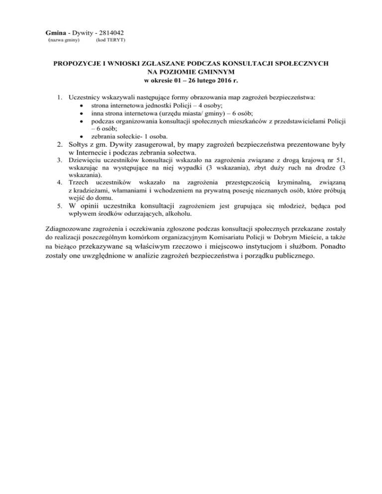 Gmina - Dywity - 2814042 (nazwa gminy) (kod TERYT) PROPOZYCJE I WNIOSKI ZGŁASZANE PODCZAS KONSULTACJI SPOŁECZNYCH NA POZIOMIE GMINNYM w okresie 01 – 26 lutego 2016 r. 1. Uczestnicy wskazywali następujące formy obrazowania map zagrożeń bezpieczeństwa: strona internetowa jednostki Policji – 4 osoby; inna strona internetowa (urzędu miasta/ gminy) – 6 osób; podczas organizowania konsultacji społecznych mieszkańców z przedstawicielami Policji – 6 osób; zebrania sołeckie- 1 osoba. 2. Sołtys z gm. Dywity zasugerował, by mapy zagrożeń bezpieczeństwa prezentowane były w Internecie i podczas zebrania sołectwa. 3. Dziewięciu uczestników konsultacji wskazało na zagrożenia związane z drogą krajową nr 51, wskazując na występujące na niej wypadki (3 wskazania), zbyt duży ruch na drodze (3 wskazania). 4. Trzech uczestników wskazało na zagrożenia przestępczością kryminalną, związaną z kradzieżami, włamaniami i wchodzeniem na prywatną posesję nieznanych osób, które próbują wejść do domu. 5. W opinii uczestnika konsultacji zagrożeniem jest grupująca się młodzież, będąca pod wpływem środków odurzających, alkoholu. Zdiagnozowane zagrożenia i oczekiwania zgłoszone podczas konsultacji społecznych przekazane zostały do realizacji poszczególnym komórkom organizacyjnym Komisariatu Policji w Dobrym Mieście, a także na bieżąco przekazywane są właściwym rzeczowo i miejscowo instytucjom i służbom. Ponadto zostały one uwzględnione w analizie zagrożeń bezpieczeństwa i porządku publicznego.