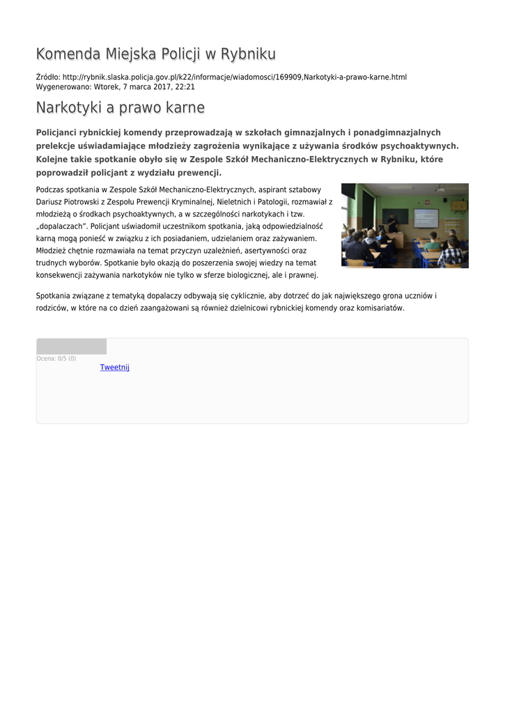 Komenda Miejska Policji w Rybniku Źródło: http://rybnik.slaska.policja.gov.pl/k22/informacje/wiadomosci/169909,Narkotyki-a-prawo-karne.html Wygenerowano: Wtorek, 7 marca 2017, 22:21 Narkotyki a prawo karne Policjanci rybnickiej komendy przeprowadzają w szkołach gimnazjalnych i ponadgimnazjalnych prelekcje uświadamiające młodzieży zagrożenia wynikające z używania środków psychoaktywnych. Kolejne takie spotkanie obyło się w Zespole Szkół Mechaniczno-Elektrycznych w Rybniku, które poprowadził policjant z wydziału prewencji. Podczas spotkania w Zespole Szkół Mechaniczno-Elektrycznych, aspirant sztabowy Dariusz Piotrowski z Zespołu Prewencji Kryminalnej, Nieletnich i Patologii, rozmawiał z młodzieżą o środkach psychoaktywnych, a w szczególności narkotykach i tzw. „dopalaczach”. Policjant uświadomił uczestnikom spotkania, jaką odpowiedzialność karną mogą ponieść w związku z ich posiadaniem, udzielaniem oraz zażywaniem. Młodzież chętnie rozmawiała na temat przyczyn uzależnień, asertywności oraz trudnych wyborów. Spotkanie było okazją do poszerzenia swojej wiedzy na temat konsekwencji zażywania narkotyków nie tylko w sferze biologicznej, ale i prawnej. Spotkania związane z tematyką dopalaczy odbywają się cyklicznie, aby dotrzeć do jak największego grona uczniów i rodziców, w które na co dzień zaangażowani są również dzielnicowi rybnickiej komendy oraz komisariatów. Ocena: 0/5 (0) Tweetnij