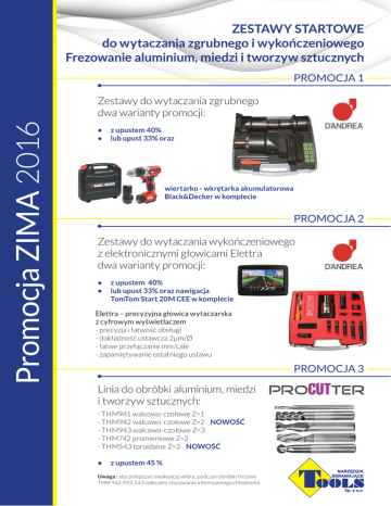 ZESTAWY STARTOWE do wytaczania zgrubnego i wykończeniowego Frezowanie aluminium, miedzi i tworzyw sztucznych PROMOCJA 1 Promocja ZIMA 2016 Zestawy do wytaczania zgrubnego dwa warianty promocji: • z upustem 40% • lub upust 33% oraz wiertarko - wkrętarka akumulatorowa Black&Decker w komplecie PROMOCJA 2 Zestawy do wytaczania wykończeniowego z elektronicznymi głowicami Elettra dwa warianty promocji: • z upustem 40% • lub upust 33% oraz nawigacja TomTom Start 20M CEE w komplecie Elettra – precyzyjna głowica wytaczarska z cyfrowym wyświetlaczem - precyzja i łatwość obsługi - dokładność ustawcza 2µm/Ø - łatwe przełączanie mm/cale - zapamiętywanie ostatniego ustawu PROMOCJA 3 Linia do obróbki aluminium, miedzi i tworzyw sztucznych: - THM941 walcowo-czołowe Z=1 - THM942 walcowo-czołowe Z=2 NOWOŚĆ - THM943 walcowo-czołowe Z=3 - THM742 promieniowe Z=2 - THM543 toroidalne Z=3 NOWOŚĆ • z upustem 45 % Uwaga : aby polepszyć ewakuację wióra, podczas obróbki frezami THM 942,943,543 zalecamy stosowanie intensywnego chłodzenia 1.1 2.1 promocja 2.2 3 Cena katalogowa [EUR] Cena promocyjna upust 40% [EUR] zakres 18-50 mm 1 870,00 1 122,00 KIT TS - M zakres 50-120 mm 1 788,00 1 072,80 KIT TS - L zakres 90-200 mm 1 951,00 1 170,60 Zestaw do wytaczania zgrubnego TS D’Andrea Cena katalogowa [EUR] Cena promocyjna upust 33% [EUR] KIT TS -S zakres 18-50 mm 1 870,00 1 252,90 KIT TS - M zakres 50-120 mm 1 788,00 1 197,96 KIT TS - L zakres 90-200 mm 1 951,00 1 307,17 Zestaw do wytaczania wykończeniowego ElettraD’Andrea Cena katalogowa [EUR] Cena promocyjna upust 40% [EUR] 655200500500 KIT K01 TR-Elettra 50 1 921,00 1 152,60 655200500630 KIT K01 TR-Elettra 63 2 301,00 1 380,60 655200500800 KIT K01 TR-Elettra 80 2 397,00 1 438,20 455220002000 głowica TR-Elettra 200 (bez zestawu) 1 702,00 1 021,20 Kod promocja Zestaw do wytaczania zgrubnego TS D’Andrea KIT TS -S Kod 1.2 promocja Kod Kod promocja Promocja ZIMA 2016 promocja ZESTAWY PROMOCYJNE - CENNIK Zestaw do wytaczania wykończeniowego ElettraD’Andrea Cena katalogowa [EUR] Cena promocyjna upust 33% [EUR] 655200500500 KIT K01 TR-Elettra 50 1 921,00 1 287,07 655200500630 KIT K01 TR-Elettra 63 2 301,00 1 541,67 655200500800 KIT K01 TR-Elettra 80 2 397,00 1 605,99 Ceny katalogowe frezów Procutter, w tym linii objętej promocją, dostępne są w aktualnym cenniku Procutter Podane ceny są cenami netto, do cen należy doliczyć podatek VAT. Ceny EUR przeliczane są po kursie NBP z dnia poprzedzającego wystawienie faktury. Promocja ważna od 1.02. do 31.03.2016 lub do wyczerpania zapasów. Promocja nie łączy się z innymi promocjami ani upustami. Regulamin promocji oraz specyfikacja produktów dostępne w biurze Tools. Narzędzia Skrawające Tools Sp. z o.o. ul. Grabskiego 25, 55-011 Siechnice tel. +48 71 343 58 58, fax +48 71 341 94 70 e-mail: [email protected] www.toolswro.com.pl