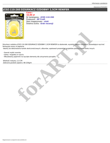 Informacje o produkcie Utworzono 07-03-2017 JCDZ-110-260 DZIURKACZ OZDOBNY 2,5CM RENIFER Cena : 10,99 zł T. pl Nr katalogowy : JCDZ-110-260 Producent : DP Craft Stan magazynowy : niski Średnia ocena : brak recenzji Dziurkacz ozdobny JCDZ-110-260 DZIURKACZ OZDOBNY 2,5CM RENIFER to doskonałe, wysokiej jakości narzędzie, pozwalające wycinać fantazyjne wzory w papierze. Idealny do dekorowania kartek okolicznościowych, albumów, opakowań prezentów, projektów plastycznych i wielu innych. - Szeroki wybór wzorów. - Łatwy i wygodny w użyciu. - Wbudowany pojemnik na wycięte elementy dla utrzymania porządku fo rA R Wielkość motywu: 2,5 CM Zalecana grubość papieru: 80-220g/m Wygenerowano w programie www.oscGold.com