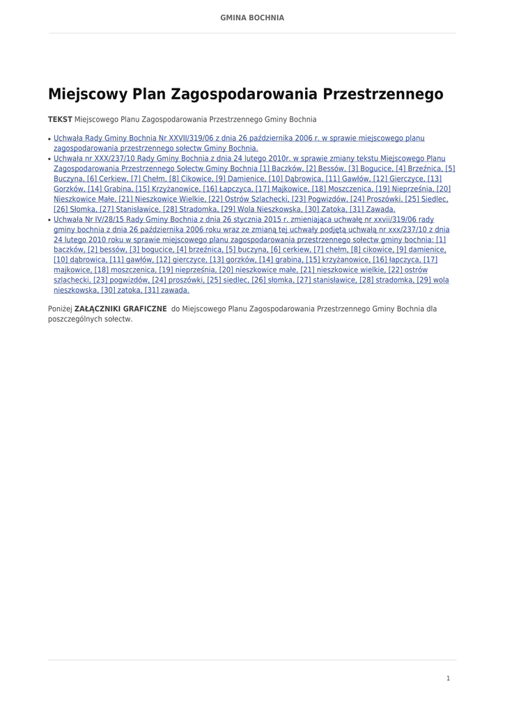 GMINA BOCHNIA Miejscowy Plan Zagospodarowania Przestrzennego TEKST Miejscowego Planu Zagospodarowania Przestrzennego Gminy Bochnia ● ● ● Uchwała Rady Gminy Bochnia Nr XXVII/319/06 z dnia 26 października 2006 r. w sprawie miejscowego planu zagospodarowania przestrzennego sołectw Gminy Bochnia. Uchwała nr XXX/237/10 Rady Gminy Bochnia z dnia 24 lutego 2010r. w sprawie zmiany tekstu Miejscowego Planu Zagospodarowania Przestrzennego Sołectw Gminy Bochnia [1] Baczków, [2] Bessów, [3] Bogucice, [4] Brzeźnica, [5] Buczyna, [6] Cerkiew, [7] Chełm, [8] Cikowice, [9] Damienice, [10] Dąbrowica, [11] Gawłów, [12] Gierczyce, [13] Gorzków, [14] Grabina, [15] Krzyżanowice, [16] Łapczyca, [17] Majkowice, [18] Moszczenica, [19] Nieprześnia, [20] Nieszkowice Małe, [21] Nieszkowice Wielkie, [22] Ostrów Szlachecki, [23] Pogwizdów, [24] Proszówki, [25] Siedlec, [26] Słomka, [27] Stanisławice, [28] Stradomka, [29] Wola Nieszkowska, [30] Zatoka, [31] Zawada. Uchwała Nr IV/28/15 Rady Gminy Bochnia z dnia 26 stycznia 2015 r. zmieniająca uchwałę nr xxvii/319/06 rady gminy bochnia z dnia 26 października 2006 roku wraz ze zmianą tej uchwały podjętą uchwałą nr xxx/237/10 z dnia 24 lutego 2010 roku w sprawie miejscowego planu zagospodarowania przestrzennego sołectw gminy bochnia: [1] baczków, [2] bessów, [3] bogucice, [4] brzeźnica, [5] buczyna, [6] cerkiew, [7] chełm, [8] cikowice, [9] damienice, [10] dąbrowica, [11] gawłów, [12] gierczyce, [13] gorzków, [14] grabina, [15] krzyżanowice, [16] łapczyca, [17] majkowice, [18] moszczenica, [19] nieprześnia, [20] nieszkowice małe, [21] nieszkowice wielkie, [22] ostrów szlachecki, [23] pogwizdów, [24] proszówki, [25] siedlec, [26] słomka, [27] stanisławice, [28] stradomka, [29] wola nieszkowska, [30] zatoka, [31] zawada. Poniżej ZAŁĄCZNIKI GRAFICZNE do Miejscowego Planu Zagospodarowania Przestrzennego Gminy Bochnia dla poszczególnych sołectw. 1