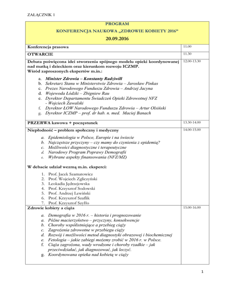 ZAŁĄCZNIK 1 PROGRAM KONFERENCJA NAUKOWA „ZDROWIE KOBIETY 2016” 20.09.2016 Konferencja prasowa 11.00 OTWARCIE 11.30 Debata poświęcona idei stworzenia spójnego modelu opieki koordynowanej 12.00-13.30 nad matką i dzieckiem oraz kierunkom rozwoju ICZMP. Wśród zaproszonych ekspertów m.in.: a. b. c. d. e. Minister Zdrowia – Konstanty Radziwiłł Sekretarz Stanu w Ministerstwie Zdrowia – Jarosław Pinkas Prezes Narodowego Funduszu Zdrowia – Andrzej Jacyna Wojewoda Łódzki – Zbigniew Rau Dyrektor Departamentu Świadczeń Opieki Zdrowotnej NFZ - Wojciech Zawalski f. Dyrektor ŁOW Narodowego Funduszu Zdrowia – Artur Olsiński g. Dyrektor ICZMP – prof. dr hab. n. med. Maciej Banach PRZERWA kawowa + poczęstunek 13.30-14.00 Niepłodność – problem społeczny i medyczny 14.00-15.00 a. b. c. d. e. Epidemiologia w Polsce, Europie i na świecie Najczęstsze przyczyny – czy mamy do czynienia z epidemią? MoŜliwości diagnostyczne i terapeutyczne Narodowy Program Poprawy Demografii Wybrane aspekty finansowania (NFZ/MZ) W debacie udział wezmą m.in. eksperci: 1. Prof. Jacek Szamatowicz 2. Prof. Wojciech Zgliczyński 3. Leokadia Jędrzejowska 4. Prof. Krzysztof Sodowski 5. Prof. Andrzej Lewiński 6. Prof. Krzysztof Szaflik 7. Prof. Krzysztof Szyłło Zdrowie kobiety a ciąŜa 15.00-16.00 a. a. b. c. d. e. f. Demografia w 2016 r. – historia i prognozowanie Późne macierzyństwo – przyczyny, konsekwencje Choroby współistniejące a przebieg ciąŜy ZagroŜenia zdrowotne w przebiegu ciąŜy Rozwój i moŜliwości metod diagnostyki obrazowej i biochemicznej Fetologia – jakie zabiegi moŜemy zrobić w 2016 r. w Polsce. CiąŜa zagroŜona, wady wrodzone i choroby rzadkie – jak przeciwdziałać, jak diagnozować, jak leczyć. g. Koordynowana opieka nad kobietą w ciąŜy 1 ZAŁĄCZNIK 1 W debacie udział wezmą m.in. eksperci: 1. Prof. Stanisław Radowicki 2. Dr Tomasz Maciejewski 3. Dyr. Wojciech Zawalski 4. Prof. Maciej Banach 5. Prof. Maria Respondek-Liberska 6. Dr Ewa Starostecka 7. Dr Mariusz Grzesiak Kobieta z nowotworem 16.00-17.00 a. Epidemiologia nowotworów narządów rodnych i sutka b. Aktualne standardy postępowania c. Nowoczesne metody leczenia – leki innowacyjne d. Postępowanie w powikłaniach po chemioterapii e. Leczenie rekonstrukcyjne f. Kompleksowa rehabilitacja łącznie z opieką psychologiczną g. Wybrane aspekty finansowania W debacie udział wezmą m.in. eksperci: 1. 2. 3. 4. 5. 6. Wojciech Zawalski Artur Olsiński Prof. Radzisław Kordek Prof. Paweł Szychta Prof. Marek ZadroŜny Prof. Andrzej Malinowski Uroczysta kolacja 18.30 2 ZAŁĄCZNIK 1 PROGRAM KONFERENCJA NAUKOWA „ZDROWIE KOBIETY 2016” 21.09.2016 Powitalna kawa Opieka nad kobietą w okresie około i postmenopauzalnym 10.00-11.00 a. Menopauza – czynnik ryzyka chorób sercowo-naczyniowych? b. Menopauza a osteoporoza c. Menopauza a choroby reumatoidalne d. Wczesna menopauza - przyczyny, diagnostyka i postępowanie) e. Menopauza czy to wiek podeszły? W debacie udział wezmą m.in. eksperci: 1. Prof. Tomasz Pertyński 2. Prof. Piotr Hoffmann 3. Alicja Kaczorowska 4. Prof. Tomasz Kostka 5. Prof. Lucyna Woźniak 6. Prof. Krzysztof Szyłło 7. Prof. Andrzej Lewiński 8. Prof. Maciej Banach Finansowanie badań naukowych związanych ze zdrowiem kobiety 11.00-12.00 b. c. d. e. f. Wyzwania demografia Starzejące się społeczeństwo Choroby cywilizacyjne Środki krajowe i międzynarodowe Współpraca w Polsce i międzynarodowa (w tym USA i Partnerstwo Wschodnie) g. Think-Thank – Innowacje dla Zdrowia W debacie udział wezmą m.in. eksperci: 1. Michał Kaczmarek 2. Prof. Lucyna Woźniak 3. Prof. Maciej Banach 4. Prof. Mariusz Stasiołek Zdrowie kobiety – mapa potrzeb zdrowotnych w zakresie leczenia 12.00-13.30 szpitalnego a. Diagnoza aktualnych potrzeb i wyzwań zdrowotnych związanych ze zdrowiem kobiety w 2016 r. b. Czy istnieje potrzeba niezaleŜnego podejścia do zdrowia kobiety i męŜczyzny? c. Czy istnieje potrzeba oddziałów dedykowanych zdrowiu kobiety na 3 ZAŁĄCZNIK 1 wzór podobnych ośrodków w Europie i na świecie? d. Optymalizacja finansowania procedur medycznych w związku z wyzwaniami społecznymi w XXI wieku – demografia, niepłodność, choroby cywilizacyjne. e. Kobieta w podeszłym wieku – wyzwanie medyczne i związane z organizacją opieki zdrowotnej (geriatria) w 2016 r. W debacie udział wezmą m.in. eksperci: 1. Konstanty Radziwiłł 2. Prof. Maciej Banach 3. Andrzej Jacyna PODSUMOWANIE i ZAMKNIĘCIE KONFERENCJI 13.30 4