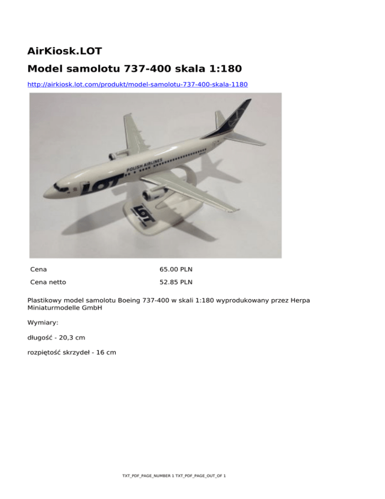 AirKiosk.LOT Model samolotu 737-400 skala 1:180 http://airkiosk.lot.com/produkt/model-samolotu-737-400-skala-1180 Cena 65.00 PLN Cena netto 52.85 PLN Plastikowy model samolotu Boeing 737-400 w skali 1:180 wyprodukowany przez Herpa Miniaturmodelle GmbH Wymiary: długość - 20,3 cm rozpiętość skrzydeł - 16 cm TXT_PDF_PAGE_NUMBER 1 TXT_PDF_PAGE_OUT_OF 1