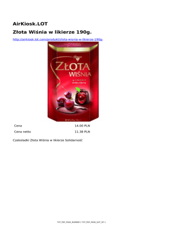 AirKiosk.LOT Złota Wiśnia w likierze 190g. http://airkiosk.lot.com/produkt/zlota-wisnia-w-likierze-190g- Cena 14.00 PLN Cena netto 11.38 PLN Czekoladki Złota Wiśnia w likierze Solidarność TXT_PDF_PAGE_NUMBER 1 TXT_PDF_PAGE_OUT_OF 1