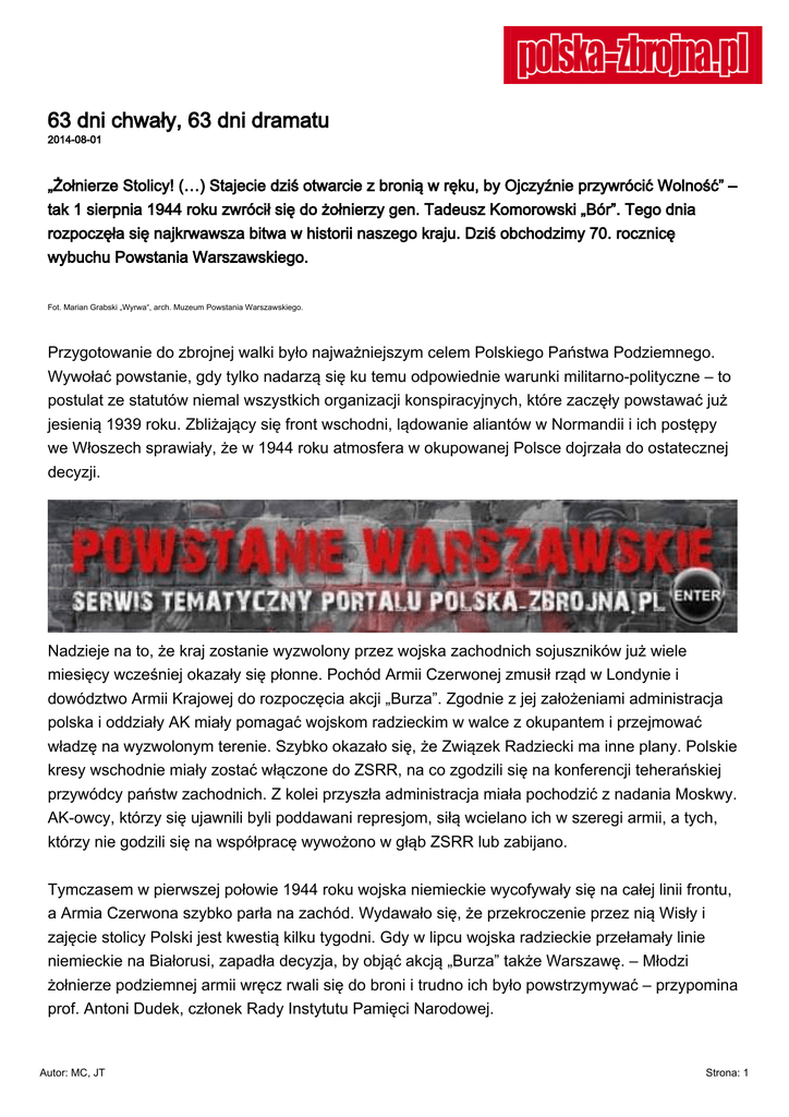 63 dni chwały, 63 dni dramatu 2014-08-01 „Żołnierze Stolicy! (…) Stajecie dziś otwarcie z bronią w ręku, by Ojczyźnie przywrócić Wolność” – tak 1 sierpnia 1944 roku zwrócił się do żołnierzy gen. Tadeusz Komorowski „Bór”. Tego dnia rozpoczęła się najkrwawsza bitwa w historii naszego kraju. Dziś obchodzimy 70. rocznicę wybuchu Powstania Warszawskiego. Fot. Marian Grabski „Wyrwa“, arch. Muzeum Powstania Warszawskiego. Przygotowanie do zbrojnej walki było najważniejszym celem Polskiego Państwa Podziemnego. Wywołać powstanie, gdy tylko nadarzą się ku temu odpowiednie warunki militarno-polityczne – to postulat ze statutów niemal wszystkich organizacji konspiracyjnych, które zaczęły powstawać już jesienią 1939 roku. Zbliżający się front wschodni, lądowanie aliantów w Normandii i ich postępy we Włoszech sprawiały, że w 1944 roku atmosfera w okupowanej Polsce dojrzała do ostatecznej decyzji. Nadzieje na to, że kraj zostanie wyzwolony przez wojska zachodnich sojuszników już wiele miesięcy wcześniej okazały się płonne. Pochód Armii Czerwonej zmusił rząd w Londynie i dowództwo Armii Krajowej do rozpoczęcia akcji „Burza”. Zgodnie z jej założeniami administracja polska i oddziały AK miały pomagać wojskom radzieckim w walce z okupantem i przejmować władzę na wyzwolonym terenie. Szybko okazało się, że Związek Radziecki ma inne plany. Polskie kresy wschodnie miały zostać włączone do ZSRR, na co zgodzili się na konferencji teherańskiej przywódcy państw zachodnich. Z kolei przyszła administracja miała pochodzić z nadania Moskwy. AK-owcy, którzy się ujawnili byli poddawani represjom, siłą wcielano ich w szeregi armii, a tych, którzy nie godzili się na współpracę wywożono w głąb ZSRR lub zabijano. Tymczasem w pierwszej połowie 1944 roku wojska niemieckie wycofywały się na całej linii frontu, a Armia Czerwona szybko parła na zachód. Wydawało się, że przekroczenie przez nią Wisły i zajęcie stolicy Polski jest kwestią kilku tygodni. Gdy w lipcu wojska radzieckie przełamały linie niemieckie na Białorusi, zapadła decyzja, by objąć akcją „Burza” także Warszawę. – Młodzi żołnierze podziemnej armii wręcz rwali się do broni i trudno ich było powstrzymywać – przypomina prof. Antoni Dudek, członek Rady Instytutu Pamięci Narodowej. Autor: MC, JT Strona: 1 Początek powstania wyznaczony został na 1 sierpnia. Plan był jasny: wystąpić zbrojnie przeciwko wycofującym się Niemcom, opanować opuszczone przez nich miasto i wystąpić wobec nadchodzącej ze wschodu Armii Czerwonej jako prawowity gospodarz Warszawy. „Żołnierze Stolicy! Wydałem dziś upragniony przez Was rozkaz do jawnej walki z odwiecznym wrogiem Polski, najeźdźcą niemieckim. Po pięciu blisko latach nieprzerwanej i twardej walki prowadzonej w podziemiach konspiracji stajecie dziś otwarcie z bronią w ręku, by Ojczyźnie przywrócić Wolność i wymierzyć zbrodniarzom niemieckim przykładną karę za terror i zbrodnie dokonane na ziemiach Polski” – tymi słowami 1 sierpnia 1944 roku zwrócił się do podległych mu żołnierzy gen. dyw. Tadeusz Komorowski „Bór”, głównodowodzący Armii Krajowej. Film: Wojskowe Centrum Edukacji Obywatelskiej O 17, w godzinę „W”, oddziały Armii Krajowej przystąpiły do walki. Około 35 tys. żołnierzy z białoczerwonymi opaskami stanęło naprzeciw prawie 20-tysięcznej armii wroga. Choć siły okupacyjne składały się w większości z jednostek policyjnych i garnizonowych, były znacznie lepiej uzbrojone, zajmowały umocnione pozycje i w każdej chwili mogły liczyć na odsiecz oddziałów frontowych. W momencie wybuchu walk w arsenale AK znajdowało się: ok. 100 ciężkich i ręcznych karabinów maszynowych, ok. 400 pistoletów maszynowych, ok. 1500 karabinów, 2,5 tys. pistoletów oraz kilkadziesiąt tysięcy granatów – w większości konspiracyjnej produkcji i butelek z benzyną. Brak było ciężkiej broni. Bardzo szczupłe były też zapasy amunicji. Z czasem wyposażenie oddziałów udało się uzupełnić bronią zdobytą w walce i przejętą ze zrzutów, a także produkcją własną. Powstańcy z bronią pochodzącą ze zrzutu. Fot. Joachim Joachimczyk „Joachim”, arch. Muzeum Powstania Warszawskiego. Już pierwszego dnia walk dały o sobie znać bolączki, z którymi powstańcy zmagali się do końca Powstania. Oddziały były bardzo słabo uzbrojone i nie dość wyszkolone, nie było wystarczającej ilości zaopatrzenia, szwankowała łączność i koordynacja działań. Z tych powodów sukcesy pierwszych dni Powstania Warszawskiego były umiarkowane. Udało się wprawdzie opanować duże połacie miasta (przede wszystkim w Śródmieściu i na Starym Mieście), ale strategiczne punkty pozostały pod kontrolą wojsk niemieckich. Armia Krajowa nie zdobyła mostów na Wiśle, dworców kolejowych, lotnisk, koszar czy Cytadeli. W wielu punktach Warszawy powstańcy zdołali jedynie izolować silne pozycje nieprzyjaciela. Autor: MC, JT Strona: 2 Czy można się było lepiej przygotować do walki, chociażby pod względem uzbrojenia? – Można sobie wyobrazić, że wiosną 1944 roku rozpoczęto by zrzuty broni dla żołnierzy podziemia. Musiałyby one być jednak organizowane na terenach kontrolowanych przez Armię Czerwoną, a więc przy jej akceptacji. Później broń byłaby szmuglowana do Warszawy. Problem w tym, że ani Waszyngton, ani Londyn nie brały na poważnie zapowiedzi Polaków o zorganizowaniu powstania – ocenia prof. Antoni Dudek. Wojska niemieckie miały przytłaczającą przewagę w sile ognia. Fot. arch. Muzeum Powstania Warszawskiego. Do 4 sierpnia trwała ofensywna część Powstania Warszawskiego. Armii Krajowej udawało się powiększać swój stan posiadania. W tym czasie wojska niemieckie przegrupowywały się, by wyprowadzić kontruderzenie. Następnego dnia nieprzyjaciel rozpoczął realizację planu stł