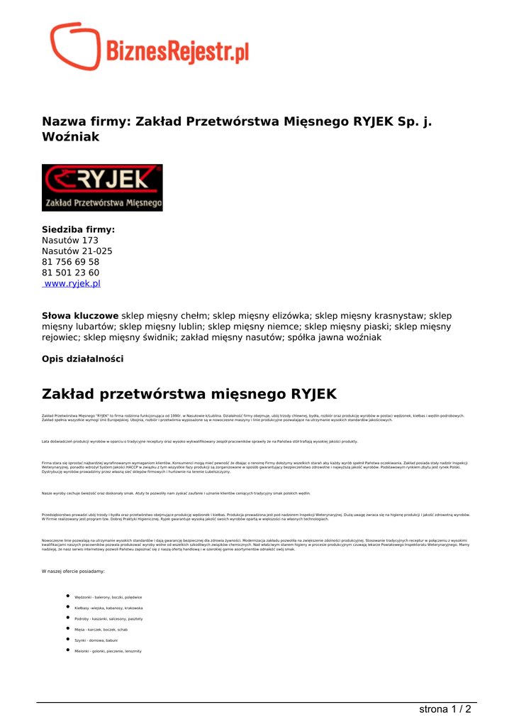Nazwa firmy: Zakład Przetwórstwa Mięsnego RYJEK Sp. j. Woźniak Siedziba firmy: Nasutów 173 Nasutów 21-025 81 756 69 58 81 501 23 60 www.ryjek.pl Słowa kluczowe sklep mięsny chełm; sklep mięsny elizówka; sklep mięsny krasnystaw; sklep mięsny lubartów; sklep mięsny lublin; sklep mięsny niemce; sklep mięsny piaski; sklep mięsny rejowiec; sklep mięsny świdnik; zakład mięsny nasutów; spółka jawna woźniak Opis działalności Zakład przetwórstwa mięsnego RYJEK Zakład Przetwórstwa Mięsnego "RYJEK" to firma rodzinna funkcjonująca od 1990r. w Nasutowie k/Lublina. Działalność firmy obejmuje, ubój trzody chlewnej, bydła, rozbiór oraz produkcję wyrobów w postaci wędzonek, kiełbas i wędlin podrobowych. Zakład spełnia wszystkie wymogi Unii Europejskiej. Ubojnia, rozbiór i przetwórnia wyposażone są w nowoczesne maszyny i linie produkcyjne pozwalające na utrzymanie wysokich standardów jakościowych. Lata doświadczeń produkcji wyrobów w oparciu o tradycyjne receptury oraz wysoko wykwalifikowany zespół pracowników sprawiły że na Państwa stół trafiają wysokiej jakości produkty. Firma stara się sprostać najbardziej wyrafinowanym wymaganiom klientów. Konsumenci mogą mieć pewność że dbając o renomę Firmy dołożymy wszelkich starań aby każdy wyrób spełnił Państwa oczekiwania. Zakład posiada stały nadzór Inspekcji Weterynaryjnej, ponadto wdrożył System Jakości HACCP w związku z tym wszystkie fazy produkcji są zorganizowane w sposób gwarantujący bezpieczeństwo zdrowotne i najwyższą jakość wyrobów. Podstawowym rynkiem zbytu jest rynek Polski. Dystrybucję wyrobów prowadzimy przez własną sieć sklepów firmowych i hurtownie na terenie Lubelszczyzny. Nasze wyroby cechuje świeżość oraz doskonały smak. Atuty te pozwoliły nam zyskać zaufanie i uznanie klientów ceniących tradycyjny smak polskich wędlin. Przedsiębiorstwo prowadzi ubój trzody i bydła oraz przetwórstwo obejmujące produkcję wędzonek i kiełbas. Produkcja prowadzona jest pod nadzorem Inspekcji Weterynaryjnej. Dużą uwagę zwraca się na higienę produkcji i jakość zdrowotną wyrobów. W Firmie realizowany jest program tzw. Dobrej Praktyki Higienicznej. Ryjek gwarantuje wysoką jakość swoich wyrobów opartą w większości na własnych technologiach. Nowoczesne linie pozwalają na utrzymanie wysokich standardów i dają gwarancję bezpiecznej dla zdrowia żywności. Modernizacja zakładu pozwoliła na zwiększenie zdolności produkcyjnej. Stosowanie tradycyjnych receptur w połączeniu z wysokimi kwalifikacjami naszych pracowników pozwala produkować wyroby wolne od wszelkich szkodliwych związków chemicznych. Nad właściwym stanem higieny w procesie produkcyjnym czuwają lekarze Powiatowego Inspektoratu Weterynaryjnego. Mamy nadzieję, że nasz serwis internetowy pozwoli Państwu zapoznać się z naszą ofertą handlową i w szerokiej gamie asortymentów odnaleźć swój smak. W naszej ofercie posiadamy: Wędzonki - balerony, boczki, polędwice Kiełbasy -wiejska, kabanosy, krakowska Podroby - kaszanki, salcesony, pasztety Mięsa - karczek, boczek, schab Szynki - domowa, babuni Mielonki - golonki, pieczenie, lenszmity strona 1 / 2 strona 2 / 2 Powered by TCPDF (www.tcpdf.org)