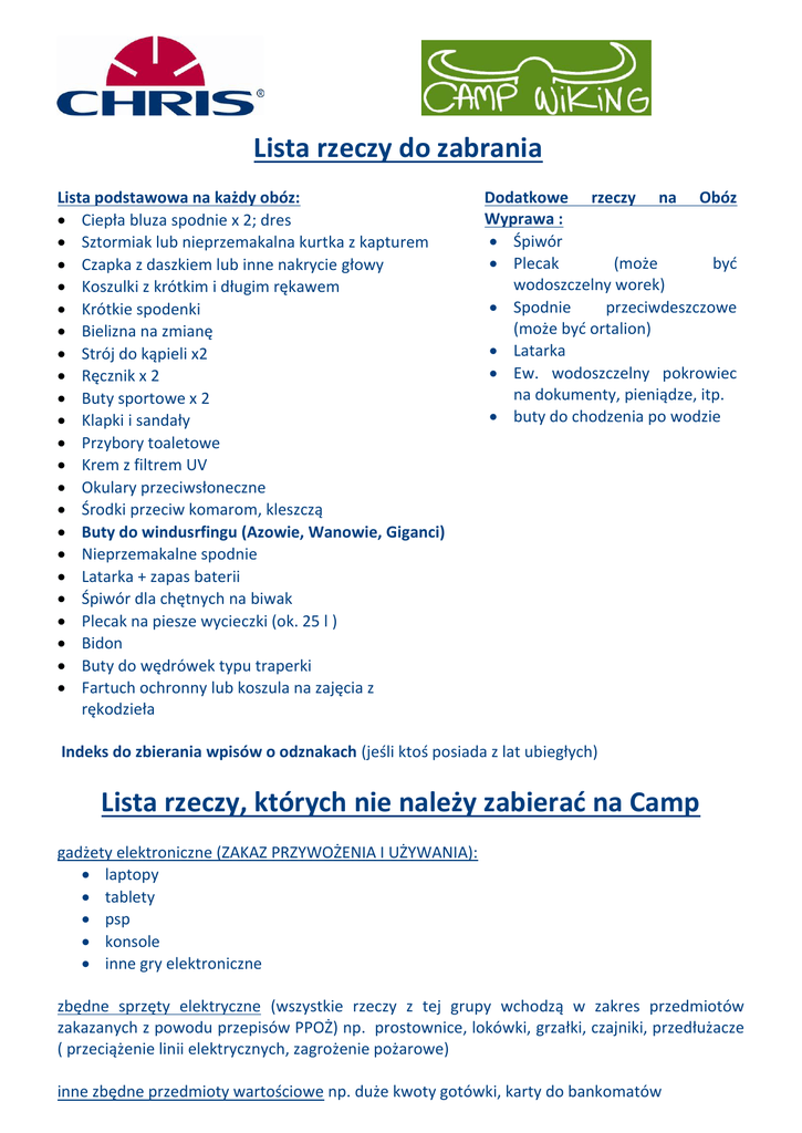 Lista rzeczy do zabrania Lista podstawowa na każdy obóz: Ciepła bluza spodnie x 2; dres Sztormiak lub nieprzemakalna kurtka z kapturem Czapka z daszkiem lub inne nakrycie głowy Koszulki z krótkim i długim rękawem Krótkie spodenki Bielizna na zmianę Strój do kąpieli x2 Ręcznik x 2 Buty sportowe x 2 Klapki i sandały Przybory toaletowe Krem z filtrem UV Okulary przeciwsłoneczne Środki przeciw komarom, kleszczą Buty do windusrfingu (Azowie, Wanowie, Giganci) Nieprzemakalne spodnie Latarka + zapas baterii Śpiwór dla chętnych na biwak Plecak na piesze wycieczki (ok. 25 l ) Bidon Buty do wędrówek typu traperki Fartuch ochronny lub koszula na zajęcia z rękodzieła Dodatkowe rzeczy na Obóz Wyprawa : Śpiwór Plecak (może być wodoszczelny worek) Spodnie przeciwdeszczowe (może być ortalion) Latarka Ew. wodoszczelny pokrowiec na dokumenty, pieniądze, itp. buty do chodzenia po wodzie Indeks do zbierania wpisów o odznakach (jeśli ktoś posiada z lat ubiegłych) Lista rzeczy, których nie należy zabierać na Camp gadżety elektroniczne (ZAKAZ PRZYWOŻENIA I UŻYWANIA): laptopy tablety psp konsole inne gry elektroniczne zbędne sprzęty elektryczne (wszystkie rzeczy z tej grupy wchodzą w zakres przedmiotów zakazanych z powodu przepisów PPOŻ) np. prostownice, lokówki, grzałki, czajniki, przedłużacze ( przeciążenie linii elektrycznych, zagrożenie pożarowe) inne zbędne przedmioty wartościowe np. duże kwoty gotówki, karty do bankomatów inne: scyzoryki, inne ostre narzędzia chipsy, napoje gazowane Telefony komórkowe Przypominamy o wprowadzonym ograniczeniu w korzystaniu z telefonów komórkowych przez dzieci i młodzież na terenie Campu Wiking. Z telefonów komórkowych uczestnicy będą mogli korzystać w każdą środę i sobotę w trakcie przerwy obiadowej. Poza tym czasem telefony będą zdeponowane w campowym sejfie. * Prosimy aby dzieci brały udział w pakowaniu swoich rzeczy co ułatwia zidentyfikowanie pozostawionych rzeczy podczas trwania obozu. Szczególnie przy młodszych dzieciach prosimy o podpisywanie rzeczy (IMIENIEM I NAZWISKIEM), co zminimalizuje ryzyko ich zagubienia lub stworzenie i spakowanie dziecku listy rzeczy które zabiera, co pomoże mu skompletować rzeczy na zakończenie obozu UWAGA! Na obóz przyjmowane są dzieci zdrowe. Jeśli dziecko w dniu wyjazdu jest chore ( ma gorączkę, przyjmuje leki) prosimy o dowóz dziecka kilka dni później. Prosimy również o sprawdzenie głowy dziecka pod kątem wszawicy. To pozwoli na uniknięcie rozprzestrzeniania się chorób zakaźnych i wszy wśród innych uczestników. Z racji ograniczonego miejsca w lukach bagażowy bardzo prosimy o zabieranie bagażu o wadze około 20 kg i walizek o rozmiarze M (średnia) o maksymalnych wymiarach 45x25x65. Adres: Ośrodek Szkoleniowo-Wypoczynkowy ZHP „Perkoz”, 11-015 Olsztynek, ul. Waszeta 1, tel: 735-010-637; 735-010-643 Kontakt z dzieckiem: telefoniczny - najlepiej w porze posiłków. Godziny podane będą na stronie internetowej www.chris.com.pl w pierwszy poniedziałek po rozpoczęciu turnusu. Zakwaterowanie: prosimy o podanie nazwisk dzieci do wspólnego zakwaterowania na karcie kwalifikacyjnej lub poprzez kontakt mailowy lub telefoniczny z BOK, nie później niż na dwa tygodnie przed rozpoczęciem obozu. Przy realizacji zakwaterowania bierzemy pod uwagę datę przyjęcia zgłoszenia. Informujemy również, że w miarę możliwości staramy się zrealizować w tym zakresie wszystkie Państwa prośby.