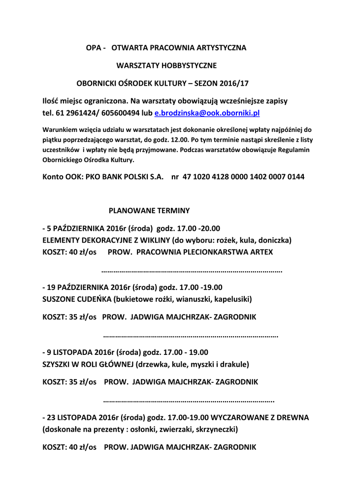 OPA - OTWARTA PRACOWNIA ARTYSTYCZNA WARSZTATY HOBBYSTYCZNE OBORNICKI OŚRODEK KULTURY – SEZON 2016/17 Ilość miejsc ograniczona. Na warsztaty obowiązują wcześniejsze zapisy tel. 61 2961424/ 605600494 lub [email protected] Warunkiem wzięcia udziału w warsztatach jest dokonanie określonej wpłaty najpóźniej do piątku poprzedzającego warsztat, do godz. 12.00. Po tym terminie nastąpi skreślenie z listy uczestników i wpłaty nie będą przyjmowane. Podczas warsztatów obowiązuje Regulamin Obornickiego Ośrodka Kultury. Konto OOK: PKO BANK POLSKI S.A. nr 47 1020 4128 0000 1402 0007 0144 PLANOWANE TERMINY - 5 PAŹDZIERNIKA 2016r (środa) godz. 17.00 -20.00 ELEMENTY DEKORACYJNE Z WIKLINY (do wyboru: rożek, kula, doniczka) KOSZT: 40 zł/os PROW. PRACOWNIA PLECIONKARSTWA ARTEX ………………………………………………………………………………. - 19 PAŹDZIERNIKA 2016r (środa) godz. 17.00 -19.00 SUSZONE CUDEŃKA (bukietowe rożki, wianuszki, kapelusiki) KOSZT: 35 zł/os PROW. JADWIGA MAJCHRZAK- ZAGRODNIK ……………………………………………………………………………. - 9 LISTOPADA 2016r (środa) godz. 17.00 - 19.00 SZYSZKI W ROLI GŁÓWNEJ (drzewka, kule, myszki i drakule) KOSZT: 35 zł/os PROW. JADWIGA MAJCHRZAK- ZAGRODNIK ………………………………………………………………………….. - 23 LISTOPADA 2016r (środa) godz. 17.00-19.00 WYCZAROWANE Z DREWNA (doskonałe na prezenty : osłonki, zwierzaki, skrzyneczki) KOSZT: 40 zł/os PROW. JADWIGA MAJCHRZAK- ZAGRODNIK - 7 GRUDNIA 2016r (środa) godz. 17.00- 19.00 ARTYSTYCZNE BOMBKI NA ŚWIĘTA (doskonałe na prezenty i dekoracje, bombki styropianowe ozdabiane różnymi materiałami i produktami – kasza, makaron, kawa, wstążki, koraliki) KOSZT: 40 zł/os PROW. AGATA NOWICKA …………………………………………………………………………….. - 11 STYCZNIA 2017r (środa) godz. 17.00-19.00 KWIATY I MOTYLE Z MAKARONU NA RÓŻNE OKAZJE (np. na DZIEŃ BABCI – róża, tulipan i inne) KOSZT: 40 zł/os PROW. AGATA NOWICKA …………………………………………………………………………. 25 STYCZNIA 2017r (środa) godz. 17.30 – 19.30 WARSZTATY TANECZNETAŃCE I ZABAWY INTEGRACYJNE DLA MAŁYCH I DUŻYCH ( z rekwizytami i bez) KOSZT: 30 zł/os PROW. ELŻBIETA BRODZIŃSKA …………………………………………………………………………. 22 LUTEGO 2017r (środa) godz. 17.00- 19.00 METALOPLASTYKA (propozycje, które można wykorzystać na zajęciach z dziećmi) KOSZT: 40 zł/os PROW. JADWIGA MAJCHRZAK- ZAGRODNIK ………………………………………………………………………….. 15 MARCA 2017r (środa) godz. 17.00-19.00 GUZIKI, GUZICZKI W PRACACH PLASTYCZNYCH DZIECI KOSZT: 35 zł/os PROW. JADWIGA MAJCHRZAK- ZAGRODNIK …………………………………………………………………………. 29 MARCA 2017r (środa) godz. 17.00-19.00 WARSZTATY MYDLANE (czyli jak wykonać wg własnego pomysłu kolorowe, pachnące mydełka glicerynowenp. dla siebie lub na prezent. Forma zabawy, którą można realizować na zajęciach z dziećmi) KOSZT: 35 zł/os PROW. IWONA RYPIŃSKA 19 KWIETNIA 2017r (środa) MODELINOWE BIBELOTY (nakładki na przybory, wisiory, broszki) KOSZT: 35 zł/os PROW. JADWIGA MAJCHRZAK- ZAGRODNIK ……………………………………………………………………………… 10 MAJA 2017r (środa) ŚWIAT MOBILI (przestrzenne dekoracje z wykorzystaniem gałęzi brzozy, wierzby i wikliny) KOSZT: 35 zł/os PROW. JADWIGA MAJCHRZAK- ZAGRODNIK …………………………………………………………………………… 24 MAJA 2017r (środa) WARSZTATY NIESPODZIANKA ( temat i cena podane zostaną w styczniu 2017) ZAPRASZAMY
