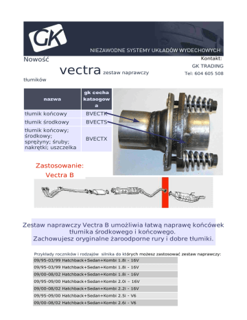 Kontakt: Nowość vectra GK TRADING zestaw naprawczy Tel: 604 605 508 tłumików nazwa gk cecha kataogow a tłumik końcowy BVECTK tłumik środkowy BVECTS tłumik końcowy; środkowy; sprężyny; śruby; nakrętki; uszczelka BVECTX Zastosowanie: Vectra B Zestaw naprawczy Vectra B umożliwia łatwą naprawę końcówek tłumika środkowego i końcowego. Zachowujesz oryginalne żaroodporne rury i dobre tłumiki. Przykłady roczników i rodzajów silnika do których możesz zastosować zestaw naprawczy: 09/95-03/99 Hatchback+Sedan+Kombi 1.8i - 16V 09/95-03/99 Hatchback+Sedan+Kombi 1.8i - 16V 09/00-08/02 Hatchback+Sedan+Kombi 1.8i - 16V 09/95-09/00 Hatchback+Sedan+Kombi 2.0i – 16V 09/00-08/02 Hatchback+Sedan+Kombi 2.2i - 16V 09/95-09/00 Hatchback+Sedan+Kombi 2.5i - V6 09/00-08/02 Hatchback+Sedan+Kombi 2.6i - V6