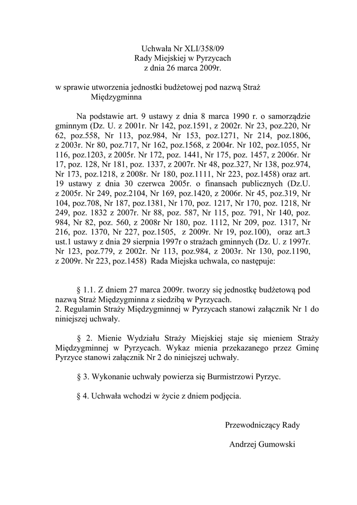 Uchwała Nr XLI/358/09 Rady Miejskiej w Pyrzycach z dnia 26 marca