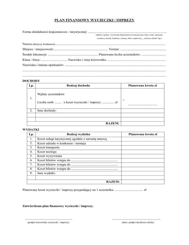 PLAN FINANSOWY WYCIECZKI / IMPREZY Forma działalności krajoznawczo - turystycznej: .............................................................................................. (należy wpisać: wycieczka krajoznawczo-turystyczna, kino, teatr, muzeum, wystawa, biwak, konkurs, turniej, obóz wędrowny, ,,zielona szkoła" itp.) Nazwa (dotyczy konkursu):.................................................................................................................................... Miejsce / miejscowość:................................................................. Termin: ....................................................... Środek lokomocji: ............................................................ Planowana liczba uczestników: ............................. Klasa / klasy: ............................... Nazwisko i imię kierownika: ...................................................................... Nazwiska i imiona opiekunów: ......................................................................................................................... ............................................................................................................................................................................ ............................................................................................................................................................................ DOCHODY Lp. Planowana kwota zł Rodzaj dochodu Wpłaty uczestników 1. Liczba osób ......... x koszt wycieczki / imprezy ............... zł 2. = ................................... Inne dochody: RAZEM: WYDATKI Planowana kwota zł Lp. Rodzaj wydatku 1. 2. 3. 4. 5. 6. 7. 8. 9. Koszt usługi turystycznej zgodnie z zawartą umową Koszt udziału w konkursie / turnieju Koszt transportu Koszt noclegu Koszt wyżywienia Koszt biletów wstępu do ........................................................ Koszt biletów wstępu do ........................................................ Koszt biletów wstępu do ........................................................ Inne wydatki: RAZEM: Planowany koszt wycieczki / imprezy przypadający na 1 uczestnika: .................................. zł Zatwierdzam plan finansowy wycieczki / imprezy. ...................................................... (podpis kierownika wycieczki / imprezy) ....................................................... (data i podpis dyrektora szkoły)