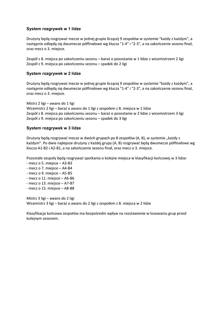System rozgrywek w 1 lidze Drużyny będą rozgrywać mecze w jednej grupie liczącej 9 zespołów w systemie "każdy z każdym", a następnie odbędą się dwumecze półfinałowe wg klucza "1-4" i "2-3", a na zakończenie sezonu finał, oraz mecz o 3. miejsce. Zespół z 8. miejsca po zakończeniu sezonu – baraż o pozostanie w 1 lidze z wicemistrzem 2 ligi Zespół z 9. miejsca po zakończeniu sezonu – spadek do 2 ligi System rozgrywek w 2 lidze Drużyny będą rozgrywać mecze w jednej grupie liczącej 9 zespołów w systemie "każdy z każdym", a następnie odbędą się dwumecze półfinałowe wg klucza "1-4" i "2-3", a na zakończenie sezonu finał, oraz mecz o 3. miejsce. Mistrz 2 ligi – awans do 1 ligi Wicemistrz 2 ligi – baraż o awans do 1 ligi z zespołem z 8. miejsca w 1 lidze Zespół z 8. miejsca po zakończeniu sezonu – baraż o pozostanie w 2 lidze z wicemistrzem 3 ligi Zespół z 9. miejsca po zakończeniu sezonu – spadek do 3 ligi System rozgrywek w 3 lidze Drużyny będą rozgrywać mecze w dwóch grupach po 8 zespołów (A, B), w systemie „każdy z każdym”. Po dwie najlepsze drużyny z każdej grupy (A, B) rozgrywać będą dwumecze półfinałowe wg klucza A1-B2 i A2-B1, a na zakończenie sezonu finał, oraz mecz o 3. miejsce. Pozostałe zespoły będą rozgrywać spotkania o kolejne miejsca w klasyfikacji końcowej w 3 lidze: - mecz o 5. miejsce – A3-B3 - mecz o 7. miejsce – A4-B4 - mecz o 9. miejsce – A5-B5 - mecz o 11. miejsce – A6-B6 - mecz o 13. miejsce – A7-B7 - mecz o 15. miejsce – A8-B8 Mistrz 3 ligi – awans do 2 ligi Wicemistrz 3 ligi – baraż o awans do 2 ligi z zespołem z 8. miejsca w 2 lidze Klasyfikacja końcowa zespołów ma bezpośredni wpływ na rozstawienie w losowaniu grup przed kolejnym sezonem.