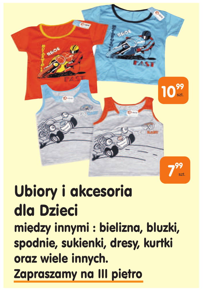 99 10 7 szt. 99 szt. Ubiory i akcesoria dla Dzieci miedzy innymi : bielizna, bluzki, spodnie, sukienki, dresy, kurtki oraz wiele innych. Zapraszamy na III pietro