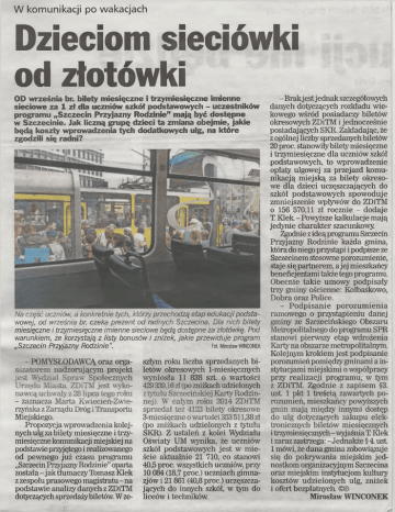 W komunikacji po wakacjach Dzieciom sieciówki od złotówki OD września br. bilety miesięczne i trzymiesięczne imienne sieciowe za 1 zł dla uczniów szkół podstawowych - uczestników programu „Szczecin Przyjazny Rodzinie” mają być dostępne w Szczecinie. Jak liczną grupę dzieci ta zmiana obejmie, jakie będą koszty wprowadzenia tych dodatkowych ulg, na które zgodzili się radni? Na część uczniów, a konkretnie tych, którzy przechodzą etap edukacji podsta wowej, od września br. czeka prezent od radnych Szczecina. Dla nich bilety miesięczne i trzymiesięczne imienne sieciowe będą dostępne za ztotówkę. Pod warunkiem, ze korzystają z listy bonusów i zniżek, jakie przewiduje program „ Szczecin Przyjazny R o d z i n i e Fot. Mirosław w in c o n e k - POMYSŁODAWCĄ oraz orga nizatorem nadzorującym projekt jest Wydział Spraw Społecznych Urzędu Miasta. ZDiTM jest wyko nawcą uchwały z 28 lipca tego roku - zaznacza Marta Kwiecień-Zwierzyńska z Zarządu Dróg i Transportu Miejskiego. Propozycja wprowadzenia kolej nych ulg za bilety miesięczne i trzy miesięczne komunikacji miejskiej na podstawie przyjętego i realizowanego od pewnego już czasu programu „Szczecin Przyjazny Rodzinie” oparta została - jak tłumaczy Tomasz Klek z zespołu prasowego magistratu - na podstawie analizy danych z ZDiTM dotyczących sprzedaży biletów. W ze szłym roku liczba sprzedanych bi letów okresowych 1-miesięcznych wyniosła 11 838 szt. o wartości 429 339.16 zł (po zniżkach udzielonych ztytułu Szczecińskiej Karty Rodzin nej). W całym roku 2014 ZDiTM sprzedał też 4123 bilety okresowe 3-miesięczne o wartości 353 511,38 zł (po zniżkach udzielonych z tytułu SKR). Z ustaleń z kolei Wydziału Oświaty UM wynika, że uczniów szkół podstawowych jest w mie ście aktualnie 21 710, co stanowi 40,5 proc. wszystkich uczniów, przy 10 084 (18,7 proc.) uczniach gimna zjów i 21861 (40,8 proc.) uczęszcza jących do innych szkół, w tym do liceów i techników. -Brakjest jednak szczegółowych danych dotyczących rozkładu wie kowego wśród posiadaczy biletów okresowych ZDiTM i jednocześnie posiadających SKR. Zakładając, że z ogólnej liczby sprzedanych biletów 20 proc. stanowiły bilety miesięczne i trzymiesięczne dla uczniów szkół podstawowych, to wprowadzenie opłaty ulgowej za przejazd komu nikacją miejską za bilety okreso we dla dzieci uczęszczających do szkół podstawowych spowoduje zmniejszenie wpływów do ZDilM 0 156 570,11 zł rocznie - dodaje T. K e k - Powyższe kalkulacje mają jedynie charakter szacunkowy. Zgodnie z ideą programu Szczecin Przyjazny Rodzime każda gmina, która do niego przystąpi i podpisze ze Szczecinem stosowne porozumienie, staje się partnerem, a jej mieszkańcy beneficjentami także tego programu. Obecnie takie umowy podpisały trzy gminy ościenne: Kołbaskowo, Dobra oraz Police. - Podpisanie porozumienia ramowego o przystąpieniu danej gminy ze Szczecińskiego Obszaru Metropolitalnego do programu SPR stanowi pierwszy etap wdrożenia Karty na obszarze metropolitalnym. Kolejnym krokiem jest podpisanie porozumień pomiędzy gminami a in stytucjami miejskimi o współpracy przy realizacji programu, w tym z ZDiTM. Zgodnie z zapisem §3. ust 1 pkt 1 treścią zawartych po rozumień, mieszkańcy powyższych gmin mają między innymi dostęp do ulg dotyczących zakupu elek tronicznych biletów miesięcznych itrzymiesięcznych-wyjaśniaT. Kek 1zaraz zastrzega: - Jednakże §4. ust 1 mówi, że dana gmina zobowiązuje się do pokrywania miejskim jed nostkom organizacyjnym Szczecina oraz miejskim instytucjom kultury kosztów udzielonych ulg, zniżek i ofert bezpłatnych. ©® Mirosław WINCONEK