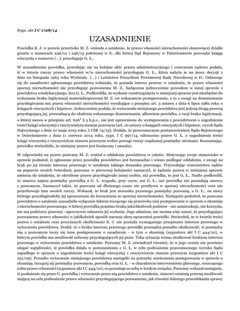 Sygn. akt I C 1728/14 UZASADNIENIE Powódka K. J. w pozwie przeciwko M. Z. wniosła o ustalenie, że prawo własności nieruchomości stanowiącej działki gruntu o numerach 246/12 i 246/13 położonej w S., dla której Sąd Rejonowy w Dzierżoniowie prowadzi księgę wieczystą o numerze (...), przysługuje G. Ł.. W uzasadnieniu powódka, powołując się na kolejne akty prawa administracyjnego i orzeczenia sądowe podała, iż w istocie rzeczy prawo własności w/w nieruchomości przysługuje G. Ł., która nabyła je na mocy decyzji z dnia 20 listopada 1963 roku Wydziału (...) i Leśnictwa Prezydium Powiatowej Rady Narodowej w D.. Odnosząc się do zasadności zgłoszonego powództwa wskazała, że posiada interes prawny w ustaleniu, że prawo własności spornej nieruchomości nie przysługuje pozwanemu M. Z., będącemu jednocześnie powodem w innej sprawie z powództwa windykacyjnego, lecz G. Ł.. Podkreśliła, że wydanie rozstrzygnięcia w niniejszej sprawie jest niezbędne do wykazania braku legitymacji materialnoprawnej M. Z. we wskazanym postępowaniu, a to z uwagi na domniemanie przysługiwania mu prawa własności nieruchomości wynikające z przepisu art. 3 ustawy z dnia 6 lipca 1982 roku o księgach wieczystych i hipotece. Jednocześnie podała, że wytoczenie niniejszego powództwa jest jedyną drogą prawną przysługującą jej, prowadzącą do obalenia wskazanego domniemania, albowiem powódka, z racji braku legitymacji, o której mowa w przepisie art. 6262 § 5 k.p.c., nie jest uprawniona do występowania z powództwem o uzgodnienie treści księgi wieczystej z rzeczywistym stanem prawnym (art. 10 ustawy o księgach wieczystych i hipotece, wyrok Sądu Najwyższego z dnia 10 maja 2013 roku, I CSK 74/13). Dodała, że prawomocnym postanowieniem Sądu Rejonowego w Dzierżoniowie z dnia 11 czerwca 2014 roku, sygn. I C 997/14, odrzucono pozew G. Ł. o uzgodnienie treści księgi wieczystej z rzeczywistym stanem prawnym wobec powagi rzeczy osądzonej pomiędzy stronami. Reasumując, powódka stwierdziła, że niniejszy pozew jest konieczny i zasadny. W odpowiedzi na pozew pozwany M. Z. wniósł o oddalenie powództwa w całości. Motywując swoje stanowisko w sprawie podniósł, iż zgłoszone przez powódkę powództwo jest bezzasadne i winno podlegać oddaleniu, z uwagi na brak po jej stronie interesu prawnego w ustaleniu takiego stosunku prawnego. Przywołując orzecznictwo sądów na poparcie swoich twierdzeń, pozwany w pierwszej kolejności zaznaczył, iż żądanie pozwu w niniejszej sprawie zmierza do ustalenia, że określone prawo przysługiwało innej osobie, niż powódka, to jest G. Ł.. Nadto podkreślił, że umowa najmu pomiędzy powódką a G. Ł. wygasła, przy czym, ani G. Ł., ani powódka nie posiadają umowy z pozwanym. Zaznaczył także, że pozwana od dłuższego czasu nie przebywa w spornej nieruchomości oraz nie przechowuje tam swoich rzeczy. Wskazał, że brak jest stosunku prawnego pomiędzy pozwaną, a G. Ł., na mocy którego przysługiwałoby jej uprawnienie do korzystania ze spornej nieruchomości. Następnie podniósł, że pozwana powództwo o ustalenie uzasadniła wyłącznie faktem toczącego się przeciwko niej postępowania w sprawie o eksmisję z nieruchomości pozwanego, w której powódka pomimo braku jakichkolwiek podstaw - nie zamieszkuje, nie korzysta, nie ma podstawy prawnej - uporczywie odmawia jej wydania. Jego zdaniem, nie można więc uznać, że przysługujące pozwanemu prawo własności w jakikolwiek sposób narusza sferę uprawnień powódki. Stwierdził, że w świetle treści pozwu o ustalenie oraz powyższych okoliczności K. J. nie posiada wymaganego przepisami interesu prawnego w wytoczeniu powództwa. Dodał, że o braku interesu prawnego powódki przesądza ponadto okoliczność, iż pomiędzy nią a pozwanym toczy się inne postępowanie o zasądzenie - w tym o eksmisję (sygnatura akt I C 444/10), w którym powódka ma możliwość ochrony przysługujących jej praw. Taka sytuacja winna skutkować brakiem interesu prawnego w wytoczeniu powództwa o ustalenie. Pozwany M. Z. oświadczył również, że w jego ocenie nie powinno ulegać wątpliwości, iż powódka działa w porozumieniu z G. Ł. w celu podważenia prawomocnego wyroku Sądu zapadłego w sprawie o uzgodnienie treści księgi wieczystej z rzeczywistym stanem prawnym (sygnatura akt I C 251/09). Ponadto wytoczenie niniejszego powództwa nastąpiło na potrzeby zawieszenia postępowania w sprawie o eksmisję, toczącej się pomiędzy pozwanym, powódką oraz G. Ł. - w charakterze interwenienta głównego, roszczącego sobie prawo własności (sygnatura akt I C 444/10), co pozostaje ze sobą w ścisłym związku. Pozwany wskazał następnie, iż posłużenie się przez G. powódką i wytoczenie przez nią powództwa o ustalenie, stanowi ostatnią prawną możliwość mającą na celu podważenie prawa własności przysługującego pozwanemu, jak również dalszego przewlekania sprawy o eksmisję. Na tę okoliczność wskazał, iż G. Ł. podejmowała wielokrotne próby podważenia wyroku zapadłego w postępowaniu o uzgodnienie treści księgi wieczystej z rzeczywistym stanem prawnym, a co za tym idzie powodowała przewlekłość sprawy o eksmisję powódki z nieruchomości pozwanego. Nadto za taką oceną przemawiają - jego zdaniem – przywołane w odpowiedzi na pozew - działania G. Ł., jako interwenienta w sprawie o eksmisję, zmierzające do przeciągania w/w postępowania. Pozwany skonstatował, że w sytuacji, w której ostatni wniosek G. w sprawie o eksmisję - o zawieszenie postępowania, został przez Sąd oddalony, wniesiono niniejszy pozew, by natychmiast po tym ponownie wnioskować o zawieszenie postępowania w tamtym procesie (wniosek powódki z dnia 12 października 2014 roku o zawieszenie postępowania). Mając na względzie powyższe, oczywistym pozostaje, iż G. Ł. z uwagi na oddalenie kolejnego wniosku o zawieszenie postępowania