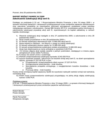 Poznań, dnia 29 października 2009 r. RAPORT BIEśĄCY NUMER 34/2009 Zakończenie subskrypcji akcji serii D. Działając na podstawie § 33 ust. 1 Rozporządzenia Ministra Finansów z dnia 19 lutego 2009 r. w sprawie informacji bieŜących i okresowych przekazywanych przez emitentów papierów wartościowych oraz warunków uznawania za równowaŜne informacji wymaganych przepisami prawa państwa niebędącego państwem członkowskim, Zarząd BBI Zeneris NFI S.A. przedstawia pełną informację nt. zakończonej subskrypcji prywatnej akcji serii D, wyemitowanych na kapitał zakładowy w ramach kapitału docelowego. 1) Otwarcie subskrypcji akcji nastąpiło w dniu 27 października 2009, a zakończenie w dniu 28 października 2009 r.; 2) Akcje zostały przydzielone w dniu 28 października 2009 r.; 3) W ramach subskrypcji oferowanych było 12.680.000 akcji serii D; 4) Stopa redukcji w zapisach - nie dotyczy z uwagi na rodzaj subskrypcji; 5) W ramach subskrypcji złoŜono zapisy na 12.680.000 akcji; 6) W ramach przeprowadzonej subskrypcji zostało przydzielone 12.680.000 akcji; 7) Akcje były obejmowane po cenie emisyjnej w wysokości 0,65 PLN; 8) i 9) Umowy objęcia akcji zostały zawarte z jednym podmiotem, działającym w imieniu pięciu zarządzanych przez siebie Funduszy; 10) Fundusz nie zawarł umów o subemisję; 11) Wartość przeprowadzonej subskrypcji wyniosła: 8.242.000 PLN; 12) Łączna wysokość kosztów, zaliczonych do kosztów emisji akcji serii D, na dzień sporządzenia raportu, wyniosła 27.227,00 PLN, w tym: a. Przygotowanie i przeprowadzenie oferty wynosi: 27.227,00 PLN, b. Wynagrodzenie subemitentów – brak kosztów, c. Sporządzenia prospektu emisyjnego, z uwzględnieniem kosztów doradztwa – brak kosztów, d. Promocja oferty – brak kosztów. Koszty emisji zmniejszą kapitał zapasowy Spółki do wysokości nadwyŜki wartości emisji nad wartością nominalną akcji. 13) Średni koszt przeprowadzenia subskrypcji przypadający na jedną akcję objętą subskrypcją wynosi: 0,002 PLN. Podstawa prawna: § 33 ust. 1 Rozporządzenia Ministra Finansów z dnia 19 lutego 2009 r. w sprawie informacji bieŜących i okresowych przekazywanych przez emitentów papierów wartościowych. _________________ Robert Bender Prezes Zarządu _________________ Marek Perczyński Wiceprezes Zarządu