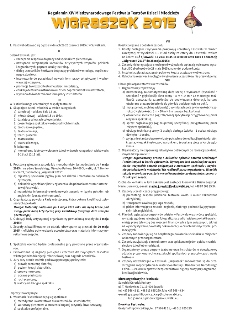 Regulamin XIV Międzynarodowego Festiwalu Teatrów Dzieci i Młodzieży WIGRASZEK 2015 I 1. Festiwal odbywać się będzie w dniach 22-25 czerwca 2015 r. w Suwałkach. II Celem Festiwalu jest: • zachęcenie zespołów do pracy nad spektaklem plenerowym, • nawiązanie wzajemnych kontaktów artystycznych zespołów polskich i zagranicznych, poprzez sztukę teatralną, • dialog uczestników Festiwalu dotyczący problemów młodego, współczesnego człowieka, • inspirowanie do poszukiwań nowych form pracy artystycznej i wychowawczej w zespole, • promocja twórczości teatralnej dzieci i młodzieży, • edukacja teatralna instruktorów i dzieci poprzez udział w warsztatach, • wymiana doświadczeń oraz form pracy instruktorów. III W Festiwalu mogą uczestniczyć zespoły teatralne: 1. Skupiające dzieci i młodzież w dwóch kategoriach: a) dziecięcej – wiek od 5 do 12 lat, b) młodzieżowej – wiek od 13 do 19 lat. 2. działające w krajach całego świata. 3. prezentujące spektakle w różnorodnych formach: a) teatru żywego planu, b) teatru animacji, c) teatru piosenki, d) teatru ruchu, e) teatru ulicznego, f) kabaretu, g) monodramu (dotyczy wyłącznie dzieci w dwóch kategoriach wiekowych: 5-11 lat i 12-15 lat). IV 1. Podstawą zgłoszenia zespołu lub monodramisty, jest nadesłanie do 4 maja 2015 r. na adres Suwalskiego Ośrodka Kultury, 16-400 Suwałki, ul. T. Noniewicza 71, z adnotacją „Wigraszek 2015”: a) rejestracji spektaklu (ogólny plan bez zbliżeń i montażu) na nośnikach cyfrowych, b) dokładnie wypełnionej karty zgłoszenia (do pobrania na stronie internetowej Festiwalu), c) materiałów informacyjno-reklamowych zespołu w języku polskim lub angielskim (pocztą elektroniczną). 2. Organizatorzy powołają Radę Artystyczną, która dokona kwalifikacji zgłoszonych spektakli. Uwaga: Materiały nadesłane po 4 maja 2015 roku nie będą brane pod uwagę przez Radę Artystyczną przy kwalifikacji (decyduje data stempla pocztowego). 3. O decyzji Rady Artystycznej organizatorzy powiadomią zespoły do 8 maja 2015 r. 4. Zespoły zakwalifikowane do udziału obowiązane są przesłać do 20 maja 2015 r. oficjalne potwierdzenie uczestnictwa oraz materiały informacyjnoreklamowe zespołu. V 1. Spektakle oceniać będzie profesjonalne jury powołane przez organizatorów. 2. Przewidziane są nagrody pieniężne i rzeczowe dla zwycięskich zespołów w kategoriach: dziecięcej i młodzieżowej oraz nagroda Grand Prix. 3. Jury przy ocenie weźmie pod uwagę następujące kryteria: a) prawdę sceniczną aktorów, b) poziom kreacji aktorskich, c) oprawę muzyczną, d) oprawę plastyczną, e) ruch sceniczny, f) walory edukacyjne spektaklu. VI Imprezy towarzyszące. 1. W ramach Festiwalu odbędą się spotkania: a) metodyczne i warsztatowe dla uczestników i instruktorów, b) warsztaty plenerowe w otoczeniu bogatej przyrody Suwalszczyzny, c) spektakle profesjonalne. VII Koszty związane z pobytem zespołu. 1. Koszty noclegów i wyżywienia pokrywają uczestnicy Festiwalu w ramach akredytacji w wysokości 315 zł od osoby za cztery dni Festiwalu. Wpłata na konto: BGŻ o/Suwałki 12 2030 0045 1110 0000 0250 1810 z adnotacją „Wigraszek 2015” do 28 maja 2015 r. 2. Zespoły niekorzystające z noclegów i wyżywienia wpłacają wpisowe w wysokości 50 zł od osoby do 28 maja 2015 r. na wyżej podane konto. 3. Instytucja zgłaszająca zespół pokrywa koszty przejazdu w obie strony. 4. Odwołania rezerwacji noclegów i wyżywienia uczestników nie przewidujemy. VIII Obowiązki organizatorów i uczestników. 1. Organizatorzy zapewniają: a) nowoczesną, zautomatyzowaną dużą scenę o wymiarach (wysokość × szerokość × głębokość): okno sceny – 8 m × 14 m × 12 m (uwaga: możliwość opuszczania sztankietów do podwieszenia dekoracji, kurtyna otwierana przez podniesienie do góry lub podciągnięcie na boki), b) małą scenę (z mobilną widownią) o wymiarach pola gry (wysokość × szerokość × głębokość): 6 m × 10 m × 5 m (uwaga: bez kurtyny), c) oświetlenie sceniczne (wg załączonej specyfikacji przygotowanej przez reżysera spektaklu), d) sprzęt nagłaśniający (wg załączonej specyfikacji przygotowanej przez reżysera spektaklu), e) obsługę techniczną sceny (2 osoby): obsługa światła – 1 osoba, obsługa dźwięku – 1 osoba, f) wyłącznie standardowe rekwizyty potrzebne do realizacji spektaklu: stół, krzesła, wieszak i lustro, pod warunkiem, że zostaną ujęte w karcie zgłoszenia. 2. Organizatorzy nie zapewniają rekwizytów potrzebnych do realizacji spektaklu innych niż w punkcie 1f. Uwaga: organizatorzy proszą o dokładne opisanie potrzeb scenicznych i technicznych w karcie zgłoszenia. Wymagane jest wcześniejsze uzgodnienie wszystkich potrzeb związanych z montażem spektaklu i uzyskanie potwierdzenia możliwości ich realizacji przez organizatora. Wszelkie szkody materialne powstałe w wyniku montażu czy demontażu scenografii pokrywa zespół. Osobą do kontaktu w tym zakresie jest zastępca kierownika Działu Logistyki Maciej Jurewicz, e-mail: [email protected] [email protected], tel. +48 87 563 85 34. 3. Zespoły uczestniczące przygotowują: a) prezentację zespołu (działanie teatralne około 3 minut zakończone okrzykiem), b) transparent zawierający logo zespołu, c) plakat informujący o zespole i regionie, z którego pochodzi (w języku polskim lub angielskim). 4. Placówki zgłaszające zespoły do udziału w Festiwalu oraz twórcy spektaklu wyrażają zgodę na rejestrację fotograficzną, audio i wideo spektakli oraz ich emisję przez telewizję bez roszczeń finansowych z tym związanych, jak też na wykorzystywanie powstałej dokumentacji w celach metodycznych i promocyjnych. 5. Zespoły zobowiązują się do bezpłatnego pokazania spektaklu w miejscach wskazanych przez organizatora. 6. Zespoły przyjeżdżają z instruktorem oraz opiekunem (jeden opiekun na dziesięcioro dzieci lub młodzieży). 7