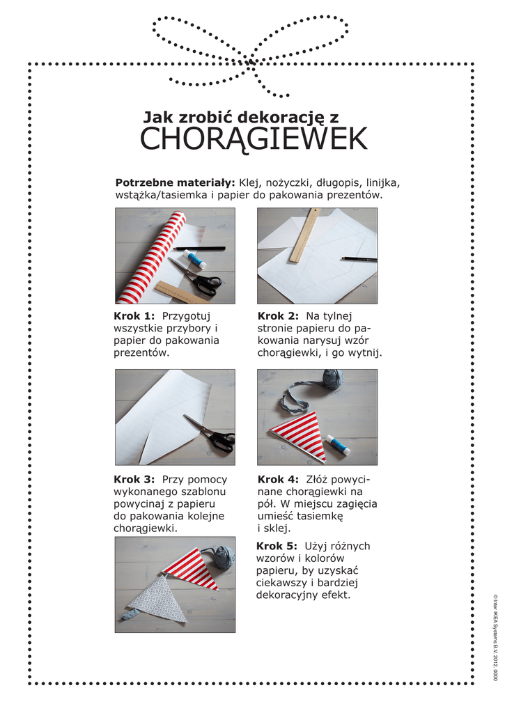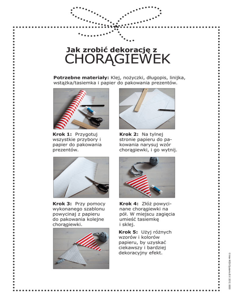 Jak zrobić dekorację z CHORĄGIEWEK Potrzebne materiały: Klej, nożyczki, długopis, linijka, wstążka/tasiemka i papier do pakowania prezentów. Krok 1: Przygotuj wszystkie przybory i papier do pakowania prezentów. Krok 2: Na tylnej stronie papieru do pakowania narysuj wzór chorągiewki, i go wytnij. Krok 3: Przy pomocy wykonanego szablonu powycinaj z papieru do pakowania kolejne chorągiewki. Krok 4: Złóż powycinane chorągiewki na pół. W miejscu zagięcia umieść tasiemkę i sklej. © Inter IKEA Systems B.V. 2012. 0000 Krok 5: Użyj różnych wzorów i kolorów papieru, by uzyskać ciekawszy i bardziej dekoracyjny efekt.