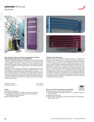 zehnder forma air Opis produktu Opis zasilanie wodne + wentylator dogrzewajcy azienkH interwencyjnie, gdy ukad c.o. jest wyczony Grzejnik łazienkowy dekoracyjny Zehnder Forma Air zbudowany jest z poziomo ułożonych okrągłych rur o średnicy ø 25 mm oraz pionowych okrągłych kolektorów o średnicy ø 38 mm, połączonych przy użyciu precyzyjnego spawania krzyżowego. Moc grzewcza zgodna z EN 442, oznakowanie CE. Podłączenie dolne dla zasilania i powrotu, lewe oraz prawe. Dodatkowy atut to estetycznie schowany za grzejnikiem wentylator, pozwalający na szybkie dogrzanie łazienki. Zasilanie 230 Volt +/- 10 % dla wentylatora grzewczego, kabel przyłączeniowy o długości 1,2 m, pilot do obsługi zdalnej, oznakowanie CE. Grzejnik pokryty lakierem proszkowym, standardowo w kolorze białym RAL 9016, na życzenie w kolorach specjalnych z palety barw Zehnder. Dostawa wyrobu gotowego do montażu z konsolami do montażu naściennego w opakowaniu transportowym. Ciśnienie robocze Temperatura robocza max. 4,0 bar max. 110°C Zalety dodatkowe akcesoria na życzenie dostępny w kolorach z palety barw Zehnder wydajny płaski wentylator z osłoną w kolorze grzejnika dla szybkiego dogrzania łazienki pilot do zdalnej obsługi 22 Zasilanie 100% elektryczne Grzejnik łazienkowy dekoracyjny Zehnder Forma Air w wersji 100 % elektrycznej zbudowany jest z poziomo ułożonych okrągłych rur o średnicy ø 25 mm oraz pionowych okrągłych kolektorów o średnicy ø 38 mm, połączonych przy użyciu precyzyjnego spawania krzyżowego. Podwójny system elektrycznego ogrzewania składa się ze zintegrowanej w kolektorze pionowym elektrycznej grzałki IRS oraz estetycznie schowanego za grzejnikiem wentylatora. Zasilanie 230 Volt +/- 10 % zarówno dla wentylatora grzewczego jak i grzałki, kabel przyłączeniowy o długości 1,2 m, oznakowanie CE. Osobny regulator na podczerwień w celu obsługi grzałki oraz wentylatora. Grzejnik pokryty lakierem proszkowym, standardowo w kolorze białym RAL 9016, na życzenie w kolorach specjalnych z palety barw Zehnder. Dostawa wyrobu gotowego do montażu z konsolami do montażu naściennego w opakowaniu transportowym. Zalety wersji 100% elektrycznej z grzak IRS programowalny pilot z 2 trybami dziennymi wysokowydajna funkcja boost na 30 minut – możliwość regulacji do do 120 minut elektroniczny termostat system filtrów ułatwiających zachowanie czystości i podnoszący higienę użytkowania Cennik Generalny Zehnder Polska 2014 – ceny bez podatku VAT zehnder forma air Ceny i technika Grupa rabatowa: QU Przegld modeli * Rozstaw przyłączy: H L N V R * = = = = = = wysokość długość rozstaw złącz = L - 38 mm zasilanie ½’’ powrót ½’’ odpowietrznik ¼’’ Wymiary podane w mm 83-87 83-87 124-128 124-128 Odległość od ściany: N Zasilanie wodne + wentylator V(R) (V)R Grzejniki lakierowane Model LF 120-050/IFS LF 170-050/IFS LF 180-050/IFS H L Moc grzewcza Exp. mm mm EN 442 W 1198 1718 1798 496 496 496 612 880 973 L Moc grzewcza Moc wentylatora W 70/55/24 W 55/45/24 W 436 628 696 268 388 309 Moc wentylatora V n W dm3 1,24 1,22 1,22 1000 1000 1000 6,9 10,0 11,1 Cena PLN netto M kg Kolor standard RAL 9016 Kolor z Palety Zehnder 15,8 21,5 26,5 1 691 1 768 1 859 2 114 2 210 2 324 Zasilanie 100% elektryczne Grzejniki lakierowane Model LFE 120-050/IFS LFE 170-050/IFS H mm mm 1226 1746 496 496 750 1000 W Kolor z Palety Zehnder 1000 1000 2 366 2 514 2 957 3 142 Zakres dostawy standardowej – zasilanie wodno-elektryczne lakierowanie proszkowe, kolor biały RAL 9016 wydajny płaski wentylator z osłoną w kolorze grzejnika dla szybkiego dogrzania łazienki pilot do zdalnej obsługi zestaw montażowy do montażu naściennego opakowanie transportowe Akcesoria i elementy dodatkowe (za dopat) Zestawy zaworów dekoracyjnych Cena PLN netto Kolor standard RAL 9016 Zakres dostawy standardowej – zasilanie 100% elektryczne lakierowanie proszkowe, kolor biały RAL 9016 wydajny płaski wentylator z osłoną w kolorze grzejnika dla szybkiego dogrzania łazienki zintegrowana grzałka IRS (programowalny pilot z 2 programami dziennymi, wysokowydajna funkcja boost , elektroniczny termostat) zestaw montażowy do montażu naściennego opakowanie transportowe Nr artykułu Cena PLN netto od str. 68 Moc grzewcza zgodnie z norm EN 442, T 50 K (75/65/20 0C) Cennik Generalny Zehnder Polska 2014 – ceny bez podatku VAT 23