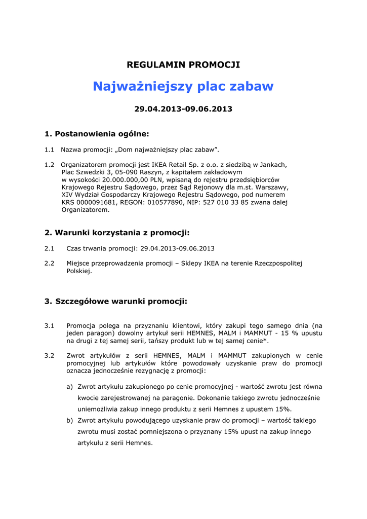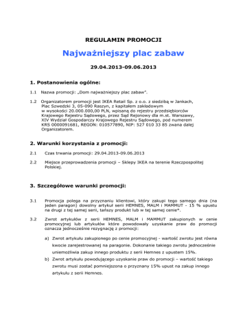 REGULAMIN PROMOCJI Najważniejszy plac zabaw 29.04.2013-09.06.2013 1. Postanowienia ogólne: 1.1 Nazwa promocji: „Dom najważniejszy plac zabaw”. 1.2 Organizatorem promocji jest IKEA Retail Sp. z o.o. z siedzibą w Jankach, Plac Szwedzki 3, 05-090 Raszyn, z kapitałem zakładowym w wysokości 20.000.000,00 PLN, wpisaną do rejestru przedsiębiorców Krajowego Rejestru Sądowego, przez Sąd Rejonowy dla m.st. Warszawy, XIV Wydział Gospodarczy Krajowego Rejestru Sądowego, pod numerem KRS 0000091681, REGON: 010577890, NIP: 527 010 33 85 zwana dalej Organizatorem. 2. Warunki korzystania z promocji: 2.1 Czas trwania promocji: 29.04.2013-09.06.2013 2.2 Miejsce przeprowadzenia promocji – Sklepy IKEA na terenie Rzeczpospolitej Polskiej. 3. Szczegółowe warunki promocji: 3.1 Promocja polega na przyznaniu klientowi, który zakupi tego samego dnia (na jeden paragon) dowolny artykuł serii HEMNES, MALM i MAMMUT - 15 % upustu na drugi z tej samej serii, tańszy produkt lub w tej samej cenie*. 3.2 Zwrot artykułów z serii HEMNES, MALM i MAMMUT zakupionych w cenie promocyjnej lub artykułów które powodowały uzyskanie praw do promocji oznacza jednocześnie rezygnację z promocji: a) Zwrot artykułu zakupionego po cenie promocyjnej - wartość zwrotu jest równa kwocie zarejestrowanej na paragonie. Dokonanie takiego zwrotu jednocześnie uniemożliwia zakup innego produktu z serii Hemnes z upustem 15%. b) Zwrot artykułu powodującego uzyskanie praw do promocji – wartość takiego zwrotu musi zostać pomniejszona o przyznany 15% upust na zakup innego artykułu z serii Hemnes. c) Zwrot artykułu zakupionego po cenie promocyjnej i artykułu powodującego uzyskanie praw do promocji - wartość zwrotu jest równa kwocie zarejestrowanej na paragonie fiskalnym. 3.3 W przypadku reklamacji artykułów zakupionych w promocji lub artykułów które były konieczne do uzyskania promocji: a) Wymiana reklamowanych artykułów na identyczne oznacza zachowanie praw do promocji i wymianę na produkt identyczny bez ponoszenia dodatkowych kosztów lub potrąceń. b) Wymiana reklamowanych produktów na inne lub zwrot oznacza rezygnację z promocji a sposób zwrotu przeprowadzony tak samo jak w punkcie 3.6. 3.8 Promocja nie obejmuje mebli zakupionych w Dziale Sprzedaży Okazyjnej oraz z ekspozycji. 4. Inne postanowienia: 4.1 Przystąpienie do promocji jest równoznaczne z potwierdzeniem zapoznania się klienta z treścią niniejszego Regulaminu i jego akceptacją. 4.2 Wszelkie roszczenia z tytułu udziału w promocji należy składać w formie pisemnej w terminie 14 dni od dnia zakończenia promocji w na ręce Kierownika ds. Relacji z Klientami w sklepie, w którym dokonano zakupu. W przypadku przesłania reklamacji za pośrednictwem poczty, decyduje data nadania pisma w urzędzie pocztowym. Reklamacje będą rozpatrzone pisemnie w terminie 14 dni. Po wyczerpaniu postępowania reklamacyjnego uczestnikowi przysługuje prawo do dochodzenia nieuwzględnionych roszczeń we właściwym sądzie powszechnym. 4.3 Pisemna reklamacja powinna zawierać: dane kontaktowe z Klientem tj. imię i nazwisko, adres, telefon oraz opis i powód reklamacji. 4.4 Organizator zastrzega sobie prawo dokonywania zmian w niniejszym Regulaminie w trakcie trwania promocji. Zmienione warunki Regulaminu zostaną udostępnione na stronie internetowej IKEA.pl oraz w sklepach IKEA. Zmiana warunków Regulaminu pozostanie bez wpływu na nabyte przez klienta prawa przed wejściem w życie zmian w Regulaminie. *Lista mebli objętych promocją – załącznik nr 1 Janki, dnia 20.04.2013 Załącznik nr 1 – Lista mebli objętych promocją: Numer produtku Nazwa produtku 80176284 HEMNES cff tbl 118x75 black-brown 30176286 HEMNES cff tbl 118x75 white stain 10176292 HEMNES cff tbl 90x90 black-brown 10176287 HEMNES cff tbl 90x90 white stain 60214121 HEMNES N cff tbl 118x75 grey-brown 40214122 HEMNES N cff tbl 90x90 grey-brown 00251809 HEMNES N console tbl 157x40 black-brown 40251812 HEMNES N console tbl 157x40 grey-brown 00251814 HEMNES N console tbl 157x40 white stain 20214123 HEMNES N side tbl 55x55 grey-brown 20176282 HEMNES side tbl 55x55 black-brown 00176283 HEMNES side tbl 55x55 white stain 90227117 HEMNES cb w pnl/glss-dr 49x197 black-brown 10227116 HEMNES cb w pnl/glss-dr 49x197 grey-brown 60227114 HEMNES cb w pnl/glss-dr 49x197 white stain 70227118 HEMNES cb w pnl/glss-dr 90x197 black-brown 50227119 HEMNES cb w pnl/glss-dr 90x197 grey-brown 30227115 HEMNES cb w pnl/glss-dr 90x197 white stain 10225626 HEMNES glass shelf 44x29 30225625 HEMNES glass shelf 85x29 10245634 HEMNES N bookcs 49x197 black-brown 60245636 HEMNES N bookcs 49x197 grey-brown 20245638 HEMNES N bookcs 49x197 white stain 80245640 HEMNES N bookcs 90x197 black-brown 40245642 HEMNES N bookcs 90x197 grey-brown 00245644 HEMNES N bookcs 90x197 white stain 50245665 HEMNES N gls-dr cb 49x197 black-brown 10245667 HEMNES N gls-dr cb 49x197 grey-brown 70245669 HEMNES N gls-dr cb 49x197 white stain 80213583 HEMNES N gls-dr cb 90x197 black-brown 30213585 HEMNES N gls-dr cb 90x197 grey-brown 90213587 HEMNES N gls-dr cb 90x197 white stain 50213589 HEMNES N gls-dr cb w 3 drw 90x197 black-brown 10213591 HEMNES N gls-dr cb w 3 drw 90x197 grey-brown 70213593 HEMNES N gls-dr cb w 3 drw 90x197 white stain 10250970 HEMNES wall/bridg shlf 124x37 black-brown 70250972 HEMNES wall/bridg shlf 124x37 grey-brown 30250974 HEMNES wall/bridg shlf 124x37 white stain 80250976 HEMNES wall/bridg shlf 183x37 black-brown 40250978 HEMNES wall/bridg shlf 183x37 grey-brown 80250981 HEMNES wall/bridg shlf 183x37 white stain 80250957 HEMNES TV bnch 124x49 black-brown 40250959 HEMNES TV bnch 124x49 grey-brown 00250961 HEMNES TV bnch 124x49 white stain 60250963 HEMNES TV bnch 183x49 black-brown 10250965 HEMNES TV bnch 183x49 grey-brown 70250967 HEMNES TV bnch 183x49 white stain 80245697 HEMNES N add-on unit bureau 89x88 black-brown 40245699 HEMNES N add-on unit bureau 89x88 grey-brown 80245701 HEMNES N add-on unit bureau 89x