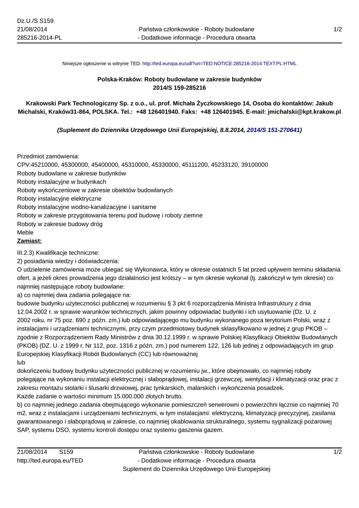 Dz.U./S S159 21/08/2014 285216-2014-PL Państwa członkowskie - Roboty budowlane - Dodatkowe informacje - Procedura otwarta 1/2 Niniejsze ogłoszenie w witrynie TED: http://ted.europa.eu/udl?uri=TED:NOTICE:285216-2014:TEXT:PL:HTML Polska-Kraków: Roboty budowlane w zakresie budynków 2014/S 159-285216 Krakowski Park Technologiczny Sp. z o.o., ul. prof. Michała Życzkowskiego 14, Osoba do kontaktów: Jakub Michalski, Kraków31-864, POLSKA. Tel.: +48 126401940. Faks: +48 126401945. E-mail: [email protected] (Suplement do Dziennika Urzędowego Unii Europejskiej, 8.8.2014, 2014/S 151-270641) Przedmiot zamówienia: CPV:45210000, 45300000, 45400000, 45310000, 45330000, 45111200, 45233120, 39100000 Roboty budowlane w zakresie budynków Roboty instalacyjne w budynkach Roboty wykończeniowe w zakresie obiektów budowlanych Roboty instalacyjne elektryczne Roboty instalacyjne wodno-kanalizacyjne i sanitarne Roboty w zakresie przygotowania terenu pod budowę i roboty ziemne Roboty w zakresie budowy dróg Meble Zamiast: III.2.3) Kwalifikacje techniczne: 2) posiadania wiedzy i doświadczenia: O udzielenie zamówienia może ubiegać się Wykonawca, który w okresie ostatnich 5 lat przed upływem terminu składania ofert, a jeżeli okres prowadzenia jego działalności jest krótszy – w tym okresie wykonał (tj. zakończył w tym okresie) co najmniej następujące roboty budowlane: a) co najmniej dwa zadania polegające na: budowie budynku użyteczności publicznej w rozumieniu § 3 pkt 6 rozporządzenia Ministra Infrastruktury z dnia 12.04.2002 r. w sprawie warunków technicznych, jakim powinny odpowiadać budynki i ich usytuowanie (Dz. U. z 2002 roku, nr 75 poz. 690 z późn. zm.) lub odpowiadającego mu budynku wykonanego poza terytorium Polski, wraz z instalacjami i urządzeniami technicznymi, przy czym przedmiotowy budynek sklasyfikowano w jednej z grup PKOB – zgodnie z Rozporządzeniem Rady Ministrów z dnia 30.12.1999 r. w sprawie Polskiej Klasyfikacji Obiektów Budowlanych (PKOB) (DZ. U. z 1999 r. Nr 112, poz. 1316 z późn. zm.) pod numerem 122, 126 lub jednej z odpowiadających im grup Europejskiej Klasyfikacji Robót Budowlanych (CC) lub równoważnej lub dokończeniu budowy budynku użyteczności publicznej w rozumieniu jw., które obejmowało, co najmniej roboty polegające na wykonaniu instalacji elektrycznej i słaboprądowej, instalacji grzewczej, wentylacji i klimatyzacji oraz prac z zakresu montażu stolarki i ślusarki drzwiowej, prac tynkarskich, malarskich i wykończenia posadzek. Każde zadanie o wartości minimum 15.000.000 złotych brutto. b) co najmniej jednego zadania obejmującego wykonanie pomieszczeń serwerowni o powierzchni łącznie co najmniej 70 m2, wraz z instalacjami i urządzeniami technicznymi, w tym instalacjami: elektryczną, klimatyzacji precyzyjnej, zasilania gwarantowanego i słaboprądową w zakresie, co najmniej okablowania strukturalnego, systemu sygnalizacji pożarowej SAP, systemu DSO, systemu kontroli dostępu oraz systemu gaszenia gazem. 21/08/2014 S159 http://ted.europa.eu/TED Państwa członkowskie - Roboty budowlane - Dodatkowe informacje - Procedura otwarta Suplement do Dziennika Urzędowego Unii Europejskiej 1/2 Dz.U./S S159 21/08/2014 285216-2014-PL Państwa członkowskie - Roboty budowlane - Dodatkowe informacje - Procedura otwarta 2/2 c) co najmniej jedno zadanie obejmujące wykonanie systemu BMS (Buliding Managment System) tj. Systemu zarządzającego co najmniej następującymi instalacjami: siecią teleinformatyczną, oświetleniem wewnętrznym i zewnętrznym, sygnalizacją awarii zasilania w tablicach rozdzielczych, sygnalizacją stanu pracy instalacji grzewczych, sygnalizacją zamknięcia klap odcinających, sygnalizacją awarii zasilania, załączeniem agregatu prądotwórczego, sterowaniem żaluzjami na elewacji, zamykaniem klap oddymiających, ogrzewaniem pomieszczeń, wentylacją, klimatyzacją, systemem alarmowym i monitoringiem, systemem sygnalizacji pożarowej SAP, systemem kontroli dostępu wewnętrznym i zewnętrznym. Zamawiający dopuszcza wykazanie wykonania robót odpowiadających treści ppkt b), c) w ramach zadań odpowiadających treści ppkt a). IV.3.4) Termin składania ofert lub wniosków o dopuszczenie do udziału w postępowaniu: 29.8.2014 (12:00) IV.3.8) Warunki otwarcia ofert: 29.8.2014 (12:15) Powinno być: III.2.3) Kwalifikacje techniczne: 2) posiadania wiedzy i doświadczenia: O udzielenie zamówienia może ubiegać się Wykonawca, który w okresie ostatnich 5 lat przed upływem terminu składania ofert, a jeżeli okres prowadzenia jego działalności jest krótszy – w tym okresie wykonał (tj. zakończył w tym okresie) co najmniej następujące roboty budowlane: a) co najmniej dwa zadania polegające na: budowie budynku użyteczności publicznej w rozumieniu § 3 pkt 6 rozporządzenia Ministra Infrastruktury z dnia 12.4.2002 r. w sprawie warunków technicznych, jakim powinny odpowiadać budynki i ich usytuowanie (Dz.U. z 2002 roku, nr 75 poz. 690 z późn. zm.) lub odpowiadającego mu budynku wykonanego poza terytorium Polski, wraz z instalacjami i urządzeniami technicznymi, przy czym przedmiotowy budynek sklasyfikowano w jednej z grup PKOB – zgodnie z Rozporządzeniem Rady Ministrów z dnia 30.12.1999 r. w sprawie Polskiej Klasyfikacji Obiektów Budowlanych (PKOB) (Dz.U. z 1999 r. nr 112, poz. 1316 z późn. zm.) pod numerem 122, 126 lub jednej z odpowiadających im grup Europejskiej Klasyfikacji Robót Budowlanych (CC) lub równoważnej lub dokończeniu budowy budynku użyteczności publicznej w rozumieniu jw., które obejmowało, co najmniej roboty polegające na wykonaniu instalacji elektrycznej i słaboprądowej, instalacji grzewczej, wentylacji i klimatyzacji oraz prac z zakresu montażu stolarki i ślusarki drzwiowej, prac tynkarskich, malarskich i wykończenia posadzek. Każde zadanie o wartości minimum 15 000 000 PLN brutto. b) co najmniej jednego zadania obejmującego wykonanie pomieszczeń ser
