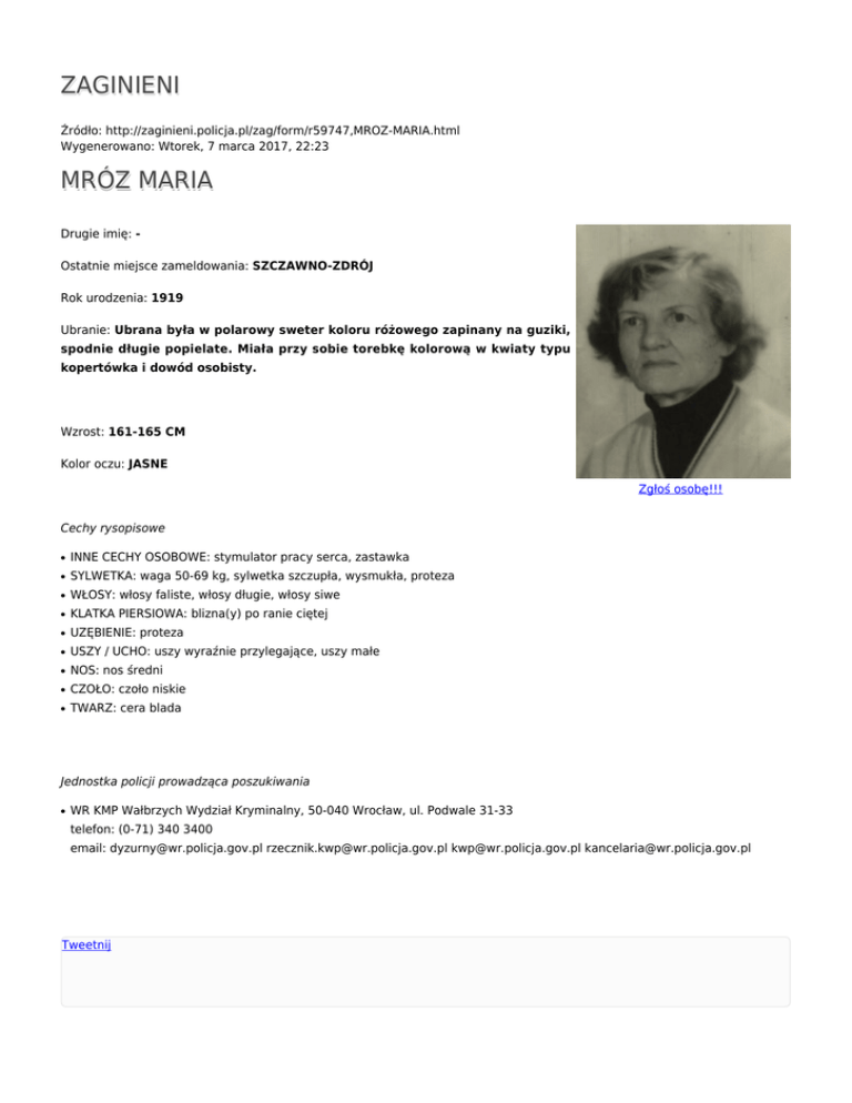 ZAGINIENI Źródło: http://zaginieni.policja.pl/zag/form/r59747,MROZ-MARIA.html Wygenerowano: Wtorek, 7 marca 2017, 22:23 MRÓZ MARIA Drugie imię: Ostatnie miejsce zameldowania: SZCZAWNO-ZDRÓJ Rok urodzenia: 1919 Ubranie: Ubrana była w polarowy sweter koloru różowego zapinany na guziki, spodnie długie popielate. Miała przy sobie torebkę kolorową w kwiaty typu kopertówka i dowód osobisty. Wzrost: 161-165 CM Kolor oczu: JASNE Zgłoś osobę!!! Cechy rysopisowe ● INNE CECHY OSOBOWE: stymulator pracy serca, zastawka ● SYLWETKA: waga 50-69 kg, sylwetka szczupła, wysmukła, proteza ● WŁOSY: włosy faliste, włosy długie, włosy siwe ● KLATKA PIERSIOWA: blizna(y) po ranie ciętej ● UZĘBIENIE: proteza ● USZY / UCHO: uszy wyraźnie przylegające, uszy małe ● NOS: nos średni ● CZOŁO: czoło niskie ● TWARZ: cera blada Jednostka policji prowadząca poszukiwania ● WR KMP Wałbrzych Wydział Kryminalny, 50-040 Wrocław, ul. Podwale 31-33 telefon: (0-71) 340 3400 email: [email protected] [email protected] [email protected] [email protected] Tweetnij
