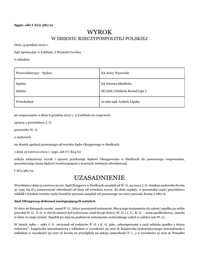 Sygn. akt I ACa 581/12 WYROK W IMIENIU RZECZYPOSPOLITEJ POLSKIEJ Dnia 13 grudnia 2012 r. Sąd Apelacyjny w Lublinie, I Wydział Cywilny w składzie: Przewodniczący - Sędzia SA Jerzy Nawrocki Sędzia: SA Danuta Mietlicka Sędzia: SO (del.) Elżbieta Koszel (spr.) Protokolant st.sekr.sąd. Izabela Lipska po rozpoznaniu w dniu 6 grudnia 2012 r. w Lublinie na rozprawie sprawy z powództwa J. G. przeciwko W. G. o zachowek na skutek apelacji pozwanego od wyroku Sądu Okręgowego w Siedlcach z dnia 15 czerwca 2012 r. sygn. akt I C 824/10 uchyla zaskarżony wyrok i sprawę przekazuje Sądowi Okręgowemu w Siedlcach do ponownego rozpoznania, pozostawiając temu Sądowi rozstrzygnięcie o kosztach instancji odwoławczej. I ACa 581/12 UZASADNIENIE Wyrokiem z dnia 15 czerwca 2012r. Sąd Okręgowy w Siedlcach zasądził od W. G. na rzecz J. G. tytułem zachowku kwotę 37 059, 65 zł z ustawowymi odsetkami od dnia 28 września 2010r. do dnia zapłaty, w pozostałej części powództwo oddalił i tytułem zwrotu części kosztów procesu zasądził od pozwanego na rzecz powoda kwotę 2 680 zł. Sąd Okręgowy dokonał następujących ustaleń. W dniu 26 listopada 2006r. zmarł P. G., który pozostawił testament. Mocą tego testamentu do całości spadku po sobie powołał W. G.. P. G. w chwili śmierci był wdowcem, miał dwoje dzieci: W. G. i J. G.. K. G. – żona spadkodawcy, zmarła w dniu 10 maja 2000r. Spadek po niej na podstawie testamentu notarialnego nabył w całości syn W. G.. W latach 1980 – 1981 J. G. otrzymał od rodziców P. G. i K. G. jako „rekompensatę z racji udziału spadku z domu rodziców”: książeczkę mieszkaniową z wkładem w wysokości 34 000 zł, książeczkę systematycznego oszczędzania z wkładem w wysokości 30 000 zł, kwotę na przedpłatę na zakup samochodu F. (...) w wysokości 15 000 zł. Ponadto w roku 1999 otrzymał on od rodziców książeczkę oszczędnościową na wkłady terminowe z wkładem w wysokości 26 095, 34 zł oraz kwotę 4 000 zł. Umową darowizny z dnia 22 marca 1995r. P. G. i jego żona K. G. darowali W. G. i jego żonie B. G. (1) udział wynoszący 1/3 części w użytkowaniu wieczystym działki o numerze ewidencyjnym (...), położonej w S. przy ul. (...) (obecnie ul. (...)) oraz własności znajdującego się na tej działce budynku mieszkalnego. W skład spadku po P. G. wchodzi udział w wysokości 1/3 części w zabudowanej domem mieszkalnym nieruchomości położonej w S. przy ul. (...). Wartość tej nieruchomości według opinii biegłego E. W. wynosi 538 223 zł. Taki stan faktyczny Sąd Okręgowy ustalił na podstawie : postanowienia Sądu Rejonowego w Mińsku Mazowieckim z dnia 25 września 2007r. w sprawie I Ns 832/07, postanowienia Sądu Rejonowego dla Warszawy P. z dnia 28 września 2000r. w sprawie II Ns 1423/00 – k. 75, pisemnego oświadczenia J. G. z potwierdzeniem podpisu – k. 80, umowy darowizny k. 195 – 198, odpisu z księgi wieczystej – k. 250 – 252 i opinii biegłej E. W. – k. 104 – 118, 214, 153). Na podstawie tych ustaleń Sąd Okręgowy przeprowadził następującą ocenę prawną. Zgodnie z art. 991 § 1 i § 2 k.c. zstępnym, którzy byliby powołani do spadku z ustawy należą się, jeżeli uprawniony jest trwale niezdolny do pracy albo małoletni – dwie trzecie wartości udziału spadkowego, który by mu przypadł przy dziedziczeniu ustawowym, w innych zaś wypadkach – połowa wartości tego udziału. Jeżeli uprawniony nie otrzymał należnego mu zachowku bądź w postaci uczynionej przez spadkodawcę darowizny, bądź w postaci powołania do spadku, bądź w postaci zapisu, przysługuje mu przeciwko spadkobiercy roszczenie o zapłatę sumy pieniężnej potrzebnej do pokrycia zachowku albo do jego uzupełnienia. W przedmiotowej sprawie spadkodawca P. G. miał dwóch synów, w chwili śmierci był wdowcem. Tym samym zgodnie z art. 991 k.c. powodowi w przypadku dziedziczenia ustawowego przypadałby udział w wysokości 1/2 części, a zatem z tytułu zachowku przysługuje mu połowa wartości tego udziału, czyli 1/4 części. Pomiędzy stronami bezspornym jest, że składnikiem majątkowym wchodzącym w skład spadku po P. G. jest nieruchomość położona w S. przy ul. (...). Sporna jest natomiast wielkość przysługującego mu udziału we współwłasności tej nieruchomości. Jak wynika z odpisu z księgi wieczystej prowadzonej dla przedmiotowej nieruchomości, udział P. G. we współwłasności tej nieruchomości w dacie otwarcia spadku wynosił 1/3 . Umową darowizny z dnia 22 marca 1995r. S. G. i jego żona K. G. darowali synowi W. G. i jego żonie B. G. (1) wynoszący 1/3 udział w prawie użytkowania wieczystego przedmiotowej działki oraz własności znajdującego się na tej działce budynku mieszkalnego. Tym samym pozostali nadal współwłaścicielami i współużytkownikami wieczystymi tej nieruchomości w 2/3 częściach. Ponieważ spadek po K. G. nabył w całości syn W. G., udział jaki pozostał P. G., to 1/3 części. Brak jest podstaw prawnych, aby wysokość tego udziału ustalić na 1/2 czy 7/18 jak wskazywały strony postępowania. Sąd uznał, że jedynym składnikiem majątkowym wchodzącym w skład spadku po P. G. jest udział w 1/3 części we współwłasności nieruchomości położonej w S. przy ul. (...). Wartość tej nieruchomości została ustalona przez biegłą sadową na kwotę 538 223 zł. W ocenie Sądu opinia biegłej jest miarodajna i wiarygodna, uwzględnia bowiem stan nieruchomości, jej położenie, wiek budynku mieszkalnego. Fakt, że powód odmiennie ocenia wartość tej nieruchomości nie może stanowić podstawy do jej wzruszenia. Wartość udziału spadkowego po P. G. w wysokości 1/3 części przedmiotowej nieruchomości została określona na kwotę 70 000 zł przez Urząd Skarbowy w M. w 2010r. Tym samym nie można uznać, aby wartość nieruchomości ustalona przez biegłą sądową została zaniżona. Jednocześnie Sąd Okręgowy nie