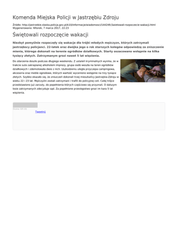 Komenda Miejska Policji w Jastrzębiu Zdroju Źródło: http://jastrzebie.slaska.policja.gov.pl/k10/informacje/wiadomosci/144249,Swietowali-rozpoczecie-wakacji.html Wygenerowano: Wtorek, 7 marca 2017, 22:23 Świętowali rozpoczęcie wakacji Niezbyt pomyślnie rozpoczęły się wakacje dla trójki młodych mężczyzn, których zatrzymali jastrzębscy policjanci. 22-latek oraz dwójka jego o rok starszych kolegów odpowiedzą za zniszczenie mienia, którego dokonali na terenie ogródków działkowych. Starty oszacowano wstępnie na kilka tysięcy złotych. Zatrzymanym grozi nawet 5 lat więzienia. Do zdarzenia doszło podczas długiego weekendu. Z ustaleń kryminalnych wynika, że w trakcie suto zakrapianej alkoholem imprezy, grupa osób weszła na teren ogródków działkowych i zdemolowała dwie z nich. Uszkodzeniu uległa przyczepa campingowa, akcesoria oraz meble ogrodowe, których wartość wyceniono wstępnie na trzy tysiące złotych. Szybko okazało się, że zniszczeń dokonali trzej mieszkańcy Jastrzębia-Zdroju w wieku 22 i 23 lat. Mężczyźni zostali zatrzymani i trafili do policyjnej celi. Całej trójce przedstawiono już zarzuty, do popełnienia których częściowo się przyznali. O dalszym losie zatrzymanych zdecyduje sąd. Za popełnione przestępstwo grozi im kara 5 lat więzienia. Ocena: 0/5 (0) Tweetnij