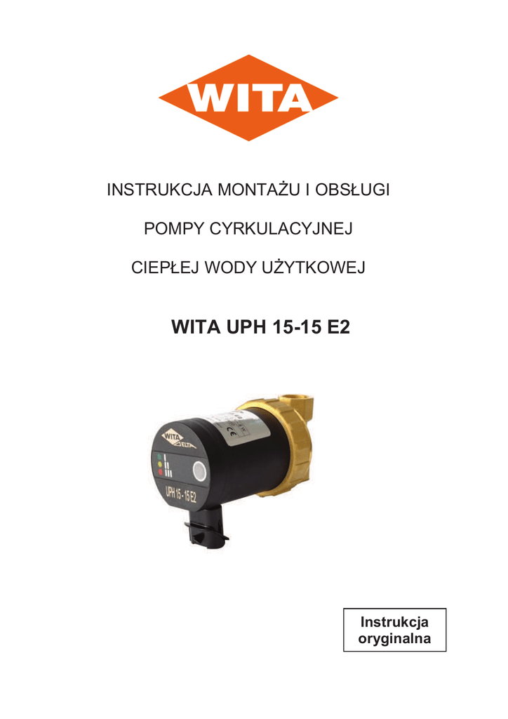 INSTRUKCJA MONTAŻU I OBSŁUGI POMPY CYRKULACYJNEJ CIEPŁEJ WODY UŻYTKOWEJ WITA UPH 15-15 E2 Instrukcja oryginalna DEKLARACJA ZGODNOŚCI NR 06/2012 Producent: Hel-Wita Sp. z o.o. Adres: 86-005 Białe Błota, Zielonka ul. Biznesowa 22 Osoba upoważniona do przygotowania dokumentacji technicznej: Michał Żołna, Hel-Wita Sp. z o.o. Adres: 86-005 Białe Błota, Zielonka ul. Biznesowa 22 Wyrób: Pompa typu UPH 15-15 E2 Opisany powyżej wyrób jest zgodny z następującymi dyrektywami Parlamentu Europejskiego i Rady które dotyczą: 1. kompatybilności elektromagnetycznej nr 2004/108/WE, 2. urządzeń elektrycznych niskonapięciowych nr 2006/95/WE, Zastosowane zharmonizowane normy: PN-EN 60335-1:2012 PN-EN 60335-2-51:2005 + A1:2008 + A2:2012 PN-EN 61000-6-1:2008 PN-EN 61000-6-3:2008 + A1:2011 Zastosowane przedmiotowe normy: PN-EN 1151-1:2007 + PN-EN 1151-1:2007/AC:2007 Kopia Deklaracji Zgodności na www.hel-wita.com.pl Grzegorz Chróściński Koordynator Produkcji Zielonka, dnia 27.11.2012 r. -2Instrukcja Oryginalna PL 27.11.2012, wydanie pierwsze, zmiany zastrzeżone SPIS TREŚCI 1. Wskazówki bezpieczeństwa 4 1.1. Informacje ogólne 1.2. Oznaczenie wskazówek w instrukcji obsługi 1.3. Kwalifikacje personelu 1.4. Bezpieczeństwo pracy 1.5. Wskazówki bezpieczeństwa dla użytkownika 1.6. Wskazówki bezpieczeństwa dot. montażu i prac konserwacyjnych 1.7.Niebezpieczeństwo w przypadku nieprzestrzegania wskazówek bezpieczeństwa 1.8. Samowolna przebudowa i części zamienne 1.9. Utylizacja 4 4 4 5 5 5 6 6 2. Podłączenie i obsługa 6 2.1. Zastosowanie 2.2. Montaż 2.3. Podłączenie elektryczne 2.4. Uruchomienie 2.5. Obsługa 6 6 7 7 8 3. Opis techniczny 8 3.1. Konstrukcja pompy 3.2. Dane techniczne 3.3. Charakterystyka pompy 3.4. Zakłócenia pracy 8 9 9 9 5 4. Załączniki 11 5. Gwarancja 12 -3Instrukcja Oryginalna PL 27.11.2012, wydanie pierwsze, zmiany zastrzeżone 1. Wskazówki bezpieczeństwa 1.1. Informacje ogólne Niniejsza instrukcja montażu i obsługi jest elementem składowym produktu i zawiera podstawowe informacje do których należy się stosować podczas montażu, użytkowania i konserwacji. Należy przestrzegać przedstawionych w tej instrukcji wskazówek bezpieczeństwa oraz krajowych przepisów zapobiegania wypadkom. Dlatego przed rozpoczęciem instalacji konieczne jest zapoznanie się z nią instalatora oraz personelu wzgl. użytkownika. UWAGA!!! „Niniejszy sprzęt nie jest przeznaczony do użytkowania przez osoby (w tym dzieci) o ograniczonej zdolności fizycznej, czuciowej lub psychicznej, lub osoby nie mające doświadczenia lub znajomości sprzętu, chyba że odbywa się to pod nadzorem lub zgodnie z instrukcja użytkowania sprzętu, przekazanej przez osoby odpowiadające za ich bezpieczeństwo. Należy zwracać uwagę na dzieci, aby nie bawiły się sprzętem” 1.2. Oznaczenie wskazówek w instrukcji obsługi Ogólny symbol niebezpieczeństwa Ostrzeżenie! Niebezpieczeństwo powstania uszczerbku na zdrowiu! Należy przestrzegać przepisów zapobiegania wypadkom. Ostrzeżenie! Niebezpieczeństwo wysokiego napięcia! Należy wykluczyć zagrożenia wynikające z występowania wysokiego napięcia. Należy przestrzegać krajowych oraz wewnętrznych przepisów i zasad ochrony przeciwporażeniowej. Wskazówka Tutaj zawarte są przydatne wskazówki dotyczące użytkowania produktu. Wskazują one na możliwość wystąpienia trudności, mają zapewnić bezpieczną pracę. 1.3. Kwalifikacje personelu Personel odpowiedzialny za montaż, obsługę i konserwację musi posiadać odpowiednie kwalifikacje. Użytkownik jest zobowiązany określić zakres odpowiedzialności i zapewnić nadzór personelu. Jeśli personel nie będzie posiadać niezbędnej wiedzy należy go odpowiednio przeszkolić. -4Instrukcja Oryginalna PL 27.11.2012, wydanie pierwsze, zmiany zastrzeżone 1.4. Bezpieczeństwo pracy Należy przestrzegać przedstawionych w tej instrukcji wskazówek bezpieczeństwa oraz krajowych przepisów zapobiegania wypadkom. 1.5. Wskazówki bezpieczeństwa dla użytkownika - podczas pracy urządzenia nie wolno demontować lub wyłączać ewent. występujących elementów chroniących przed kontaktem z poruszającymi się częściami - jeśli wskutek nieszczelności dojdzie do wycieku cieczy, należy go zneutralizować, aby nie doszło do zagrożeń dla osób lub środowiska - należy wykluczyć zagrożenia wynikające z występowania energii elektrycznej. Tutaj należy stosować się do przepisów i zasad ochrony przeciwporażeniowej - jeżeli podczas pracy urządzenia jego podzespoły będą silnie nagrzewały się lub nadmiernie oziębiały, konieczne jest zamontowanie dodatkowych osłon ochronnych - materiały łatwopalne należy przechowywać z dala od produktu 1.6. Wskazówki bezpieczeństwa dot. montażu i prac konserwacyjnych Użytkownik urządzenia jest odpowiedzialny za to, aby wszelkie prace montażowe i konserwacyjne wykonywane były przez wykwalifikowany personel. Konieczne jest uprzednie zapoznanie się z instrukcją obsługi produktu. W/w. prace mogą być wykonywane wyłącznie na wyłączonym urządzeniu. Zalecane kroki postępowania dotyczące unieruchomienia znajdują się w instrukcji obsługi. Po zakończeniu prac należy ponownie zamontować wszelkie elementy ochronne, jak np. osłony ochronne przed bezpośrednim kontaktem. 1.7. Niebezpieczeństwo w przypadku nieprzestrzegania wskazówek bezpieczeństwa Jeśli wskazówki bezpieczeństwa nie będą przestrzegane dojść może do powstania niebezpieczeństwa dla personelu, środowiska oraz urządzenia. Niestosowanie się do w.w. wskazówek prowadzi do utraty jakichkolwiek roszczeń do odszkodowań. Możliwe zagrożenia to np.: - zagrożenie bezpieczeństwa osób wskutek elektrycznych lub mechanicznych oddziaływań - nieprawidłowe działanie istotnych funkcji urządzenia - zagrożenie środowiska wskutek wycieku płynów spowodowanego nieszczelnościami - nieprawidłowo przeprowadzone zalecane naprawy i p
