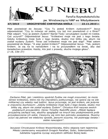 Parafia Rzymskokatolicka pw. Wniebowzięcia NMP we Władysławowie 47/2015 UROCZYSTOŚĆ CHRYSTUSA KRÓLA 22.11.2015 r. Piłat powiedział do Jezusa: "Czy Ty jesteś Królem żydowskim?" Jezus odpowiedział: "Czy to mówisz od siebie, czy też inni powiedzieli ci o Mnie?" Piłat odparł: "Czy ja jestem Żydem? Naród Twój i arcykapłani wydali mi Ciebie. Coś uczynił?" Odpowiedział Jezus: "Królestwo moje nie jest z tego świata. Gdyby królestwo moje było z tego świata, słudzy moi biliby się, abym nie został wydany Żydom. Teraz zaś królestwo moje nie jest stąd". Piłat zatem powiedział do Niego: "A więc jesteś Królem?" Odpowiedział Jezus: "Tak, jestem Królem. Ja się na to narodziłem i na to przyszedłem na świat, aby dać świadectwo prawdzie. Każdy, kto jest z prawdy, słucha mojego głosu". (J 18, 33b-37) Zarówno Piłat, jak i niektórzy spośród Żydów nie mogli zrozumieć, że może istnieć królestwo, które nie ma charakteru politycznego, nie opiera się na sile militarnej czy władzy nad ludźmi. Jezus przyznaje, że jest królem, ale jedynie w znaczeniu duchowym: „Gdyby królestwo moje było z tego świata, słudzy moi biliby się, abym nie został wydany Żydom". Chrystus Król nazywa swoich poddanych przyjaciółmi. Ojciec Timothy Radcliffe pisze: „Miłość będąca przyjaźnią zachęca nas, abyśmy spoglądali na innych bez podejmowania prób przywłaszczenia ich sobie. Cieszymy się nimi bez potrzeby posiadania. Musimy uczyć się patrzeć we właściwy sposób, jasnymi oczyma, nie pożerając świata i siebie nawzajem". Jezusowi Chrystusowi Królowi Wszechświata, Który objawia nam tajemnicę Miłości zawierzamy wszystkich Drogich Parafian, Gości, Solenizantów i Jubilatów tygodnia życząc wszystkim obfitości Bożej łaski. W przyszłą niedzielę rozpoczynamy okres Adwentu, który ma nas przygotować na przyjście Chrystusa. Msza święta roratnia, czyli Msza święta o Najświętszej Maryi Pannie w naszym kościele odprawiana będzie codziennie (za wyjątkiem niedziel) o godz. 6.00. Roraty dla dzieci w poniedziałek, środę i piątek o godz. 17.00. Wszystkie odważne dzieci zapraszamy także na godz. 6.00. Zachęcamy dzieci do zrobienia swoich własnych lampionów, z którymi będą pielgrzymować w adwentowych ciemnościach na Roraty. OPŁATKI W tradycji od wieków opłatki wigilijne roznoszone były do domów przez organistów oraz osoby mu pomagające. Parafianie oczekiwali ich jako zwiastunów zbliżających się świąt Bożego Narodzenia. Dzisiaj opłatki można nabyć w wielu miejscach. Stały się one zwykłym towarem kupowanym okazjonalnie. Tradycja ta, uświęcona przez pokolenia, podtrzymywana jest już w niewielu parafiach. A szkoda! Dobrze, że Władysławowo pielęgnuje się tradycje. W naszej parafii nasz organista p. Marek wraz z siostrami rozpoczęli już roznoszenie opłatków. Przyjmijmy ich serdecznie. Ci których niezastaną w domu, niech zaopatrzą się w opłatek w kiosku parafialnym. Przyjmując ten opłatek, a potem łamiąc się nim przy wigilijnym stole, wyrażamy naszą łączność z tym Kościołem i z całą Wspólnotą Parafialną noszącą imię Wniebowzięcia NMP. RÓŻANIEC ZA ZMARŁYCH 22, 29 listopada o godz. 15.00 – Różaniec na cmentarzu komunalnym. RUCH ŚWIATŁO-ŻYCIE Oaza - to nowa wspólnota, która powstała w naszej parafii. Co to jest? Oaza młodzieżowa stanowi jedną z gałęzi Ruchu Światło-Życie, założonego przez sł. Bożego ks. Blachnickiego. Celem Oazy jest wychowanie młodzieży do dojrzałego przeżywania swojej wiary we wspólnocie kościoła. ZAPRASZAMY GIMNAZJALISTÓW. Jeżeli chcesz poznać nowych przyjaciół, poznać bliżej Boga, odkrywać swoją wiarę, znaleźć pomoc i wsparcie w problemach, pojechać na fajne rekolekcje… TO OAZA JEST DLA CIEBIE. Spotkania mają miejsce w poniedziałki o godz. 19.00 w salce w domu parafialnym. ZIMOWISKO DLA MŁODZIEŻY Zapraszamy w dniach 21.02-26.02 na wyjazd na narty do Jurgowa (20 km od Zakopanego). Będzie oczywiście czas na narty (3dni), odpoczynek, przechadzki, wieczorne spotkania!!! Koszt 670 zł. Ilość miejsc ograniczona. Osoby niepełnoletnie jadą tylko za zgodą rodziców. Wszelkie informacje i zapisy (z wpłatą 200 zł) u ks. Piotra: 889 609 121 EUCHARYSTYCZNY RUCH MŁODYCH W Uroczystość Chrystusa Króla (niedziela 22 listopada), dzieci przynależące do ERM na Mszy św. o godz. 11.00 otrzymają legitymacje członkowską, oraz złożą ślubowanie. DUSZPASTERSTWO MŁODYCH W tym tygodniu zapraszamy na projekcje filmu pt: „JA JESTEM”. To film, który rzuca na kolana przed Najświętszym Sakramentem. Film przez, który mówi sam Jezus Chrystus. Gdy go obejrzysz żadna Msza, żadna adoracja nigdy nie będzie już taka sama. Piątek (27.11), godz. 19.00 salka w Domu Parafialnym. LSO Przez cały adwent LSO po każdej Mszy św. niedzielnej będzie rozprowadzać cegiełki w formie kartek świątecznych (ręcznie robionych). Ofiarą w wysokości 5 zł za kartkę pomagamy w ich wyjeździe na zimowisko do Kluszkowiec k. Krościenka. Bóg zapłać za wsparcie Liturgicznej Służby Ołtarza. DIAKONIA WIELBIENIA W każdy czwartek o godz. 19.00 w domu parafialnym odbywa się próba scholii wielbiącej Boga podczas Mszy św. wielbienia. Wszystkich umiejących grać i śpiewać zapraszamy na próbę. Spotkania w domu parafialnym. CHÓR PARAFIALNY Chór parafialny zaprasza wszystkich chętnych zarówno mężczyzn jak i kobiety na próby we wtorki i czwartki po Mszy św. wieczornej. TANIEC WIELBIENIA DLA DZIECI W każdą sobotę zapraszamy wszystkie dzieci kochające taniec. Zapraszamy na zajęcia z tańca uwielbienia w soboty na godz. 12.00. Spotkania w domu parafialnym. SCHOLA DZIECIĘCA Schola śpiewa w niedzielę podczas Mszy św. o godz. 11.00. Próby scholii odbywają się w soboty w Domu Jana Pawła o godz. 11.00. DUSZPASTERSTWO DZIECI W przyszłą niedzielę 19 listopada po Mszach Św. dzieci z naszej parafii będ