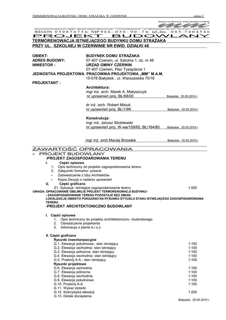 strona 1 TERMORENOWACJA BUDYNKU DOMU STRAŻAKA W CZERWINIE REGON 0 5 0 8 7 6 7 5 6; NIP 9 6 6 – 0 5 0 – 9 0 – 7 4; tel.,fax. PROJEKT 0 8 5 –7 4 0 4 5 4 6 BUDOWLANY TERMORENOWACJA ISTNIEJĄCEGO BUDYNKU DOMU STRAŻAKA PRZY UL. SZKOLNEJ W CZERWINIE NR EWID. DZIAŁKI 46 OBIEKT: ADRES BUDOWY: INWESTOR : BUDYNEK DOMU STRAŻAKA 07-407 Czerwin, ul. Szkolna 1, dz. nr 46 URZAD GMINY CZERWIN 07-407 Czerwin, Plac Tysiąclecia 1 JEDNOSTKA PROJEKTOWA: PRACOWNIA PROJEKTOWA „MM” M.A.M. 15-078 Białystok , ul. Warszawska 70/18 PROJEKTANT : Architektura: mgr inż. arch. Marek A. Matyszczyk nr uprawnień proj. BŁ/68/00 Białystok, 25.05.2010 r dr inż. arch. Robert Misiuk nr uprawnień proj. BŁ/1/99 Białystok, 25.05.2010 r Konstrukcja: mgr inż. Janusz Skoblewski nr uprawnień proj. W-wa/109/65, BŁ/164/80 Białystok, 25.05.2010 r mgr inż. arch.Maciej Brzostek Białystok, 25.05.2010 r ZAWARTOŚĆ OPRACOWANIA • PROJEKT BUDOWLANY -PROJEKT ZAGOSPODAROWANIA TERENU I. 1. 2. - ΙΙ. Część opisowa Opis techniczny do projektu zagospodarowania terenu Załączniki formalno- prawne Zaświadczenie z Izby Architektów Kopia Decyzji o nadaniu uprawnień Część graficzna Z1. Sytuacja- Istniejące zagospodarowanie terenu 1:500 UWAGA: OPRACOWANIE OBEJMUJE PROJEKT TERMORENOWACJI BUDYNKU- ZAGOSPODAROWANIE TERENU POZOSTAJE BEZ ZMIAN. LOKALIZACJĘ OBIEKTU POKAZANO NA RYSUNKU SYTUACJI STANU ISTNIEJĄCEGO ZAGOSPODAROWANIA TERENU. -PROJEKT ARCHITEKTONICZNO BUDOWLANY I. Część opisowa 1. Opis techniczny do projektu architektoniczno –budowlanego 2. Oświadczenie projektanta 3. Informacja o planie b.i o.z. II. Część graficzna Rysunki inwentaryzacyjne G.1. Elewacja południowa - stan istniejący G.2. Elewacja zachodnia- stan istniejący G.3. Elewacja północna- stan istniejący G.4. Elewacja wschodnia- stan istniejący G.5. Przekrój A-A - stan istniejący Rysunki projektowe G.6. Elewacja zachodnia G.7. Elewacja północna G.8. Elewacja wschodnia G.9. Elewacja południowa G.10. Przekrój A-A G.11. Wykaz stolarki G.12. Kolorystyka elewacji G.13. Detale docieplenia 1:100 1:100 1:100 1:100 1:100 1:100 1:100 1:100 1:100 1:100 1:200 Białystok, 25.05.2010 r. TERMORENOWACJA BUDYNKU DOMU STRAŻAKA W CZERWINIE strona 2 OPIS DO PROJEKTU ZAGOSPODAROWANIA TERENU- SYTUACJI STANU ISTNIEJĄCEGO TERMORENOWACJA ISTNIEJĄCEGO BUDYNKU DOMU STRAŻAKA W CZERWINIE 1. DANE OGÓLNE OBIEKT: ADRES BUDOWY: INWESTOR : BUDYNEK DOMU STRAŻAKA 07-407 Czerwin, ul. Szkolna 1, dz. nr 46 URZAD GMINY CZERWIN 07-407 Czerwin, Plac Tysiąclecia 1 JEDNOSTKA PROJEKTOWA: PRACOWNIA PROJEKTOWA „MM” M.A.M. 15-078 Białystok , ul. Warszawska 70/18 PROJEKTANT : Architektura: mgr inż. arch. Marek A. Matyszczyk nr uprawnień proj. BŁ/68/00 dr inż. arch. Robert Misiuk nr uprawnień proj. Bł/1/99 mgr inż. arch.Maciej Brzostek Konstrukcja: mgr inż. Janusz Skoblewski nr uprawnień W-wa/109/65, BŁ/164/80 2. 3. 4. 5. 6. 7. 8. 9. PRZEDMIOT OPRACOWANIA Przedmiotem opracowania jest projekt budowlany termorenowacji budynku Domu Strażaka przy ul. Szkolnej w Czerwinie. Zakres opracowania obejmuje: projekt docieplenia ścian budynku (docieplenia cokołu powyżej poziomu terenu, docieplenie ścian nadziemia, attyk), docieplenia stropu garażu i sali na parterze, docieplenie stropu poddasza nieużytkowego nad pierwszym piętrem, projekt kolorystyki budynku. Inwestycja obejmie wymianę obróbek blacharskich, podokienników, oraz wymianę zewnętrznej stolarki i ślusarki okiennej i drzwiowej. ISTNIEJĄCY STAN ZAGOSPODAROWANIA DZIAŁKI Obiekt zlokalizowany przy ul. Szkolnej w Czerwinie na działce nr 46. Teren działki jest zagospodarowany. Budynek usytuowany po granicy zachodniej. Istniejące wjazdy na działkę od strony ul. Szkolnej oraz z drogi do Ostrołęki. Teren częściowo utwardzony w obrębie dojazdów, chodników. Teren jest częściowo zadrzewiony. Zagospodarowanie terenu nie ulega zmianom. Zarys zabudowy budynku nie zmienia się. Ukształtowanie terenu, wjazdy na działkę i układ komunikacyjny wewnątrz działki pozostają bez zmian. Przyłącza infrastruktury technicznej- istniejące, pozostają bez zmian. PROJEKTOWANE ZAGOSPODAROWANIE TERENU Nie zmienia się. ZESTAWIENIE POWIERZCHNI Dane wielkościowe pozostają bez zmian. DANE O WPISIE DO REJESTRU ZABYTKÓW Teren oraz istniejący obiekt nie wpisane do rejestru zabytków. DANE DOTYCZĄCE WYCINKI DRZEW Nie przewiduje się wycinki drzew. DANE OKREŚLAJĄCE WPŁYW EKSPLOATACJI GÓRNICZEJ NA TEREN Nie dotyczy. DANE OKREŚLAJĄCE WPŁYW NA ŚRODOWISKO Nie dotyczy. Opracował: mgr inż. arch. Marek A. Matyszczyk nr uprawnień proj. BŁ/68/00 dr inż. arch. Robert Misiuk nr uprawnień proj. Bł/1/99 Białystok, 25.05.2010 r. TERMORENOWACJA BUDYNKU DOMU STRAŻAKA W CZERWINIE strona 3 PROJEKT ARCHITEKTONICZNO –BUDOWLANY OPIS TECHNICZNY DO PROJEKTU ARCHITEKTONICZNO- BUDOWLANEGO 1. DANE OGÓLNE OBIEKT: ADRES BUDOWY: INWESTOR : BUDYNEK DOMU STRAŻAKA 07-407 Czerwin, ul. Szkolna 1, dz. nr 46 URZAD GMINY CZERWIN 07-407 Czerwin, Plac Tysiąclecia 1 JEDNOSTKA PROJEKTOWA: PRACOWNIA PROJEKTOWA „MM” M.A.M. 15-078 Białystok , ul. Warszawska 70/18 PROJEKTANT : Architektura: mgr inż. arch. Marek A. Matyszczyk nr uprawnień proj. BŁ/68/00 dr inż. arch. Robert Misiuk nr uprawnień proj. Bł/1/99 mgr inż. arch.Maciej Brzostek Konstrukcja: mgr inż. Janusz Skoblewski nr uprawnień W-wa/109/65, BŁ/164/80 2. Podstawa opracowania: - Zlecenie Inwestora. - Wytyczne Inwestora - Inwentaryzacja architektoniczna - Koncepcja zatwierdzona przez Inwestora 3. Określenie przedmiotu i zakresu opracowania Przedmiotem opracowania jest projekt architektoniczno- budowlany termorenowacji budynku Domu Strażaka w Czerwinie, ul. Szkolna 1, dz. nr 46 . Zakres opracowania obejmuje: projekt docieplenia ścian budynku (docieplenia cokołu powyżej poziomu terenu, docieplenie ścian nadziemia, attyk), docieplenia stropu garażu i sali na parterze, docieplenie stropu poddasza nieużytkowego nad pierwszym piętrem, projekt kolor