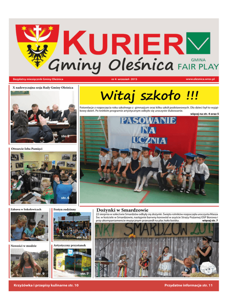 Bezpłatny miesięcznik Gminy Oleśnica nr 4 wrzesień 2015 www.olesnica.wroc.pl Witaj szkoło !!! X nadzwyczajna sesja Rady Gminy Oleśnica Fotorelacje z rozpoczęcia roku szkolnego z gimnazjum oraz kilku szkół podstawowych. Dla dzieci był to wyjątkowy dzień. Po krótkim programie artystycznym odbyło się uroczyste ślubowanie. więcej na str. 4 oraz 5 str. 2 Otwarcie Izba Pamięci str. 6 Zabawa w Sokołowicach Dożynki w Smardzowie Festyn rodzinny 22 sierpnia w sołectwie Smardzów odbyły się dożynki. Święto rolników rozpoczęła uroczysta Masza Św. w kościele w Smardzowie, następnie barwny korowód w asyście Straży Pożarnej OSP Borowa i przy akompaniamencie muzycznym przeszedł na plac koło boiska. więcej str. 7 str. 8 Nowości w modzie str. 12 Artystyczny przystanek str.10 9 str. Krzyżówka i przepisy kulinarne str. 10 str. 7 Przydatne informacje str. 11 2 nr 4 | Wrzesień 2015 www.olesnica.wroc.pl X sesja X nadzwyczajna sesja Rady Gminy Oleśnica W dniu 20 sierpnia 2015 r. odbyła się X nadzwyczajna sesja Rady Gminy Oleśnica, podczas której radni podjęli następujące uchwały: a) w sprawie powołania zespołu opiniującego kandydatów na ławni- ków; b) w sprawie zmiany uchwały nr VII/24/07 Rady Gminy Oleśnica z dnia 20 kwietnia 2007 roku w sprawie określenia zasad udzielania dotacji z budżetu Gminy Oleśnica na prace konserwatorskie, restauratorskie lub roboty budowlane przy zabytkach wpisanych do rejestru zabytków; c) w sprawie przyznania dotacji na prace konserwatorskie, restauratorskie lub roboty budowlane przy zabytku wpisanym do rejestru zabytków: prospekcie organowym wraz z instrumentem muzycznym znajdującym się w kościele p.w. NMP Nieustającej Pomocy w Boguszycach; d) z m i e n i a j ą c a uchwałę Nr II/12/14 w sprawie wieloletniej prognozy finansowej Gminy Oleśnica; e) w sprawie zmian budżetu gminy na 2015 rok. Opracowanie: Agnieszka Kembłowska Inspektor ds. obsługi Rady Gminy X nadzwyczajna sesja Rady Gminy Oleśnica aktualności Pamięć o Powstaniu Warszawskim Smolnej, Wszechświętego i Sokołowic. Na podstawie §11 Rozporządzenia Rady Ministrów z dnia 7 stycznia 2013 r. w sprawie systemów wykrywania skażeń i powiadamiania o ich wystąpieniu oraz właściwości organów w tych sprawach ( Dz. U. 2013 r. poz. 96 ) i zgodnie z zarządzeniem Nr 61/15 Szefa Obrony Cywilnej Gminy Wójta Gminy Oleśnica z dnia 29 sierpnia 2015 r. w sprawie przeprowadzenia treningu systemu ostrzegania i alarmowania w dniu 01 sierpnia 2015 r. o godz.17.00 odbyło się treningowe uruchomienie systemu ostrzegania i alarmowania poprzez włącze- Punktualnie o nakazanej godzinie, donośny i ciągły dźwięk syren dwukrotnie rozdarł powietrze przez regulaminowe 3 minuty w tych miejscowościach, a słyszany był w o wiele dalej położonych okolicach. Kolejne sprawdzenie syren nie syren w jednostkach OSP w Gminie Oleśnica. Ogłoszony został sygnał „Ogłoszenie alarmu” – 3 min. przerywany, modulowany dźwięk syreny i jego odwołanie - 3 min. dźwięk ciągły. Przed godziną rozpoczęcia treningu Komendant Gminny OSP J. Kołomański telefoniczne podał komendę do praktycznego uruchomienia syren alarmowych. Gotowość do ogłoszenia sygnału ogłoszenia alarmu wcześniej potwierdzili strażacy z Ligoty Polskiej, Ligoty Małej, Objazd oszarów dotknietych zagrozeniem Walka z suszą Region Dolnego Śląska w tym i część obszaru naszej gminy znalazł się w strefie zagrożenia suszą. Treningowe uruchomienie syren było także wyrazem hołdu i pamięci dla bohaterów Powstania Warszawskiego, w 71 rocznicę jego wybuchu. Po treningu strażacy, którzy uruchamiali syreny alarmowe złożyli telefoniczne meldunki o przebiegu przedsięwzięcia. Mieszkańcy naszej gminy – rolnicy gospodarujący w Poniatowicach i Ligocie Polskiej złożyli wnioski o ustalenie i ocenę skutków panującej na ich polach suszy. Powołana przez Wójta Gminy Marcina Kasinę komisja przystąpiła do działania. W dniu 03 sierpnia br. komisja w składzie: insp. Łukasz Zaręba, ref. Katarzyna Koren i insp. Jerzy Trzciński w towarzystwie przedstawiciela ODR Oleśnica Jerzego Stańczyka rozpoczęła działania. Wszystkie syren alarmowe będących w gminnym systemie ostrzegania i alarmowania zostały uruchomione i zadziałały one tak jak tego oczekiwano. Meldunek dotyczący przebiegu treningu został złożony pisemnie do Wydziału Spraw Obywatelskich i Zarządzania Kryzysowego Starostwa Powiatowego. Reporterską podróż do Jednostki OSP we Wszechświętem odbył i razem z druhami: Dariuszem Ubą oraz Krzysztofem Grudniem odbył oraz sygnałów wysłuchał: Insp. ds. wojskowych i OC Jerzy Trzciński. fot. Ludmiła M. Trzcińska Nastąpił objazd dotkniętych suszą areałów i na podstawie analizy faktycznego stanu dokonano oszacowania strat. Rolnicy i komisja podpisywali wykonane protokoły, które teraz będą czekały na kolejne decyzje, gdy zostaną uznane warunki pozwalające pomóc rolnikom w określonych formach niskooprocentowanego kredytu, czy zwolnienia z części podatków. W czasie działania komisji kontrowersje rolników Kurier GO wzbudzał fakt, że ubezpieczenia obowiązkowe nie uwzględniają groźnego dla produkcji rolnej czynnika, jakim jest susza. Suche pola rolników w kurzu objechał i zasuszone kłosy oceniał: Insp. Jerzy Trzciński. 3 nr 4 | Wrzesień 2015 www.olesnica.wroc.pl wakacyjne kolonie Ja i Ty – zawsze bezpieczni Kolonia profilaktyczna W dniach od 10 do 19 sierpnia dzieci z terenu gminy Oleśnica przebywały na kolonii edukacyjnej „Ja i Ty – zawsze bezpieczni” w Domu Wczasowym „DORKA” w Ustce. Wyjazd był organizowany dla 59 dzieci z rodzin z problemem alkoholowym i zagrożonych uzależnieniami w ramach realizacji zadania publicznego zawartego w Gminnym Programie Profilaktyki i Rozwiązywania Problemów Alkoholowych oraz w Gminnym Programie Przeciwdzia- łania Narkomanii. Środki przeznaczone na ten cel pochodziły z opłat z