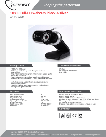 1080P Full-HD Webcam, black & silver A4-PK-920H Cechy produktu Zawartość opakowania - 1080p Full HD Sensor - Still image resolution up to 16 Megapixel (software interpolated) - High-Fidelity digital microphone helps improve speech quality for crystal clear audio - Start making video calls without installing any drivers on Windows XP / Vista / Windows 7 / Mac OS X v10.4.8 and above WebCam CD (software, user manual) User guide - Anti-glare coating avoids reflections and generates vivid images in perfect color - Superior low-light performance provides the best image quality in low-light conditions Logistyka Wymagania systemowe Ilość sztuk w kartonie Objętość kartonu Waga kartonu, kg Wymiary opakowania: Wymiary kartonu DxSxW Kraj pochodzenia Kod kreskowy EAN Kod celny 30 0.07161 6.6 1x1x1 mm 465x350x440 mm CN 4711421896269 8525801990 PC with Pentium 800 MHz or above 256 MB RAM or above At least 165 MB of free hard disk space Windows XP, Vista, Windows 7, Mac OS X v10.4.8 and above Mac computer hardware requirements: G4, G5, iMAC or iBook processors Enclosed image editing software does not support Mac Certyfikaty Copyright © 2009–2017, Gembird Software Ltd. ! " # $ ! "