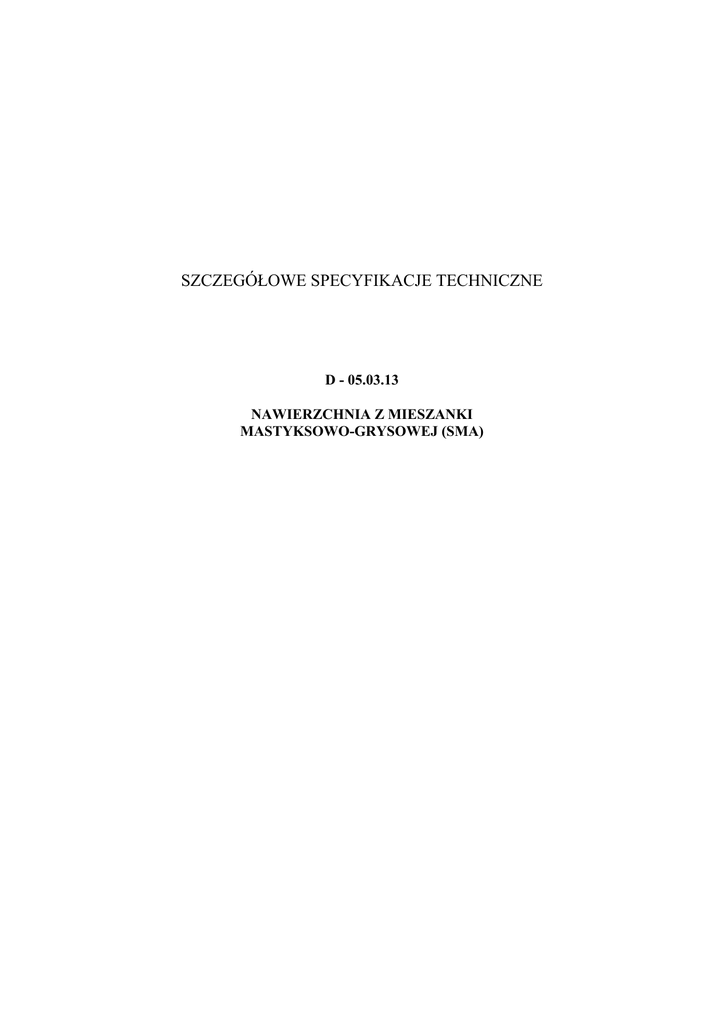 SZCZEGÓŁOWE SPECYFIKACJE TECHNICZNE D - 05.03.13 NAWIERZCHNIA Z MIESZANKI MASTYKSOWO-GRYSOWEJ (SMA) SPIS TREŚCI 1. WSTĘP 2. MATERIAŁY 3. SPRZĘT 4. TRANSPORT 5. WYKONANIE ROBÓT 6. KONTROLA JAKOŚCI ROBÓT 7. OBMIAR ROBÓT 8. ODBIÓR ROBÓT 9. PODSTAWA PŁATNOŚCI 10. PRZEPISY ZWIĄZANE NAJWAśNIEJSZE OZNACZENIA I SKRÓTY OST SST IBDiM CZDP - ogólna specyfikacja techniczna - szczegółowa specyfikacja techniczna - Instytut Badawczy Dróg i Mostów - Centralny Zarząd Dróg Publicznych 1. WSTĘP 1.1. Przedmiot SST Przedmiotem niniejszej szczegółowej specyfikacji technicznej (SST) są wymagania dotyczące wykonania i odbioru robót drogowych dla remontu nawierzchni jezdni ul. Sokolskiej w Sosnowcufragment od wjazdu do AUCHAN do granicy z miastem Będzin . 1.2. Zakres stosowania SST Niniejszą specyfikację naleŜy wykorzystać przy realizacji remontu nawierzchni jezdni ul. Sokolskiej w Sosnowcu- fragment od wjazdu do AUCHAN do granicy z miastem Będzin . 1.3. Zakres robót objętych SST Ustalenia zawarte w niniejszej specyfikacji dotyczą zasad prowadzenia robót związanych z wykonaniem warstwy ścieralnej z mieszanki SMA wg PN-S-96025:2000 [9] Warstwę ścieralną z mieszanki SMA moŜna wykonywać dla dróg o kategorii ruchu od KR1 do KR6 wg „Katalogu typowych konstrukcji nawierzchni podatnych i półsztywnych”, IBDiM - 1997 [15] wg poniŜszego zestawienia: Klasyfikacja dróg wg kategorii ruchu kategoria ruchu KR1 KR2 KR3 KR4 KR5 KR6 liczba osi obliczeniowych 100 kN/pas/dobę ≤ 12 od 13 do 70 od 71 do 335 od 336 do 1000 od 1001 do 2000 > 2000 1.4. Określenia podstawowe 1.4.1. Mieszanka mineralna (MM) - mieszanka kruszywa i wypełniacza mineralnego o określonym składzie i uziarnieniu. 1.4.2. Mieszanka mineralno-asfaltowa (MMA) - mieszanka mineralna z odpowiednią ilością asfaltu lub polimeroasfaltu, wytworzona na gorąco, w określony sposób, spełniająca określone wymagania. 1.4.3. Mieszanka SMA - mieszanka mineralno-asfaltowa o duŜej zawartości zawierająca stabilizator mastyksu. grysów, 1.4.4. Stabilizator mastyksu – dodatek do mieszanki SMA (np. polimer, włókno celulozowe, mineralne), zapobiegający jej rozsegregowaniu. 1.4.5. Środek adhezyjny - substancja powierzchniowo czynna, która poprawia adhezję asfaltu do materiałów mineralnych oraz zwiększa odporność błonki asfaltu na powierzchni kruszywa na odmywanie wodą; moŜe być dodawany do asfaltu lub do kruszywa. 1.4.6. PodłoŜe pod warstwę asfaltową - powierzchnia przygotowana do ułoŜenia warstwy z mieszanki mineralno-asfaltowej. 1.4.7. Asfalt upłynniony - asfalt drogowy upłynniony lotnymi rozpuszczalnikami. 1.4.8. Emulsja asfaltowa kationowa - asfalt drogowy w postaci zawiesiny rozproszonego asfaltu w wodzie. 1.4.9. Próba technologiczna – wytwarzanie mieszanki mineralno-asfaltowej w celu sprawdzenia, czy jej właściwości są zgodne z receptą laboratoryjną. 1.4.10. Odcinek próbny – odcinek warstwy nawierzchni (o długości co najmniej 50m) wykonany w warunkach zbliŜonych do warunków budowy, w celu sprawdzenia pracy sprzętu i uzyskiwanych parametrów technicznych robót. 1.4.11. Kategoria ruchu (KR) – obciąŜenie drogi ruchem samochodowym, wyraŜone w osiach obliczeniowych (100 kN) na obliczeniowy pas ruchu na dobę. 1.4.12. Pozostałe określenia podstawowe są zgodne z odpowiednimi polskimi normami i definicjami podanymi w SST D-M-00.00.00 „Wymagania ogólne”. 1.5. Ogólne wymagania dotyczące robót Ogólne wymagania dotyczące robót podano w SST D-M-00.00.00 „Wymagania ogólne”. 2. MATERIAŁY 2.1. Ogólne wymagania dotyczące materiałów Ogólne wymagania dotyczące materiałów, ich pozyskiwania i składowania, podano w SST D-M-00.00.00 „Wymagania ogólne”. 2.2. Asfalt NaleŜy stosować asfalt drogowy spełniający wymagania określone w PN-C96170:1965 [6]. Rodzaje stosowanych asfaltów drogowych w zaleŜności od kategorii ruchu podano w tablicy 1. 2.3. Polimeroasfalt JeŜeli dokumentacja projektowa lub SST przewiduje stosowanie asfaltu modyfikowanego polimerami, to polimeroasfalt musi spełniać wymagania TWT PAD-97 IBDiM i posiadać aprobatę techniczną. Rodzaje polimeroasfaltów i ich stosowanie w zaleŜności od kategorii ruchu podano w tablicy 1. Tablica 1. Wymagania wobec materiałów do warstwy ścieralnej z mieszanki SMA Lp. Rodzaj materiału nr normy 1 2 3 4 Kruszywo łamane granulowane wg PN-B11112:1996 [2], PN-B-11115:1998[4] a) ze skał magmowych i przeobraŜonych b) ze skał osadowych c) z surowca sztucznego (ŜuŜle pomiedziowe i stalownicze) Kruszywo łamane zwykłe wg PN-B-11112:1996 [ 2 ] świr i mieszanka wg PN-B-11111:1996 [ 1 ] Grys i Ŝwir kruszony z naturalnie rozdrobnionego surowca skalnego wg WT/MK-CZDP 84 [ 12] 5 Piasek wg PN-B-11113:1996 [ 3 ] 6 Wypełniacz mineralny: a) wg PN-S-96504:1961 [ 10 ] 7 8 b) innego pochodzenia wg orzeczenia laboratoryjnego Asfalt drogowy wg PN-C-96170:1965 [ 6 ] Polimeroasfalt drogowy wg TWT -PAD - 97 [ 16 ] Wymagania wobec materiałów w zaleŜności od kategorii ruchu KR 1lub KR 2 KR 3 do KR 6 kl. I, II; gat.1, 2 jw. kl. I, II1); gat.1 jw.2) jw. kl. I; gat.1 kl. I, II; gat.1, 2 - kl. I, II - kl. I, II; gat.1, 2 kl. I; gat.1 gat. 1, 2 - podstawowy, zastępczy pyły z odpylania, popioły lotne D 50, D 70, D 100 DE80 A,B,C, DE1504) A,B,C, DP80 podstawowy D 503), D 70 DE80 A,B,C, DP80 1) tylko pod względem ścieralności w bębnie kulowym, pozostałe cechy jak dla kl. I; gat. 1 2) tylko dolomity kl. I, gat.1 w ilości ≤ 50% m/m we frakcji grysowej w mieszance z innymi kruszywami, w ilości ≤ 100% m/m we frakcji piaskowej oraz kwarcyty i piaskowce bez ograniczenia ilościowego 3) preferowany rodzaj asfaltu 4) głównie do cienkich warstw 2.4. Wypełniacz NaleŜy stosować wypełniacz, spełniający wymagania określone w PN-S96504:1961 dla wypełniacza podstawowego i zastępczego. Przechowywanie wypełniacza powinno być zgodne z PN-S-96504:1961. Dla kategorii ruchu KR 1 lub KR 2 dopuszcza się sto