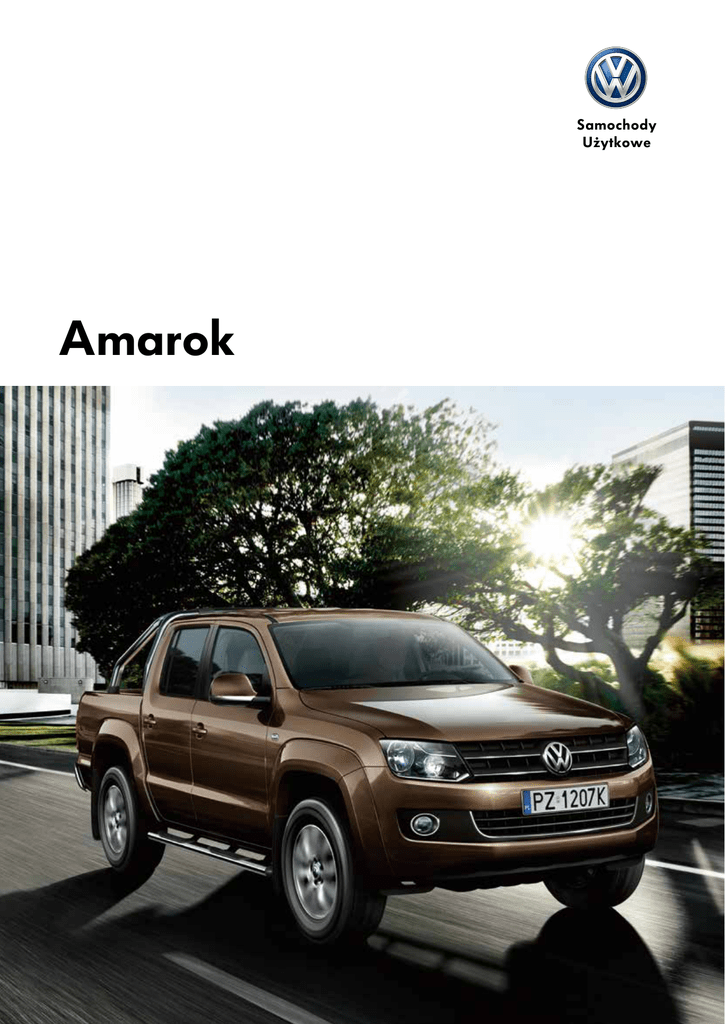 Samochody Użytkowe Amarok 02 – Amarok Życie jest pełne wyzwań. Czy jesteś gotowy? Tam, gdzie inni docierają do kresu swoich możliwości, Amarok z łatwością jedzie dalej. Jak żaden inny pick-up jest połączeniem mobilności, elastyczności i efektywności. Posiada najszerszy przedział ładunkowy w swojej klasie, a z opcjonalnym napędem na wszystkie koła, terenowym ABS i specjalnie dostrojonym programem stabilizacji toru jazdy gwarantuje doskonałe bezpieczeństwo w terenie. Niezwykle wytrzymała konstrukcja ramy nośnej zapewnia stabilność nawet podczas wykonywania najtrudniejszych zadań. Ale także na utwardzonych drogach Amarok spełnia najwyższe wymagania. Wysokiej jakości wnętrze i znakomite właściwości jezdne wyznaczają zupełnie nowy standard w zakresie komfortu i dynamiki. 02Amarok. 28 34 37 39 40 42 44 45 46 Wyposażenie zewnętrzne i obręcze kół. Wyposażenie wnętrza. Silniki, zawieszenie i skrzynia biegów. Amarok z BlueMotion Technology. Bezpieczeństwo i systemy wspomagające. Komfort. Multimedia. Oryginalne akcesoria Volkswagen®. Lakiery i tapicerki. 48 Dane techniczne. 1. wyzwanie: chcesz dotrzeć do pracy na czas. Wybierz skrót prowadzący przez rzekę. Amarok – 03 Rozwiązanie: napęd na wszystkie koła 4MOTION – pełna mobilność w warunkach terenowych. 04 – Amarok 2. wyzwanie: chcesz przewieźć ładunek, a na drodze znajduje się wzniesienie o nachyleniu 12%. Amarok – 05 Rozwiązanie: mogąc holować przyczepę o masie 3,2 t stawisz czoła każdemu wyzwaniu. 06 – Amarok 3. wyzwanie: jedziesz w trudnym terenie i chcesz poczuć, że podróżujesz limuzyną. Amarok – 07 Rozwiązanie: ergonomiczne wnętrze, wysoka jakość wykonania, i niski poziom hałasu wewnątrz zapewniają komfort jazdy. 08 – Amarok 4. wyzwanie: odkryj najodleglejsze zakątki świata, przy niewielu przystankach na tankowanie. Amarok – 09 Rozwiązanie: efektywne technologie napędu i zasięg ponad 1000 km. 10 – Amarok 5. wyzwanie: znajdź Amaroka, który najlepiej do Ciebie pasuje. Wybieraj z wielu wersji i opcji wyposażenia dodatkowego. Amarok – 11 Wytrzymałe i praktyczne rozwiązanie: Amarok z podwójną kabiną. 12 – Amarok Dla Amaroka nawet najtrudniejsze wyzwania są prostymi zadaniami. Amarok z podwójną kabiną został zaprojektowany tak, by zapewnić wysoką wytrzymałość i funkcjonalność – od najszerszego przedziału ładunkowego w swojej klasie poprzez seryjny elektroniczny program stabilizacji toru jazdy, przystosowujący się automatycznie do obciążenia, po wygodne fotele wyłożone odporną tkaniną „Austin” w kolorze antracytowym. W czasie jazdy system radiowy RCD 210 z odtwarzaczem CD czytającym format MP3 zadba o dobry nastrój. Kabina pasażerska Amaroka gwarantuje wygodną jazdę dzięki dużej ilości miejsca na nogi i przestrzeni nad głową. Wiele praktycznych schowków zapewnia dostateczną przestrzeń do przechowywania narzędzi i małych przedmiotów. Amarok z podwójną kabiną posiada seryjnie czarny tylny zderzak. Można zamówić także Amaroka bez zderzaka. W takim przypadku tylną klapę można otworzyć o 180°, co znacznie ułatwia załadunek. Amarok – 13 14 – Amarok Dzięki przedziałowi ładunkowemu o powierzchni 2,52 m2 zapewnia nisko osadzona krawędź podłogi skrzyni ładunkowej Amarok może przewieźć naprawdę dużo. Na życzenie oraz szeroka tylna burta. W przypadku utrudnionego dojazdu istnieje możliwość montażu ochronnej wanny z odpornego do celu rozładunku, wystarczy wyposażyć Amaroka w stały na uszkodzenia tworzywa. Łatwość załadunku i rozładunku lub załączany napęd na cztery koła 4MOTION. Amarok – 15 Niezależnie od rodzaju ładunku, Amarok z podwójną kabiną do mocowania ładunku. Podróż przez bezdroża nie sprawia dzięki wyjątkowo dużej ładowności oraz ponadprzeciętnej mocy, Amarokowi problemów. Specjalne opcjonalne osłony silnika, bez wysiłku, szybko i sprawnie przetransportuje go do celu. skrzyni biegów i zbiornika paliwa zabezpieczają elementy Stabilność i bezpieczeństwo zapewniają cztery uchwyty podwozia przed uszkodzeniami mechanicznymi. 16 – Amarok Materiał, transport i świetni pracownicy – z Amarokiem wszystko W połączeniu ze wzmocnionym zawieszeniem otrzymujemy jest na miejscu. W podwójnej kabinie może podróżować nawet ładowność do 1151 kg. Takie narzędzia, jak młotek czy wiertarka 5 osób. Na najszerszym w tej klasie przedziale ładunkowym można schować pod kanapą drugiego rzędu siedzeń, której bez problemu zmieści się europaleta wstawiona w poprzek. siedzisko jest dzielone w stosunku 1/3 do 2/3 i podnoszone. Amarok – 17 Komfortowe i wszechstronne rozwiązanie: Amarok Trendline. 18 – Amarok Amarok Trendline ma szczególnie dynamiczny wygląd zewnętrzny i funkcjonalne wyposażenie wnętrza. Seryjnie porusza się na 16-calowych obręczach kół ze stopu metali lekkich „Taruma”. Klamki, obudowy lusterek zewnętrznych oraz przedni zderzak z chromowanymi aplikacjami w górnej części wlotów powietrza pokryte są lakierem w kolorze nadwozia. W zderzaku wbudowane są seryjne światła przeciwmgielne. Wewnątrz kabiny fotele wyłożone są tkaniną „Trail” w kolorze antracytowym lub Buffalo. Konsola środkowa z podłokietnikiem oraz praktyczne szuflady na drobne przedmioty pod przednimi fotelami zapewniają dodatkowy komfort podróżowania. Radio RCD 210 z odtwarzaczem CD czytającym format MP3 i czterema głośnikami oraz system klimatyzacji Climatic regulujący temperaturę wewnątrz pojazdu dostępne są w standardzie. Drzwi można otworzyć i zamknąć centralnym zamkiem z pilotem, a szyby w oknach sterowane są elektrycznie. Amarok – 19 Dlaczego czekać na przyjemność do końca pracy? Amarok Kratka za kabiną (wyposażenie dodatkowe) zabezpiecza Trendline zapewni komfort podczas dojazdu do klientów przestrzeń pasażerską, a elektroniczny program stabilizacji oraz wsparcie w miejscu pracy. W
