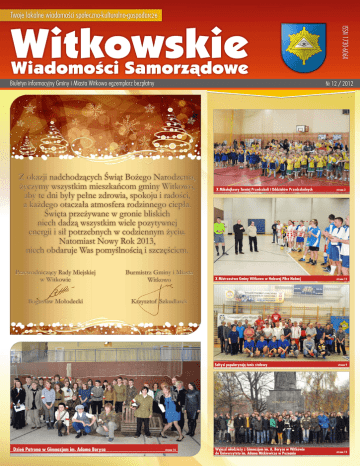 Twoje lokalne wiadomości społeczno-kulturalno-gospodarcze ISSN 1730-606X Biuletyn informacyjny Gminy i Miasta Witkowo egzemplarz bezpłatny Nr 12 / 2012 Z okazji nadchodzących Świąt Bożego Narodzenia, życzymy wszystkim mieszkańcom gminy Witkowo, aby te dni były pełne zdrowia, spokoju i radości, a każdego otaczała atmosfera rodzinnego ciepła. Święta przeżywane w gronie bliskich niech dadzą wszystkim wiele pozytywnej energii i sił potrzebnych w codziennym życiu. Natomiast Nowy Rok 2013, niech obdaruje Was pomyślnością i szczęściem. Przewodniczący Rady Miejskiej w Witkowie Burmistrz Gminy i Miasta Witkowo Bogusław Mołodecki Krzysztof Szkudlarek X Mikołajkowy Turniej Przedszkoli i Oddziałów Przedszkolnych X Mistrzostwa Gminy Witkowo w Halowej Piłce Nożnej Sołtysi popularyzują tenis stołowy Dzień Patrona w Gimnazjum im. Adama Borysa strona 16 Wyjazd młodzieży z Gimnazjum im. A. Borysa w Witkowie do Uniwersytetu im. Adama Mickiewicza w Poznaniu strona 2 strona 15 strona 9 strona 15 X Mikołajkowy Turniej Przedszkoli i Oddziałów Przedszkolnych 9 grudnia w hali widowiskowo-sportowej przy Szkole Podstawowej nr 3 w Witkowie odbył się X Mikołajkowy Turniej Przedszkoli i Oddziałów Przedszkolnych. W turnieju wzięły udział dzieci z placówek oświatowych z Witkowa, Mielżyna, Kołaczkowa oraz Gorzykowa wraz z rodzicami i wychowawcami. Organizatorami imprezy byli: Urząd Gminy i Miasta w Witkowie, placówki oświatowe, Gminna Komisja Profilaktyki i Rozwiązywania Problemów Alkoholowych oraz Ośrodek Kultury, Sportu i Rekreacji w Witkowie. Tegoroczny turniej odbył się pod hasłem „WYCHOWANIE POPRZEZ SPORT EDUKACJĄ JUTRA”. Uroczystość rozpoczęła się przemarszem, w którym zaprezentowali się wszyscy uczestnicy Turnieju. Burmistrz Gminy i Miasta w Witkowie przywitał zebranych, złożył najmłodszym życzenia z okazji Mikołajek oraz życzył wszystkim dobrej zabawy. Turniej rozpoczął występ dzieci z Oddziału Zamiejscowego Przedszkola Miejskiego „Bajka” w Kołaczkowie. Dzieci przedstawiły układ taneczny o nadchodzącej zimie. Po wstępie rozpoczęły się rozgrywki sportowo-rekreacyjne w poszczególnych grupach wiekowych. W każdej z grup uczestniczyć musiał jeden rodzic bądź opiekun. Wspaniałą zabawę rozgrzewała licznie zgromadzona publiczność składająca się z rodziców, dziadków oraz rodzeństwa małych zawodników. Dzieciaki z grupy 3-4 latków rywalizowały w konkurencjach takich jak: sadzenie ziemniaków, szybkobiegacz, tor przeszkód, bieg ze skaczącą piłką z uchwytami, literowanie wyrazu - MOI RODZICE. Przedszkolaki z grupy 5 - latków musiały wykonać m.in.: bieg z przełożeniem szarfy, bieg z plastikowymi butelkami pod materacem, zbierały „grzybki”, skakały na piłce oraz wykonywały bieg rekreacyjny, dopingowali swoje małe pociechy. Dzieci z grup 3-4 latków, 5-latków i 6-latków po wykonaniu wszystkich dyscyplin otrzymały od Mikołaja słodki upominek, który wywołał jeszcze większy uśmiech na ich twarzach. Na zakończenie wszystkie drużyny wraz z opiekunami i rodzicami przeciągały linę. zawodów - pamiątkowe medale. Ponadto każda ze szkół otrzymała talon na zakup sprzętu edukacyjno-sportowego. Zawody okazały się wspaniałym pomysłem na spędzenie niedzielnego popołudnia, nie liczyło się zajęte miejsce, ale ważne było uczestnictwo w poszczególnych konkurencjach. Dzieciaki zmierzyły się z drużyną, w której skład wchodziły: Mikołaje, Śnieżynki, przedstawiciele władzy samorządowej oraz radni. Zwycięzcami okazały się główni bohaterowie Mikołajkowego Turnieju Przedszkoli, czyli dzieci. Jak co roku poszczególne reprezentacje otrzymały z rąk Burmistrza Gminy i Miasta w Witkowie puchar i pamiątkowe dyplomy, a wszyscy uczestnicy Imprezie towarzyszyła także wystawa prac rysunkowych „ MÓJ MIKOŁAJ 2012”, które zostały wykonane przez dzieci z placówek oświatowych z Gminy i Miasta Witkowo. Dziękujemy wszystkim „Mikołajom”, którzy pomagali w organizacji X Mikołajkowego Turnieju Przedszkoli i Oddziałów Przedszkolnych. (S.J.) który polegał na biegu i przekładaniu z kółka hula-hop do drugiego kółka trzech rzeczy piłki, kartonu i kostki z pianki. Najstarsza grupa 6 - latków miała do pokonania zadania takie jak: toczenie bombki pod materacem, wyścig z „workiem Mikołaja”, wyścig na hulajnodze, skoki na piłce oraz wyścig liczb. Rywalizacja była zacięta, wszystkie dyscypliny niosły ze sobą wiele emocji nie tylko wśród uczestników, ale i wśród rodziców, którzy dzielnie pomagali najmłodszym w wykonywaniu zadań oraz głośno Zdjęcia z imprezy znajdą państwo na www.witkowo.pl/galeria 12-2012 str. 2 Z prac Rady Miejskiej w Witkowie Dwudziesta pierwsza sesja Rady Miejskiej W piątek, 30 listopada w sali obrad Urzędu Gminy i Miasta odbyła się dwudziesta pierwsza sesja Rady Miejskiej. Wśród najistotniejszych tematów obrad znalazły się m.in.: informacja o funkcjonowaniu Zespołu Szkolno Przedszkolnego w Mielżynie, nadanie skwerowi przy ul. Park Kościuszki imienia „Stanisława Gaworzewskiego” oraz podjęcie uchwały w sprawie współpracy z Gminą Lądek Zdrój. Przedsesyjne posiedzenia Komisji Rady Miejskiej 26 listopada W dniu 14 listopada br. odbyło się kolejne posiedzenie Komisji Rewizyjnej. Komisja dokonała kontroli sposobu rozpatrywania skarg wpływających do Urzędu Gminy i Miasta oraz kontroli Modelarni. i opłat lokalnych. Zgodnie z procedurą uchwalania budżetu, na przedsesyjnych posiedzeniach Komisja Rolnictwa i Komisja Oświaty zaopiniowały projekt budżetu gminy i miasta na 2013r. Przedsesyjne posiedzenia Komisji Rady Miejskiej 27 listopada W dniach 26, 27 i 28 listopada br., odbyły się przedsesyjne posiedzenia Komisji Rady Miejskiej, dla zaopiniowania projektów uchwał, przygotowanych na listopadową sesję Rady. Ponadto Komisja Oświaty zapoznała się z realizacją zadań oświatowych w 