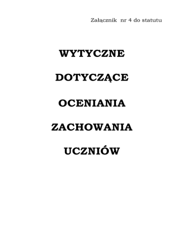 Załącznik nr 4 do statutu WYTYCZNE DOTYCZĄCE OCENIANIA ZACHOWANIA UCZNIÓW Spis treści I. OCENA WZOROWA .................................................................3 II. OCENA BARDZO DOBRA........................................................4 III. OCENA DOBRA ......................................................................5 IV. OCENA POPRAWNA ................................................................8 V. OCENA NIEODPOWIEDNIA ....................................................9 VI. OCENA NAGANNA ................................................................10 2 I. OCENA WZOROWA Uczeń wypełnia wszystkie wskazania dotyczące oceny dobrej i bardzo dobrej, a ponadto: Godnie, z dumą i zaangażowaniem reprezentuje szkołę na zewnątrz Świadomie uczestniczy w życiu religijnym szkoły Wykazuje się ponadprzeciętną kulturą osobistą Sumiennie i systematycznie przygotowuje się do wszystkich zajęć szkolnych na miarę swoich możliwości Chętnie i z zaangażowaniem uczestniczy w zajęciach dodatkowych, kołach przedmiotowych, itp. Swoją postawą prezentuje zasady i wartości religijne, których, gdy zachodzi potrzeba, zawsze jest gotów bronić Uczestniczy w pracach społecznych na rzecz szkoły Uczestniczy w akcjach charytatywnych (w miarę możliwości). Rzetelnie przygotowuje się do konkursów i zawodów szkolnych. Bezinteresownie okazuje pomoc kolegom w szkole i poza nią. Jest koleżeński, otwarty wobec wszystkich społeczności szkolnej Jest uczciwy i szczery w swoim postępowaniu 3 członków II. OCENA BARDZO DOBRA Uczeń wypełnia wszystkie wskazania dotyczące oceny dobrej, a ponadto: Wykazuje się bardzo wysoką kulturą osobistą Przygotowuje się do zajęć szkolnych na miarę swoich możliwości Okazuje szacunek wszystkim nauczycielom i pracownikom szkoły Bierze aktywny udział w zajęciach szkolnych często również pozaszkolnych Uczestniczy w konkursach i zawodach szkolnych. Rozwija swoje zdolności w kołach zainteresowań. odznacza się życzliwością, wysoką kulturą słowa, koleżeńskością, jest bardzo aktywny, zaangażowany na lekcjach, systematyczny, zawsze przygotowany do zajęć przeciwstawia się wszelkim nałogom i różnym rodzajom agresji, uczestniczy w modlitwie szkolnej, uroczystościach, rekolekcjach i mszach św. organizowanych przez szkołę dba o dobre imię szkoły 4 III. OCENA DOBRA 1. ŻYCIE RELIGIJNE SZKOŁY. Uczeń: Bierze udział w uroczystościach religijnych odbywających się w szkole. 2. STOSUNEK DO SYMBOLI RELIGIJNYCH I NARODOWYCH. Uczeń: Odnosi się z szacunkiem do symboli religijnych i narodowych. Kulturalnie zachowuje się podczas uroczystości szkolnych i religijnych. 3. SZACUNEK DLA DRUGIEGO CZŁOWIEKA ORAZ PRZYRODY. Uczeń: Okazuje szacunek pracownikom szkoły, uczniom oraz innym osobom przebywającym na terenie szkoły i poza nią, np.: rodzicom innych uczniów. Szanuje przyrodę. Akceptuje i szanuje wszystkich, a szczególnie nowych członków społeczności szkolnej. Nie znęca się fizycznie ani psychicznie nad innymi ludźmi i zwierzętami. Nie prowokuje bójek, konfliktów ani kłótni. 5 4. OBOWIĄZKI SZKOLNE. Uczeń: Zna regulamin szkoły i przestrzega wszystkich zasad, w szczególny sposób tych, dotyczących powinności i obowiązków ucznia Nie spóźnia się. Dotrzymuje ustalonych terminów. Utrzymuje porządek wokół siebie. Wywiązuje się z obowiązków szkolnych: systematycznie uczęszcza na zajęcia i pozalekcyjne, na bieżąco odrabia zadania domowe, wywiązuje się z dyżurów, jest zawsze przygotowany do zajęć, wszystkie nieobecności ma usprawiedliwione. Nie przeszkadza w zajęciach. Nie zapomina o szkolnym stroju. Nie podpowiada podczas sprawdzianów i kartkówek. Nie odpisuje: zadań domowych, podczas sprawdzianów i kartkówek. 5. KULTURA OSOBISTA. Uczeń: Zna zwroty grzecznościowe i używa ich na co dzień. 6 lekcyjne Nie używa wulgarnych słów. Poproszony o pomoc – w razie możliwości zawsze pomaga. Przestrzega pór posiłków oraz podstawowych zasad zachowania w trakcie ich spożywania (nie rozmawia, nie brudzi). Nie je w nieodpowiednim czasie ani miejscu. Dba o właściwy wygląd: nosi włosy odpowiedniej długości (dziewczęta - włosy związane tak, by nie zasłaniały oczu) (chłopcy – włosy krótko ścięte), dba o odpowiedni wygląd skóry i paznokci (obcięte, niepomalowane), nosi stosowne ozdoby (dozwolone są krótkie kolczyki), nosi ubrania o odpowiedniej długości (mini oraz zbyt krótkie bluzeczki są zakazane). 6. UCZCIWOŚĆ. Uczeń: Jest prawdomówny. Nie kradnie. Potrafi przyznać się do winy i przeprosić. 7. STOSUNEK DO MIENIA SZKOLNEGO I SPOŁECZNEGO. Uczeń: Szanuje mienie szkolne i społeczne. 7 Nie przynosi do szkoły czasopism, gier, filmów, zabawek ani żadnych przedmiotów uważanych za nieodpowiednie. 8. PRZESTRZEGANIE ZASAD WYNIKAJĄCYCH Z REGULAMINU I SYSTEMU OCENIANIA SZKOŁY. Uczeń: Przestrzega regulaminu szkolnego. IV. OCENA POPRAWNA Uczeń nie wypełnia niektórych wskazań dotyczących oceny dobrej, tzn., czasami nie przygotowuje się do zajęć i w rezultacie, w stosunku do swoich możliwości osiąga przeciętne wyniki często spóźnia się na zajęcia ma nieusprawiedliwione godziny nieobecności w szkole unika noszenia stroju szkolnego. odpisuje zadania domowe. nietaktownie zachowuje się w stosunku do innych. nie wykonuje poleceń dyżurnych oraz przewodniczącego. przeszkadza w prowadzeniu zajęć. sporadycznie uczestniczy w konfliktach. wykazuje brak zaangażowania i aktywności podczas zajęć szkolnych 8 jak i w pracach na rzecz szkoły. V. OCENA NIEODPOWIEDNIA Uczeń nie wypełnia wskazań dotyczących oceny dobrej, tzn.: Ma lekceważący stosunek do wartości religijnych i moralnych Notorycznie łamie punkty regulaminu szkolnego Jest wulgarny i agresywny w stosunku do rówieśników i nauczycieli. Stosuje wulgarne i obraźliwe gesty, używa wulgarnego słownictwa, prezentuje wulgarne treści i postawy Wywiera demor