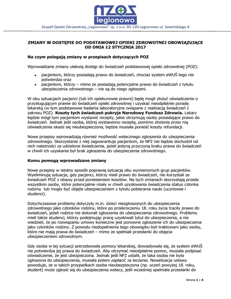 Zespół Opieki Zdrowotnej „Legionowo” sp. z o.o. 05-120 Legionowo ul. Sowińskiego 4 ZMIANY W DOSTĘPIE DO PODSTAWOWEJ OPIEKI ZDROWOTNEJ OBOWIĄZUJĄCE OD DNIA 12 STYCZNIA 2017 Na czym polegają zmiany w przepisach dotyczących POZ Wprowadzane zmiany ułatwią dostęp do świadczeń podstawowej opieki zdrowotnej (POZ): pacjentom, którzy posiadają prawo do świadczeń, chociaż system eWUŚ tego nie potwierdza oraz pacjentom, którzy – mimo że posiadają potencjalne prawo do świadczeń z tytułu ubezpieczenia zdrowotnego – nie są do niego zgłoszeni. W obu sytuacjach pacjenci (lub ich opiekunowie prawni) będę mogli złożyć oświadczenie o przysługującym prawie do świadczeń opieki zdrowotnej i uzyskać nieodpłatnie poradę lekarską (w tym podstawowe badania laboratoryjne związane z realizacją świadczeń z zakresu POZ). Koszty tych świadczeń pokryje Narodowy Fundusz Zdrowia. Lekarz będzie mógł tym pacjentom wystawić recepty, jakie otrzymują osoby posiadające prawo do świadczeń. Jednak jeśli osoba, której wystawiono receptę, pomimo złożenia przez nią oświadczenia okaże się nieubezpieczona, będzie musiała ponieść koszty refundacji. Nowe przepisy wprowadzają również możliwość wstecznego zgłoszenia do ubezpieczenia zdrowotnego. Skorzystanie z niej zagwarantuje pacjentom, że NFZ nie będzie dochodził od nich należności za udzielone świadczenia, jeżeli jedyną przyczyną braku prawa do świadczeń w chwili ich uzyskania był brak zgłoszenia do ubezpieczenia zdrowotnego. Komu pomogą wprowadzane zmiany Nowe przepisy w istotny sposób poprawią sytuację obu wymienionych grup pacjentów. Wyeliminują sytuacje, gdy pacjenci, którzy mieli prawo do świadczeń, nie korzystali ze świadczeń POZ z obawy przed poniesieniem kosztów. Na tych zmianach skorzystają przede wszystkim osoby, które potencjalnie miały w chwili uzyskiwania świadczenia status członka rodziny lub mogły być objęte ubezpieczeniem z tytułu pobierania nauki (uczniowie i studenci). Dotychczasowe problemy dotyczyły m.in. dzieci niezgłoszonych do ubezpieczenia zdrowotnego jako członków rodziny, które po przekroczeniu 18. roku życia traciły prawo do świadczeń, jeżeli rodzice nie dokonali zgłoszenia do ubezpieczenia zdrowotnego. Problemy mieli także studenci, którzy podejmując pracę uzyskiwali tytuł do ubezpieczenia, a nie wiedzieli, że po rozwiązaniu umowy konieczne jest ponowne zgłoszenie ich do ubezpieczenia jako członków rodziny. Z powodu niedopełnienia tego obowiązku byli traktowani jako osoby, które nie mają prawa do świadczeń – mimo że spełniali przesłanki do objęcia ubezpieczeniem zdrowotnym. Gdy osoba w tej sytuacji potrzebowała pomocy lekarskiej, dowiadywała się, że system eWUŚ nie potwierdza jej prawa do świadczeń. Aby otrzymać nieodpłatnie pomoc, musiała podpisać oświadczenie, że jest ubezpieczona. Jednak jeśli NFZ ustalił, że taka osoba nie była zgłoszona do ubezpieczenia, musiała potem zapłacić za leczenie. Nowelizacja ustawy powoduje, że w takich przypadkach osoba nieubezpieczona (np. uczeń powyżej 18. roku, student) może zgłosić się do ubezpieczenia wstecz, jeśli wcześniej spełniała przesłanki do Strona 1 z 4 objęcia ubezpieczeniem jako członek rodziny. Dzięki temu tacy pacjenci będą mogli otrzymać pomoc lekarską, której kosztami nie będą już obarczani. Kiedy nowe przepisy wchodzą w życie Przepisy, które zapewnią obu grupom pacjentów dostęp do podstawowej opieki zdrowotnej, zawiera ustawa z dnia 4 listopada 2016 r. o zmianie ustawy o świadczeniach opieki zdrowotnej finansowanych ze środków publicznych oraz niektórych innych ustaw (Dz.U. poz. 2173). W zakresie zasad dochodzenia roszczeń świadczeń z zakresu podstawowej opieki zdrowotnej ustawa wchodzi w życie 14 dni od dnia ogłoszenia, czyli 12 stycznia 2017 r. Jest to rozwiązanie przejściowe. Od stycznia 2018 roku zamierzamy odejść od zasady ubezpieczenia zdrowotnego. Zmiany systemowe spowodują, że wszyscy pacjenci, którzy będą potrzebowali pomocy medycznej, otrzymają ją na równych zasadach. Kto będzie płacił za wizyty lekarskie Narodowy Fundusz Zdrowia poniesie koszty wizyty u lekarza POZ osoby, która nie ma prawa do świadczeń, jeżeli złożyła ona oświadczenie o przysługującym prawie do świadczeń opieki zdrowotnej (lub system eWUŚ potwierdził jej prawo do świadczeń). Wprowadzone zmiany nie zmieniają sposobu rozliczania świadczeń z zakresu podstawowej opieki zdrowotnej. Narodowy Fundusz Zdrowia sfinansuje te wizyty na dotychczasowych zasadach. Czy pacjenci nadal będą potwierdzali prawo do świadczeń Wprowadzane zmiany nie znoszą obowiązku potwierdzenia prawa do świadczeń i nie przewidują żadnych zmian dotyczących sposobów jego potwierdzania. Od 1 stycznia 2013 r. pacjenci potwierdzają prawo do świadczeń przez: elektroniczne potwierdzenie za pośrednictwem systemu eWUŚ, złożenie oświadczenia o przysługującym prawie do świadczeń opieki zdrowotnej, przedstawienie dokumentu papierowego potwierdzającego prawo do świadczeń. Zgodnie z dotychczasowymi zasadami pacjenci przed uzyskaniem świadczenia muszą potwierdzić prawo do świadczeń opieki zdrowotnej w jeden z wymienionych sposobów, przewidzianych przez ustawę o świadczeniach. Dotychczas, gdy system eWUŚ nie potwierdził prawa do świadczeń, pacjent także mógł złożyć oświadczenie o przysługującym prawie do świadczeń opieki zdrowotnej. Uzyskanie oświadczenia od pacjenta gwarantowało lekarzowi POZ rozliczenie udzielonego świadczenia (w tym zakresie nie nastąpiły zmiany). Wsteczne zgłoszenie do ubezpieczenia Znacząca większość pacjentów, którym system eWUŚ nie potwierdza prawa do świadczeń opieki zdrowotnej, to osoby, które mają potencjalne prawo do świadczeń z tytułu Strona 2 z 4 ubezpieczenia, lecz nie zostały zgłoszone do ubezpieczenia zdrowotnego. Dotyczy to przede wszy
