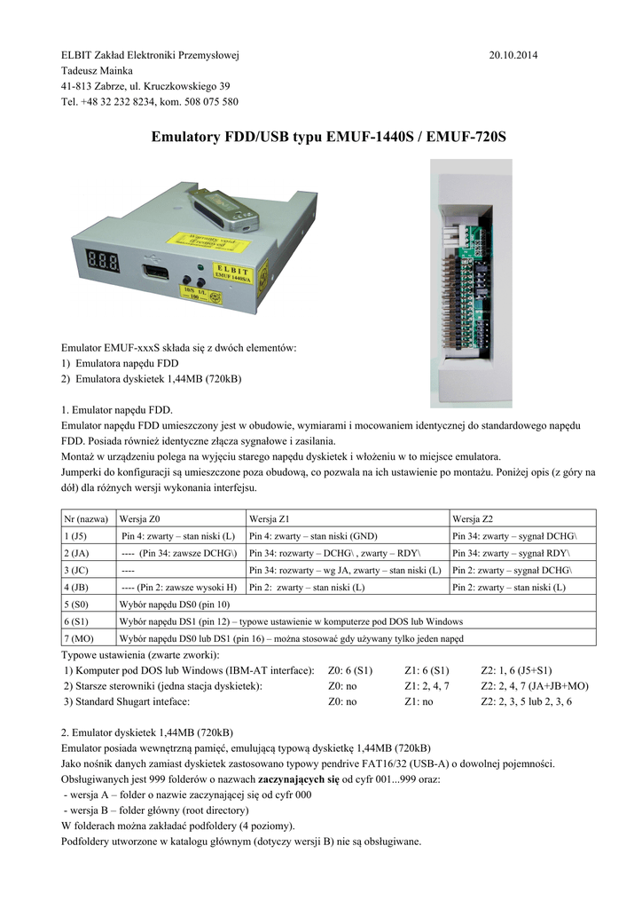 ELBIT Zakład Elektroniki Przemysłowej Tadeusz Mainka 41-813 Zabrze, ul. Kruczkowskiego 39 Tel. +48 32 232 8234, kom. 508 075 580 20.10.2014 Emulatory FDD/USB typu EMUF-1440S / EMUF-720S Emulator EMUF-xxxS składa się z dwóch elementów: 1) Emulatora napędu FDD 2) Emulatora dyskietek 1,44MB (720kB) 1. Emulator napędu FDD. Emulator napędu FDD umieszczony jest w obudowie, wymiarami i mocowaniem identycznej do standardowego napędu FDD. Posiada również identyczne złącza sygnałowe i zasilania. Montaż w urządzeniu polega na wyjęciu starego napędu dyskietek i włożeniu w to miejsce emulatora. Jumperki do konfiguracji są umieszczone poza obudową, co pozwala na ich ustawienie po montażu. Poniżej opis (z góry na dół) dla różnych wersji wykonania interfejsu. Nr (nazwa) Wersja Z0 Wersja Z1 Wersja Z2 1 (J5) Pin 4: zwarty – stan niski (L) Pin 4: zwarty – stan niski (GND) Pin 34: zwarty – sygnał DCHG\ 2 (JA) ---- (Pin 34: zawsze DCHG\) Pin 34: rozwarty – DCHG\ , zwarty – RDY\ Pin 34: zwarty – sygnał RDY\ 3 (JC) ---- Pin 34: rozwarty – wg JA, zwarty – stan niski (L) Pin 2: zwarty – sygnał DCHG\ 4 (JB) ---- (Pin 2: zawsze wysoki H) Pin 2: zwarty – stan niski (L) Pin 2: zwarty – stan niski (L) 5 (S0) Wybór napędu DS0 (pin 10) 6 (S1) Wybór napędu DS1 (pin 12) – typowe ustawienie w komputerze pod DOS lub Windows 7 (MO) Wybór napędu DS0 lub DS1 (pin 16) – można stosować gdy używany tylko jeden napęd Typowe ustawienia (zwarte zworki): 1) Komputer pod DOS lub Windows (IBM-AT interface): 2) Starsze sterowniki (jedna stacja dyskietek): 3) Standard Shugart inteface: Z0: 6 (S1) Z0: no Z0: no Z1: 6 (S1) Z1: 2, 4, 7 Z1: no Z2: 1, 6 (J5+S1) Z2: 2, 4, 7 (JA+JB+MO) Z2: 2, 3, 5 lub 2, 3, 6 2. Emulator dyskietek 1,44MB (720kB) Emulator posiada wewnętrzną pamięć, emulującą typową dyskietkę 1,44MB (720kB) Jako nośnik danych zamiast dyskietek zastosowano typowy pendrive FAT16/32 (USB-A) o dowolnej pojemności. Obsługiwanych jest 999 folderów o nazwach zaczynających się od cyfr 001...999 oraz: - wersja A – folder o nazwie zaczynającej się od cyfr 000 - wersja B – folder główny (root directory) W folderach można zakładać podfoldery (4 poziomy). Podfoldery utworzone w katalogu głównym (dotyczy wersji B) nie są obsługiwane. EMUF-1440S (EMUF-720S) - instrukcja obsługi. Uwagi ogólne. Trzycyfrowy wyświetlacz pokazuje aktualnie wybrany folder na pendrive. Numery 001…999 odnoszą się do folderów o odpowiednich nazwach, natomiast numer 000 odnosi się do: – wersja A – folderu o nazwie 000 – wersja B – folderu głównego (root directory) Nazwa folderu musi się zaczynać trzycyfrowym numerem, który odpowiada numerowi wybranemu na emulatorze.. Przykładowe nazwy folderów: 001-dysk1, 002Tadek, 003programy różne, itd. Dwa przyciski spełniają dwie różne funkcje: 1) Przed włożeniem pendriva do gniazda – służą do wyboru folderu. Przycisk prawy 1/L zmienia cyfrę jednostek, przycisk lewy 10/S zmienia cyfrę dziesiątek. Zmiana setek następuje po naciśnięciu równocześnie obu przycisków. 2) Po włożeniu pendriva do gniazda – służą do uaktywnienia odczytu i zapisu pomiędzy pendrive'm a pamięcią wewnętrzną emulatora. Przycisk prawy 1/L (Load) przesyła zawartość wybranego folderu do pamięci wewnętrznej emulatora, przycisk lewy 10/S (Save) przesyła zawartość pamięci wewnętrznej do wybranego folderu na pendrive. Sekwencja odczytu (z pendrive'a do pamięci wewnętrznej emulatora). 1. Przed włożeniem pendrive'a do gniazda wybrać przyciskami żądany folder. 2. Włożyć pendrive do gniazda (nic się nie dzieje). 3. Nacisnąć prawy przycisk 1/L (Load) - spowoduje to wykasowanie poprzedniej zawartości pamięci wewnętrznej emulatora. Na wyświetlaczu pojawi się napis „d0”, trwający 1..20 sek. W tym czasie pliki z pendrive są przesyłane do pamięci wewnętrznej emulatora. Po tym czasie na wyświetlaczu przywrócony zostanie numer folderu. Uwaga dla wersji B: jeśli wybrany był numer 000 (katalog główny) – nie są kopiowane foldery. 4. Teraz można wczytać do pamięci obrabiarki żądany program, uaktywniając odczyt dyskietki. 5. Jeśli w folderze było zapisanych więcej plików, niż dopuszcza dyskietka – nie są one dostępne. 6. Można teraz wyjąć pendrive z gniazda. Wczytane pliki są przechowywane w pamięci wewnętrznej emulatora (również po wyłączeniu zasilania). Sekwencja zapisu (z pamięci wewnętrznej emulatora do pendrive'a). 1. Zapis programów “na dyskietce” (czyli w pamięci wewnętrznej emulatora) może być wykonywany bez włożonego pendrive'a. 2. Przed włożeniem pendrive'a do gniazda przyciskami wybrać żądany folder. Jeśli folderu o ustawionym numerze nie było – zostanie on utworzony automatycznie podczas zapisu. 3. Włożyć pendrive do gniazda (nic się nie dzieje). 4. Nacisnąć lewy przycisk 10/S (Save) - spowoduje to wykasowanie poprzedniej zawartości wybranego folderu na pendrivie. Uwaga dla wersji B: jeśli wybrany był numer 000 – zostanie wykasowany folder główny. Na wyświetlaczu pojawi się napis ‘d2’. Zawartość pamięci wewnętrznej emulatora jest kopiowana do wybranego folderu. Jeśli folder był utworzony w emulatorze, nie będzie posiadał daty utworzenia lub modyfikacji. Ważne uwagi: 1. Sterownik cały czas widzi “włożoną dyskietkę”, nawet bez włożonego pendrive'a. 2. W folderach 000...999 (001...999 dla wersji B) można zakładać 4 poziomy podfolderów. 3. Dla wersji B nie są obsługiwane podfoldery w folderze głównym (root directory). 4. Zaleca się wkładanie pendrive'a do gniazda tylko na czas dokonywania operacji odczytu lub zapisu. Zabezpiecza to przed konsekwencjami przypadkowego naciśnięcia któregoś przycisku. EMUF-S – TRYB “OBRAZ DYSKIETKI” Tryb “Obraz dyskietki” przeznaczony jest dla urządzeń, w których programy są zapisywane na dyskietce w trybie “NON FAT”. Taka dyskietka ni