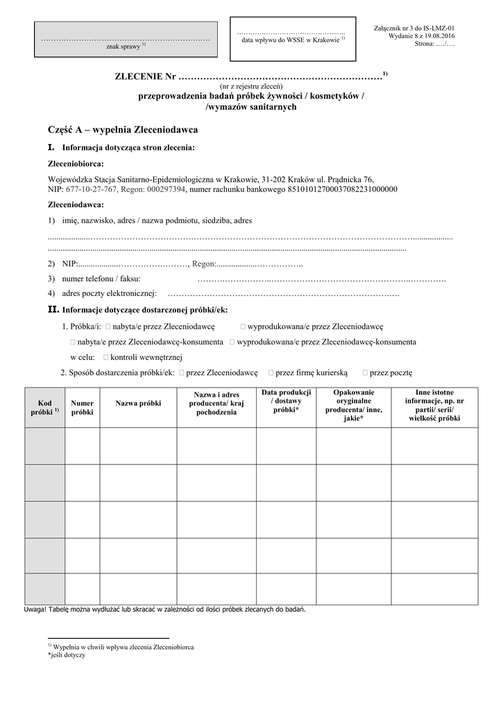 Zał ……………………………………..….. data wpływu do WSSE w Krakowie 1) …………………………………………………………. znak sprawy 1) Załącznik nr 3 do IS-LMZ-01 Wydanie 8 z 19.08.2016 Strona: .…/…. ZLECENIE Nr …………………………………………………………1) (nr z rejestru zleceń) przeprowadzenia badań próbek żywności / kosmetyków / /wymazów sanitarnych Część A – wypełnia Zleceniodawca I. Informacja dotycząca stron zlecenia: Zleceniobiorca: Wojewódzka Stacja Sanitarno-Epidemiologiczna w Krakowie, 31-202 Kraków ul. Prądnicka 76, NIP: 677-10-27-767, Regon: 000297394, numer rachunku bankowego 85101012700037082231000000 Zleceniodawca: 1) imię, nazwisko, adres / nazwa podmiotu, siedziba, adres ....................……………………………….……………………………………………………………………................... .......................................................................................................................................................................... 2) NIP:...................…………….………, Regon:...................…………….. ……….……………..…………………………………………..…………. 3) numer telefonu / faksu: 4) adres poczty elektronicznej: …………………………………………………………………….…. II. Informacje dotyczące dostarczonej próbki/ek: 1. Próbka/i: nabyta/e przez Zleceniodawcę wyprodukowana/e przez Zleceniodawcę nabyta/e przez Zleceniodawcę-konsumenta wyprodukowana/e przez Zleceniodawcę-konsumenta w celu: kontroli wewnętrznej 2. Sposób dostarczenia próbki/ek: przez Zleceniodawcę Kod próbki 1) Numer próbki Nazwa próbki Nazwa i adres producenta/ kraj pochodzenia przez firmę kurierską Data produkcji / dostawy próbki* Uwaga! Tabelę można wydłużać lub skracać w zależności od ilości próbek zlecanych do badań. Wypełnia w chwili wpływu zlecenia Zleceniobiorca *jeśli dotyczy 1) przez pocztę Opakowanie oryginalne producenta/ inne, jakie* Inne istotne informacje, np. nr partii/ serii/ wielkość próbki Załącznik nr 3 do IS-LMZ-01 Wydanie 8 z 19.08.2016 Strona: .…/…. III. Zakres badań: Lp 1. Badane cechy Badane obiekty Badanie organoleptyczne Produkty spożywcze Obecność Salmonella spp. „A” Kawa ,herbata, kakao, herbatki owocowe i ziołowe, koncentraty spożywcze, mięso i przetwory mięsne, mleko i przetwory mleczne, owoce i przetwory owocowe, warzywa i przetwory warzywne, ryby, owoce morza i ich przetwory, wyroby cukiernicze i ciastkarskie,zioła i przyprawy, środki spożywcze specjalnego przeznaczenia żywieniowego, suplementy diety, tłuszcze zwierzęce i roślinne, zboża i przetwory zbożowe, wyroby garmażeryjne i kulinarne, produkty jajeczne Produkty spożywcze 2. Obecność DNA specyficznego dla Salmonella spp. 3. 4. 5. 6. Liczba przypuszczalnych Bacillus cereus „A” Obecność Listeria monocytogenes „A” Obecność Listeria monocytogenes Liczba Listeria monocytogenes „A” 7. 8. 9. 10. Liczba Listeria monocytogenes PB-LMZ-01 wyd. 2 z dn. 13.01.20142) Potwierdzenie wyników dodatnich wg PN-EN ISO 6579:2003 PN-EN ISO 7932:2005 PN-EN ISO 11290-1: 1999 +A1:2005 PB-LMZ-09 wyd. 2 z dn. 13.01.20142) PN-EN ISO 112902:2000 +A1:2005+Ap1:2006 +Ap2:2007 Obecność przypuszczalnie chorobotw. Yersinia enterocolitica „A” Mięso i przetwory mięsne, warzywa i przetwory warzywne, mleko i przetwory mleczne, wyroby garmażeryjne i kulinarne Liczba drożdży Produkty spożywcze o aktywności wody wyższej niż 0,95 PN-ISO 21527-1: 2009 Liczba drożdży „A” Środki spożywcze o aktywności wody niższej lub równej 0,95: przetwory owocowe, zioła i przyprawy, owoce suszone, zboża i przetwory zbożowe, wyroby cukiernicze i ciastkarskie, mleko w proszku, kawa instant, kakao, herbata, suplementy diety w proszku, koncentraty spożywcze, syropy, tłuszcze zwierzęce i roślinne, grzyby suszone, orzechy włoskie Środki spożywcze o aktywności. wody wyższej niż 0,95: napoje niegazowane, mięso i przetwory mięsne, mleko i przetwory mleczne, ryby, owoce morza i ich przetwory, warzywa i przetwory warzywne, owoce i przetwory owocowe, suplementy diety Środki spożywcze o aktywności wody niższej lub równej 0,95: przetwory owocowe, zioła i przyprawy, owoce suszone, zboża i przetwory zbożowe, wyroby cukiernicze i ciastkarskie, mleko w proszku, kawa instant, kakao, herbata, suplementy diety w proszku, koncentraty spożywcze, syropy, tłuszcze zwierzęce i roślinne, grzyby suszone, orzechy włoskie Środki spożywcze specjalnego przeznaczenia żywieniowego, mleko i przetwory mleczne, napoje niegazowane, zioła i przyprawy, zboża i przetwory zbożowe, mięso i przetwory mięsne, herbata, kakao, tłuszcze zwierzęce i roślinne, wyroby garmażeryjne i kulinarne, koncentraty spożywcze, wiórki kokosowe, wyroby cukiernicze i ciastkarskie, warzywa i przetwory warzywne, PN-ISO 21527-2: 2009 mleko i przetwory mleczne, napoje niegazowane, warzywa i przetwory warzywne, mięso i przetwory mięsne, wyroby garmażeryjne i kulinarne, zboża i przetwory zbożowe, wyroby cukiernicze i ciastkarskie, ryby, owoce morza i ich przetwory, zioła i przyprawy, koncentraty spożywcze, tłuszcze zwierzęce i roślinne, kakao, herbata, wiórki kokosowe Mięso i przetwory mięsne, mleko i przetwory mleczne, tłuszcze roślinne i zwierzęce, warzywa i przetwory warzywne, suplementy diety, zboża i przetwory zbożowe, napoje niegazowane, koncentraty spożywcze, kawa, herbata, zioła i przyprawy, grzyby suszone, wyroby garmażeryjne i kulinarne, owoce i przetwory owocowe, ryby, owoce morza i ich przetwory, wyroby cukiernicze i ciastkarskie Mięso i przetwory mięsne, mleko i przetwory mleczne, tłuszcze roślinne i zwierzęce, warzywa i przetwory warzywne, suplementy diety, zboża i przetwory zbożowe, napoje niegazowane, koncentraty spożywcze, kawa, 