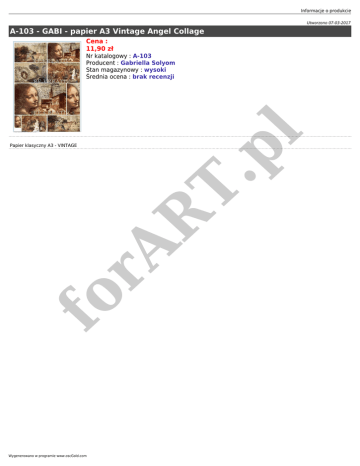 Informacje o produkcie Utworzono 07-03-2017 A-103 - GABI - papier A3 Vintage Angel Collage Cena : 11,90 zł fo rA R Papier klasyczny A3 - VINTAGE T. pl Nr katalogowy : A-103 Producent : Gabriella Solyom Stan magazynowy : wysoki Średnia ocena : brak recenzji Wygenerowano w programie www.oscGold.com