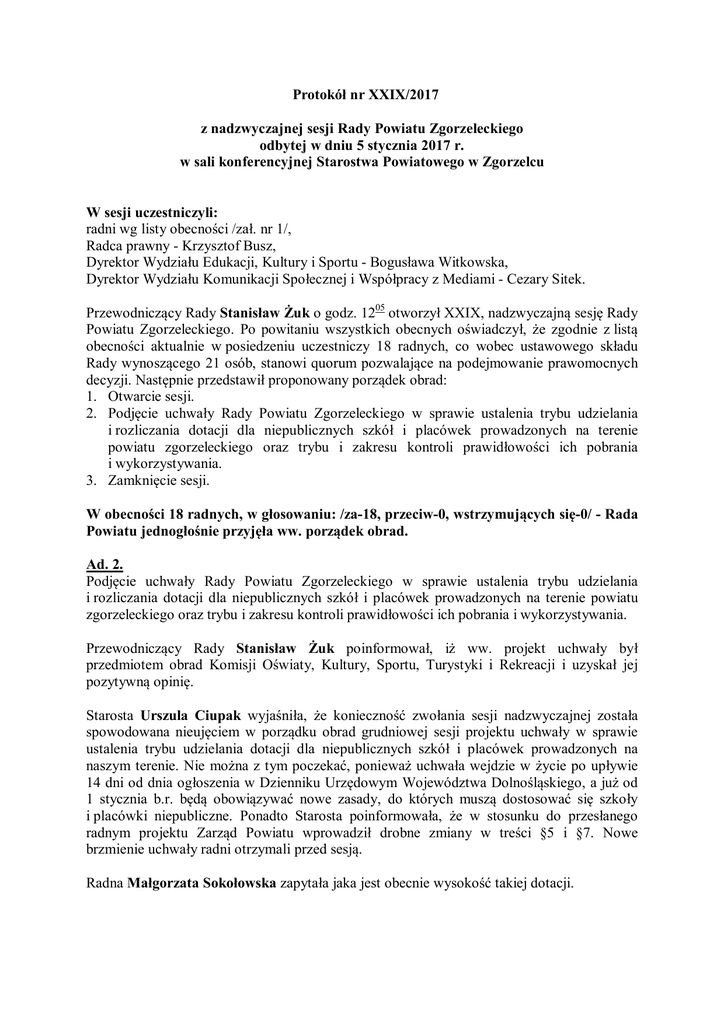 Protokół nr XXIX/2017 z nadzwyczajnej sesji Rady Powiatu Zgorzeleckiego odbytej w dniu 5 stycznia 2017 r. w sali konferencyjnej Starostwa Powiatowego w Zgorzelcu W sesji uczestniczyli: radni wg listy obecności /zał. nr 1/, Radca prawny - Krzysztof Busz, Dyrektor Wydziału Edukacji, Kultury i Sportu - Bogusława Witkowska, Dyrektor Wydziału Komunikacji Społecznej i Współpracy z Mediami - Cezary Sitek. Przewodniczący Rady Stanisław Żuk o godz. 1205 otworzył XXIX, nadzwyczajną sesję Rady Powiatu Zgorzeleckiego. Po powitaniu wszystkich obecnych oświadczył, że zgodnie z listą obecności aktualnie w posiedzeniu uczestniczy 18 radnych, co wobec ustawowego składu Rady wynoszącego 21 osób, stanowi quorum pozwalające na podejmowanie prawomocnych decyzji. Następnie przedstawił proponowany porządek obrad: 1. Otwarcie sesji. 2. Podjęcie uchwały Rady Powiatu Zgorzeleckiego w sprawie ustalenia trybu udzielania i rozliczania dotacji dla niepublicznych szkół i placówek prowadzonych na terenie powiatu zgorzeleckiego oraz trybu i zakresu kontroli prawidłowości ich pobrania i wykorzystywania. 3. Zamknięcie sesji. W obecności 18 radnych, w głosowaniu: /za-18, przeciw-0, wstrzymujących się-0/ - Rada Powiatu jednogłośnie przyjęła ww. porządek obrad. Ad. 2. Podjęcie uchwały Rady Powiatu Zgorzeleckiego w sprawie ustalenia trybu udzielania i rozliczania dotacji dla niepublicznych szkół i placówek prowadzonych na terenie powiatu zgorzeleckiego oraz trybu i zakresu kontroli prawidłowości ich pobrania i wykorzystywania. Przewodniczący Rady Stanisław Żuk poinformował, iż ww. projekt uchwały był przedmiotem obrad Komisji Oświaty, Kultury, Sportu, Turystyki i Rekreacji i uzyskał jej pozytywną opinię. Starosta Urszula Ciupak wyjaśniła, że konieczność zwołania sesji nadzwyczajnej została spowodowana nieujęciem w porządku obrad grudniowej sesji projektu uchwały w sprawie ustalenia trybu udzielania dotacji dla niepublicznych szkół i placówek prowadzonych na naszym terenie. Nie można z tym poczekać, ponieważ uchwała wejdzie w życie po upływie 14 dni od dnia ogłoszenia w Dzienniku Urzędowym Województwa Dolnośląskiego, a już od 1 stycznia b.r. będą obowiązywać nowe zasady, do których muszą dostosować się szkoły i placówki niepubliczne. Ponadto Starosta poinformowała, że w stosunku do przesłanego radnym projektu Zarząd Powiatu wprowadził drobne zmiany w treści §5 i §7. Nowe brzmienie uchwały radni otrzymali przed sesją. Radna Małgorzata Sokołowska zapytała jaka jest obecnie wysokość takiej dotacji. Dyrektor Wydziału Edukacji Bogusława Witkowska wyjaśniła, że nie można mówić o konkretnej kwocie dotacji, bo to wynika z typu kształcenia. Kwoty udzielanych dotacji są zróżnicowane w zależności od kierunku kształcenia lub typu szkoły. Do tej pory wysokość dotacji była ustalana w oparciu o koszty utrzymania danych typów szkół w powiatach ościennych. Obecnie przedłożona uchwała nie zmienia tego co było, rozszerza jedynie katalog możliwości kontrolnych organu dotującego poprzez uszczegółowienie sposobu przeprowadzania kontroli. Obecnie do ustalenia wysokości dotacji służy aplikacja z wykazami szkół gdzie można wyszukać najbliższy powiat lub uzyskać informację o średniej wojewódzkiej. Informacje dotyczące wysokości dotacji udzielanych szkołom i placówkom niepublicznym funkcjonującym na terenie powiatu zgorzeleckiego były zawarte w raporcie prezentowanym na sesji w listopadzie ubiegłego roku. Dotacja, którą otrzymują szkoły niepubliczne w miesiącu styczniu jest ustalana w oparciu o dane z grudnia, a więc kwoty nie ulegną zmianie. Od stycznia b.r. zmieniają się tylko kwestie dotyczące przeprowadzania kontroli. Dla organów prowadzących szkoły niepubliczne wprowadzony został obowiązek przedstawiania rozliczeń kwartalnych i rozliczenia rocznego zgodnie z klasyfikacją budżetową, czego do tej pory nie było. Wobec braku innych uwag Przewodniczący Rady Stanisław Żuk poddał pod głosowanie uchwałę nr XXIX/185/2017 Rady Powiatu Zgorzeleckiego z dnia 5 stycznia 2017 r. w sprawie ustalenia trybu udzielania i rozliczania dotacji dla niepublicznych szkół i placówek prowadzonych na terenie powiatu zgorzeleckiego oraz trybu i zakresu kontroli prawidłowości ich pobrania i wykorzystywania. W obecności 18 radnych, w głosowaniu: /za-18, przeciw-0, wstrzymujących się-0/ - Rada Powiatu jednogłośnie podjęła uchwałę nr XXIX/185/2017. /Uchwała stanowi załącznik nr 2 do niniejszego protokołu/. Ad. 3. Zamknięcie sesji. W związku z wyczerpaniem porządku obrad Przewodniczący Rady Stanisław Żuk o godz. 1212 zamknął obrady XXIX, nadzwyczajnej sesji Rady Powiatu Zgorzeleckiego. Protokołowała: Przewodniczył: 2