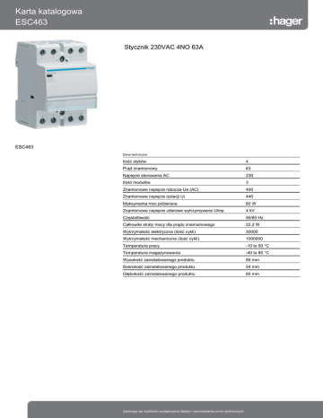 Karta katalogowa ESC463 Stycznik 230VAC 4NO 63A ESC463 Dane techniczne Ilość styków 4 Prąd znamionowy 63 Napięcie sterowania AC 230 Ilość modułów 3 Znamionowe napięcie robocze Ue (AC) 400 Znamionowe napięcie izolacji Ui 440 Maksymalna moc pobierana 60 W Znamionowe napięcie udarowe wytrzymywane Uimp 4 kV Częstotliwość 50/60 Hz Całkowite straty mocy dla prądu znamionowego 22,2 W Wytrzymałość elektryczna (ilość cykli) 30000 Wytrzymałość mechaniczna (ilość cykli) 1000000 Temperatura pracy -10 to 50 °C Temperatura magazynowania -40 to 80 °C Wysokość zainstalowanego produktu 85 mm Szerokość zainstalowanego produktu 54 mm Głębokość zainstalowanego produktu 60 mm Zastrzega się możliwość występowania błędów i wprowadzenia zmian technicznych.